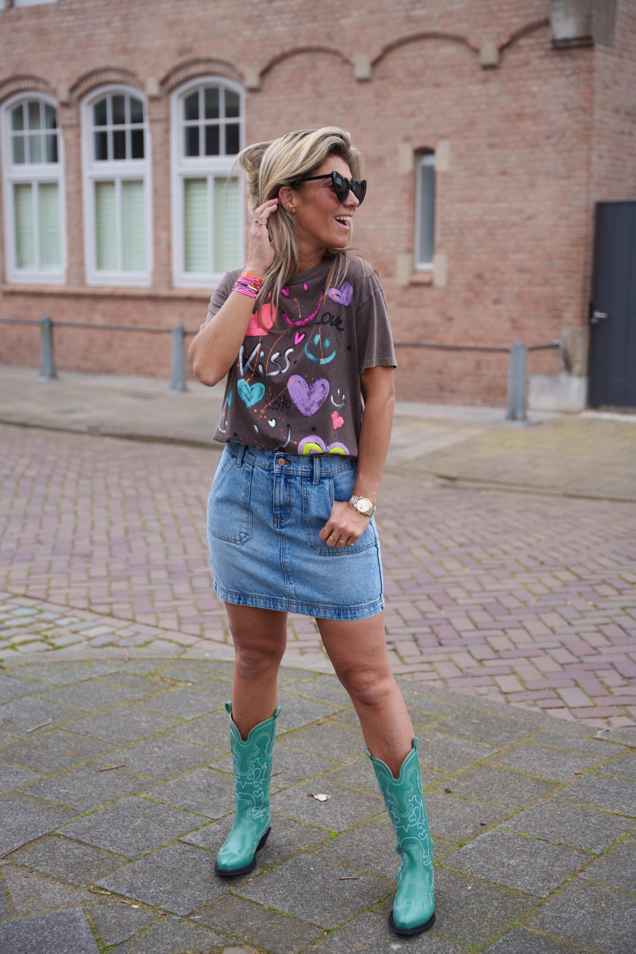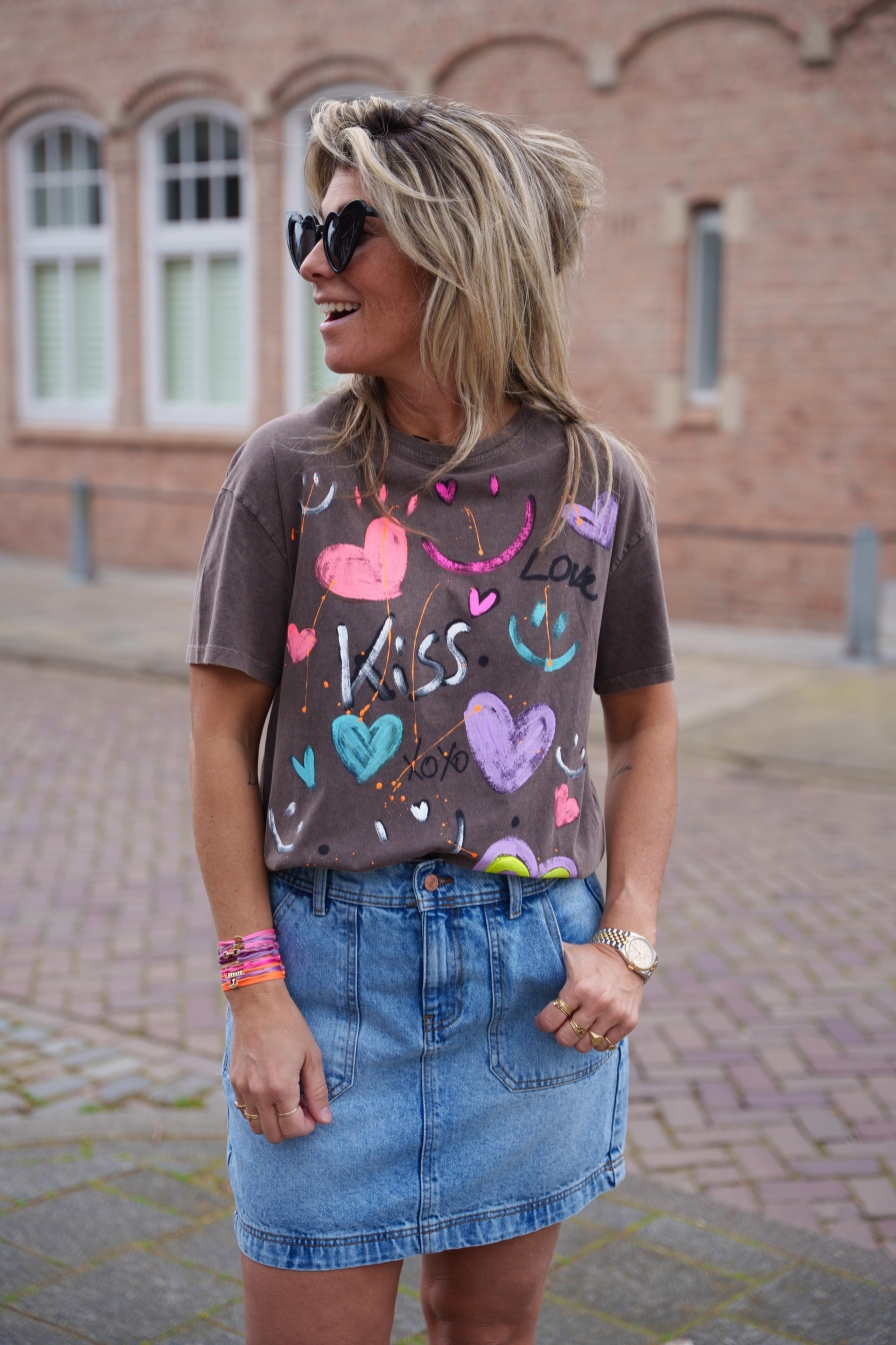 Handmade Edition onesize Shirt gemaakt van 100% katoen, omarmt de spirit van Ibiza met felle kleuren in KISS en XoXo en LOVE! Handmade dus met de hand wassen is aan te raden voor een langdurige kwaliteit.