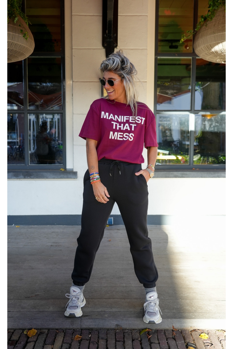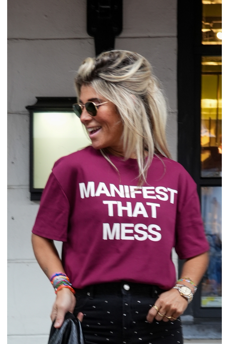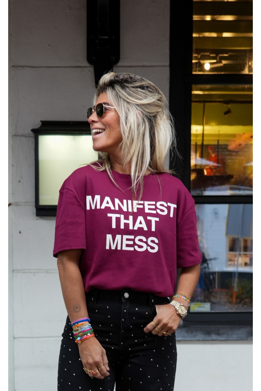Shirt Manifest – voor een statement look! Gemaakt van 70% katoen, biedt dit Onesize model comfort en stijl tot en met maat L/XL. Op de borst staat de krachtige tekst "MANIFEST THAT MESS!" – een perfecte keuze om jouw vibe te laten zien!