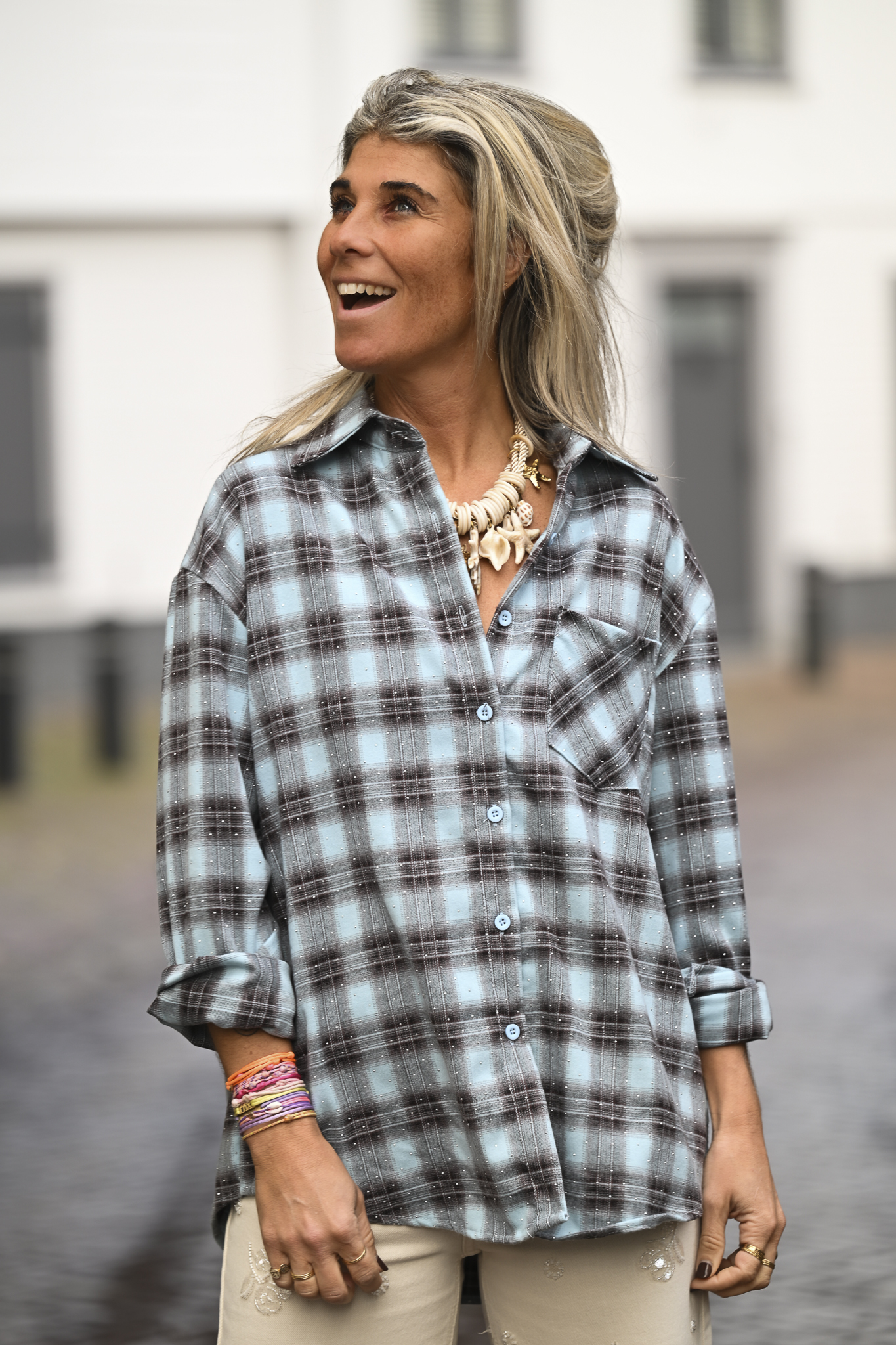 Deze onesize blouse met subtiele sparkles is aan de achterkant langer dan de voorkant, waardoor hij mooi over de billen valt. Dit loose fit model draag je tot en met maat L/XL.