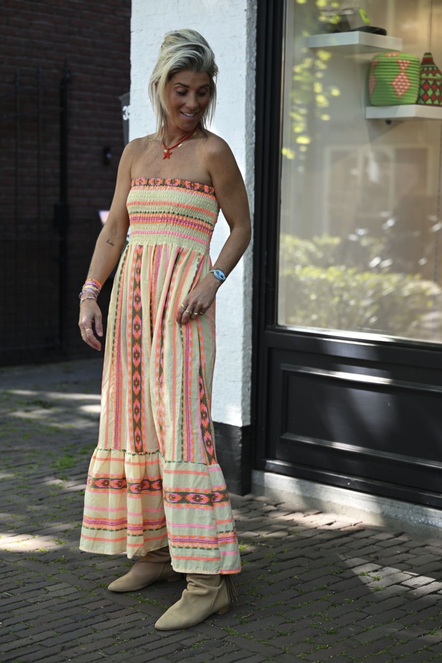 Strapless Dress Meau is gemaakt van 100% katoen. De top heeft veel stretch en sluit mooi aan, geschikt voor elke cupmaat. De lus op de borst kun je strikken of als halter in de nek dragen. Dankzij de stretchy top en pasvorm draag je deze jurk van maat S t/m XL/42.