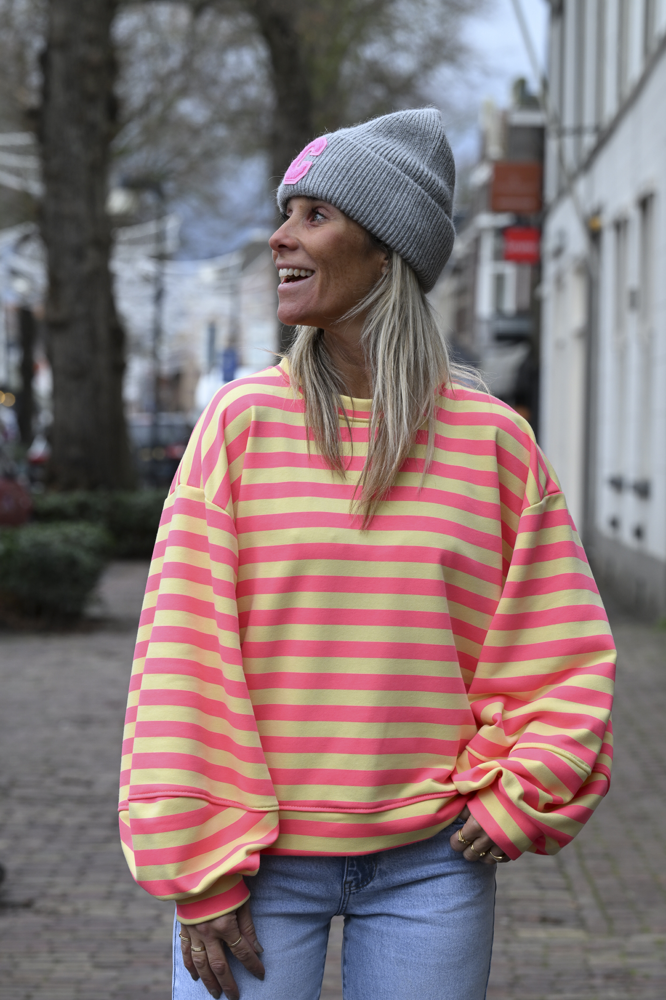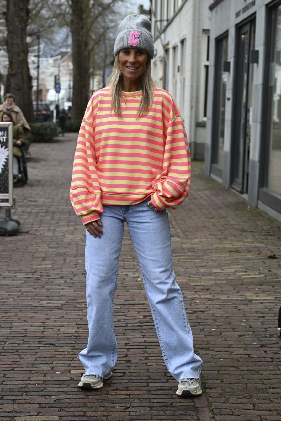 Wat een print op deze onesize sweater met pofmouwen! Strepen, stripes, rayures – noem het zoals je wilt, maar deze sweater (65% katoen) pimt alles naar een next level. Draagbaar tot maat L/XL.
