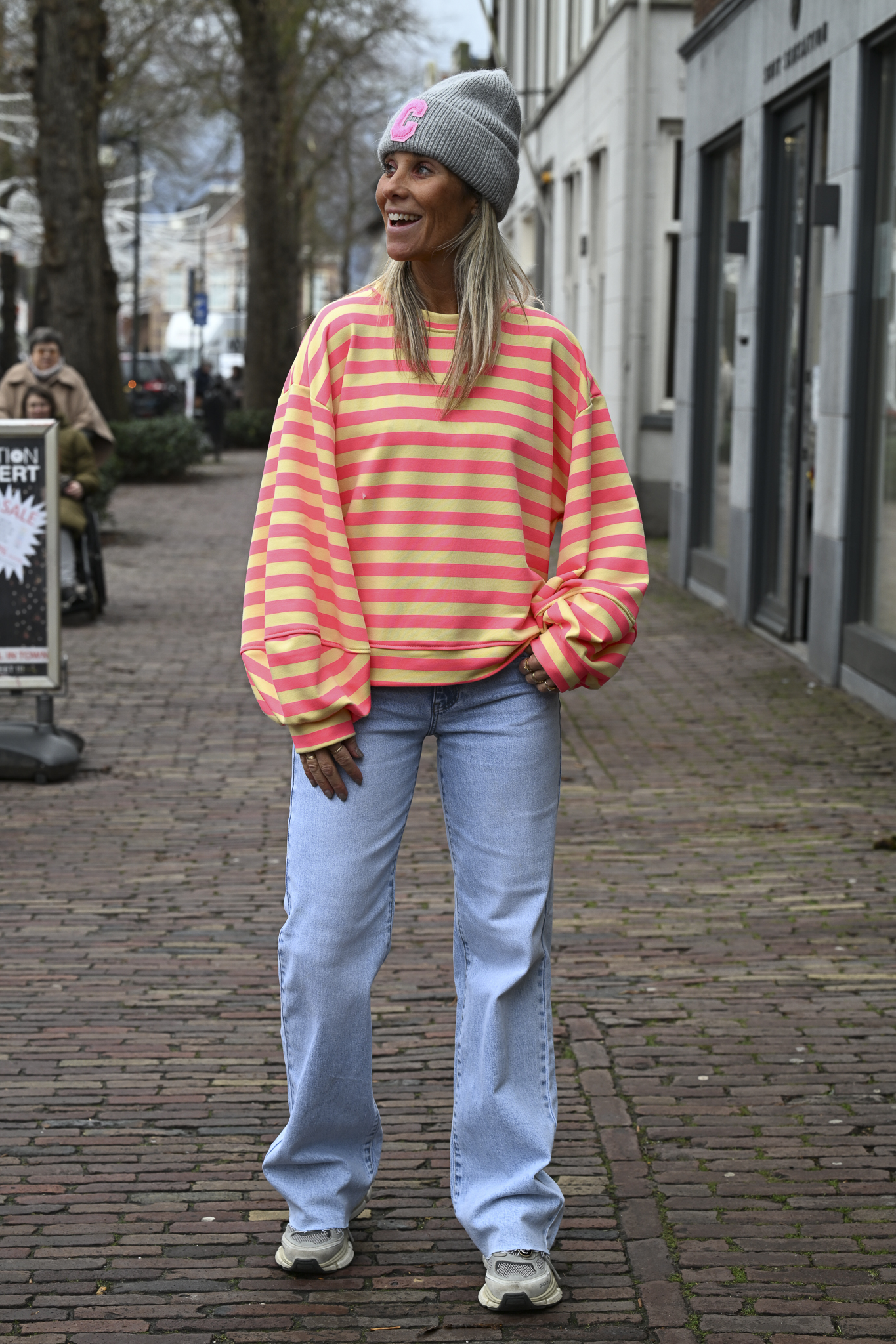 Wat een print op deze onesize sweater met pofmouwen! Strepen, stripes, rayures – noem het zoals je wilt, maar deze sweater (65% katoen)...