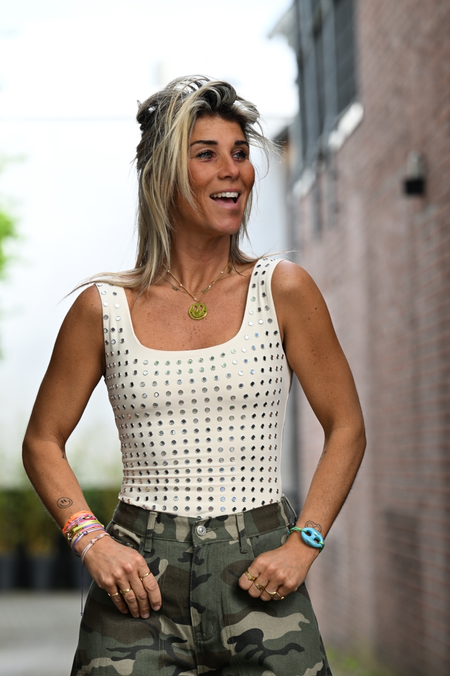 Deze studs body heeft lekker veel stretch. De studs zijn vastgeslagen en zitten daardoor goed op hun plek. Bij het kruis sluit de body...
