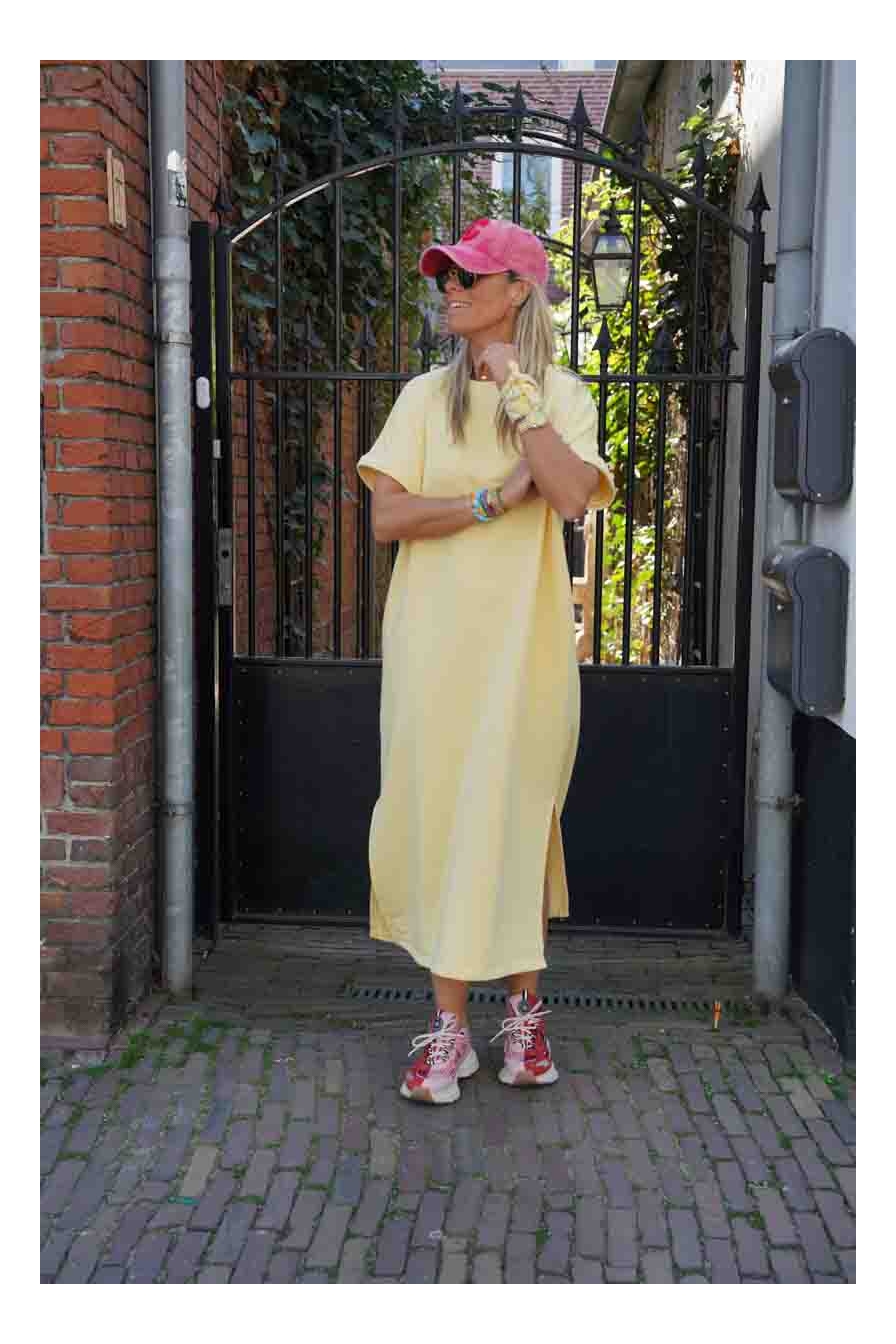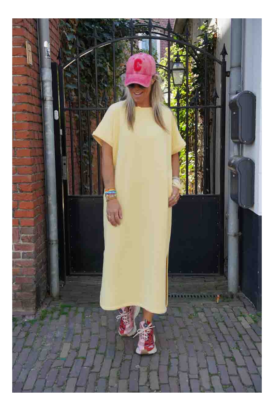 Sweatdress Veronique gemaakt van 100% zacht katoen, met kapmouwtjes, een V-hals, 2 steekzakken én speelse splitjes aan de zijkant voor die effortless vibe! Dit one size model draag je tot maat L/XL!