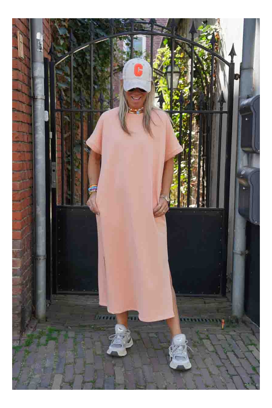 Sweatdress Veronique gemaakt van 100% zacht katoen, met kapmouwtjes, een V-hals, 2 steekzakken én speelse splitjes aan de zijkant...
