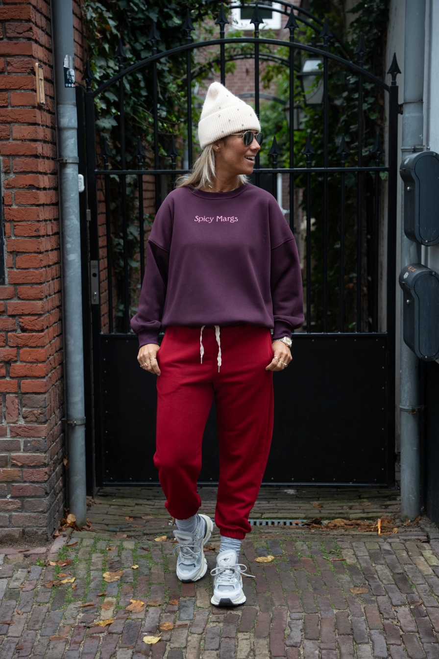 Stoere sweater Amila met de tekst ‘Spicy Marges’ op de borst is perfect voor een casual statement look. Gemaakt van 50% katoen en 50% polyester, geschikt tot maat L/XL. (Model is 1,72m.)