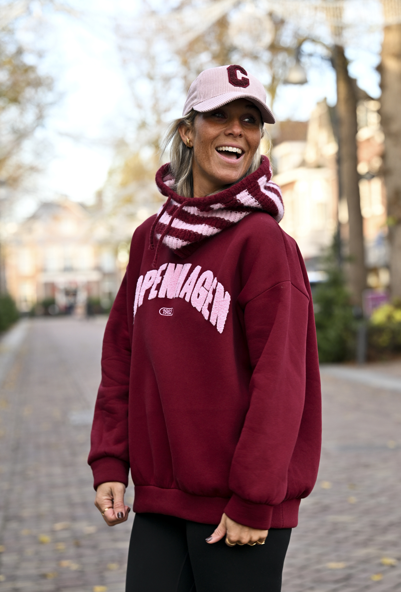 Sweater alert! Onesize gevoerde sweater, gemaakt van o.a. 65% katoen. Op de voorkant staat Copenhagen in roze kleurige badstof letters....