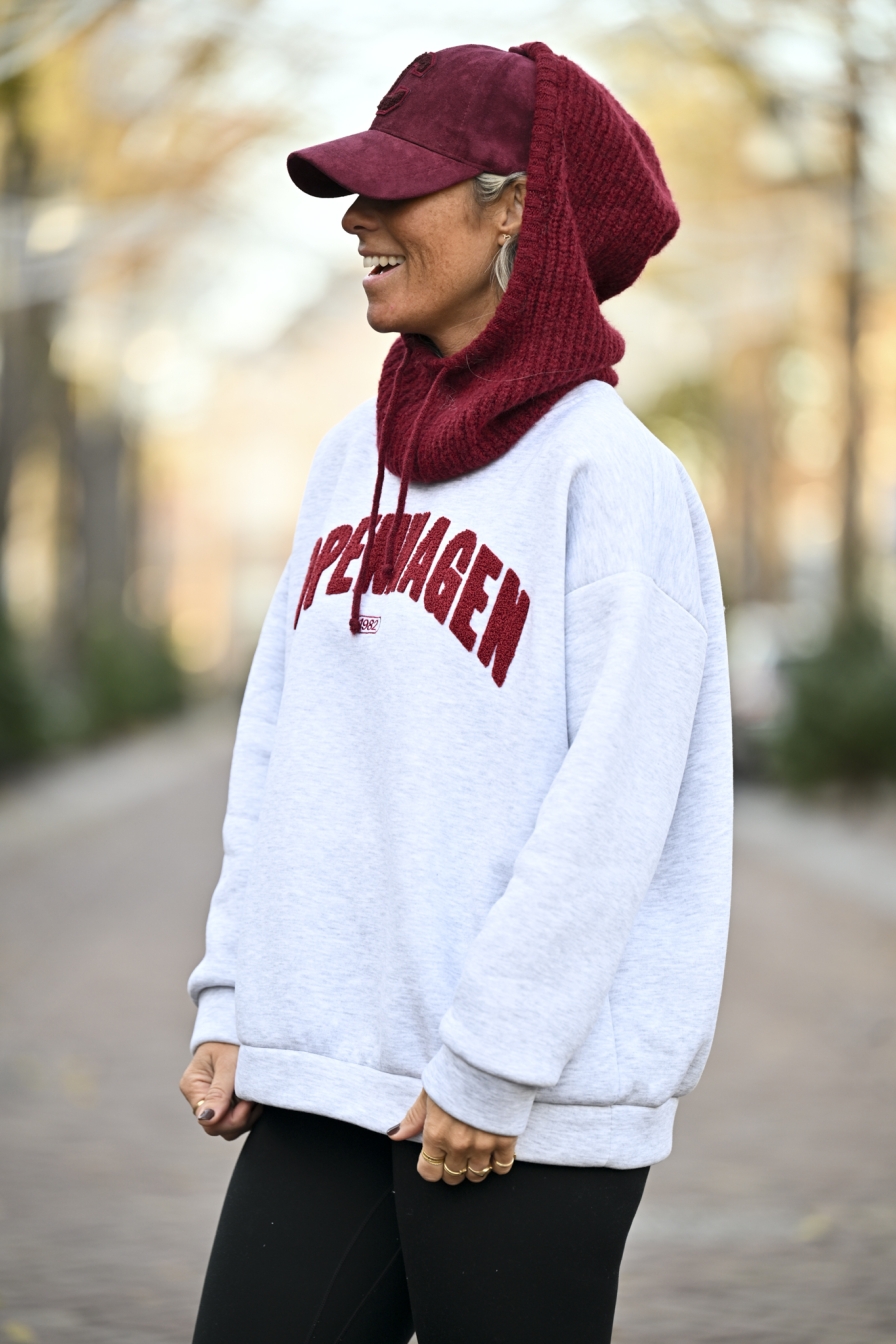 Sweater alert! Onesize gevoerde sweater, gemaakt van o.a. 65% katoen. Op de voorkant staat Copenhagen in bordeaux kleurige badstof...