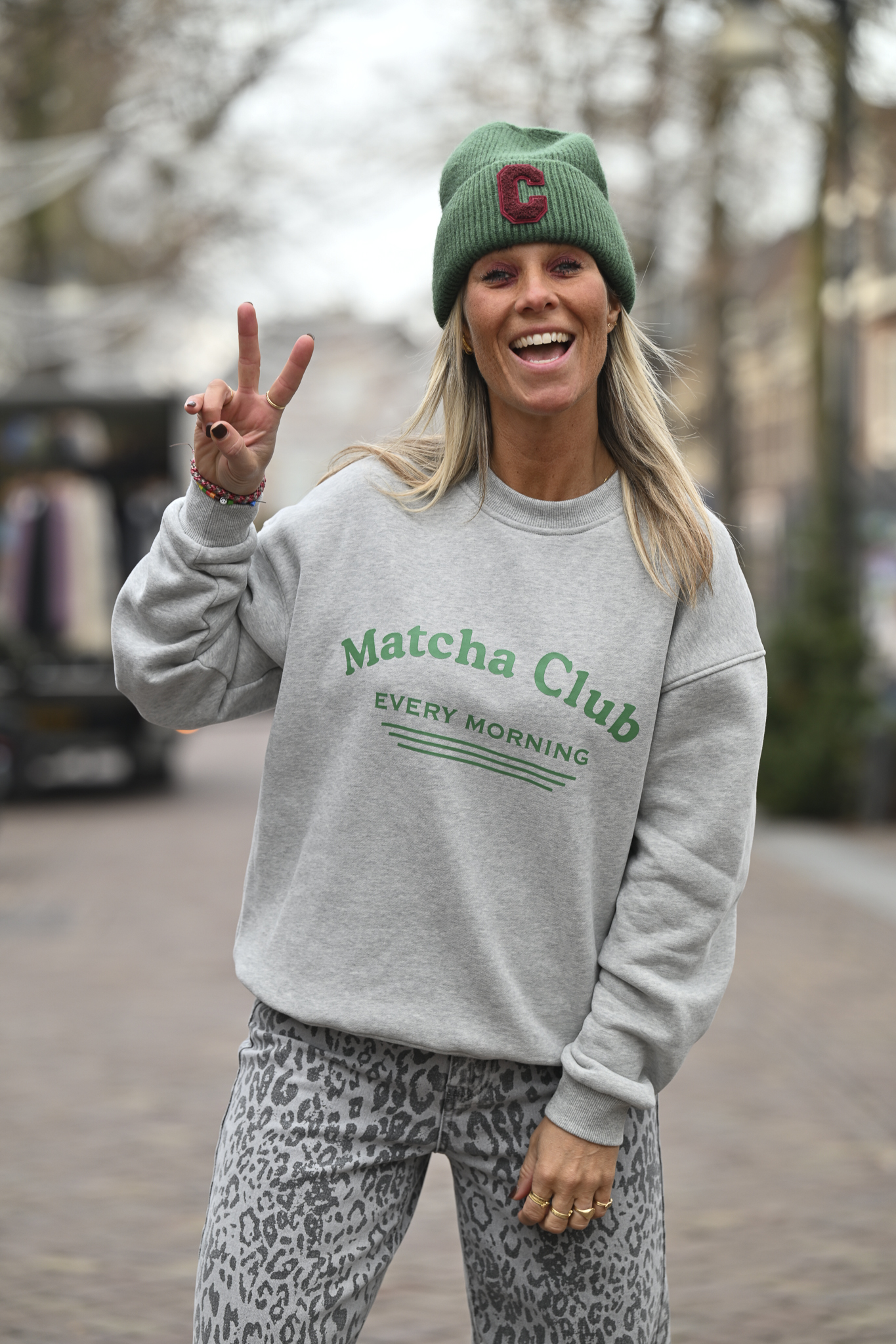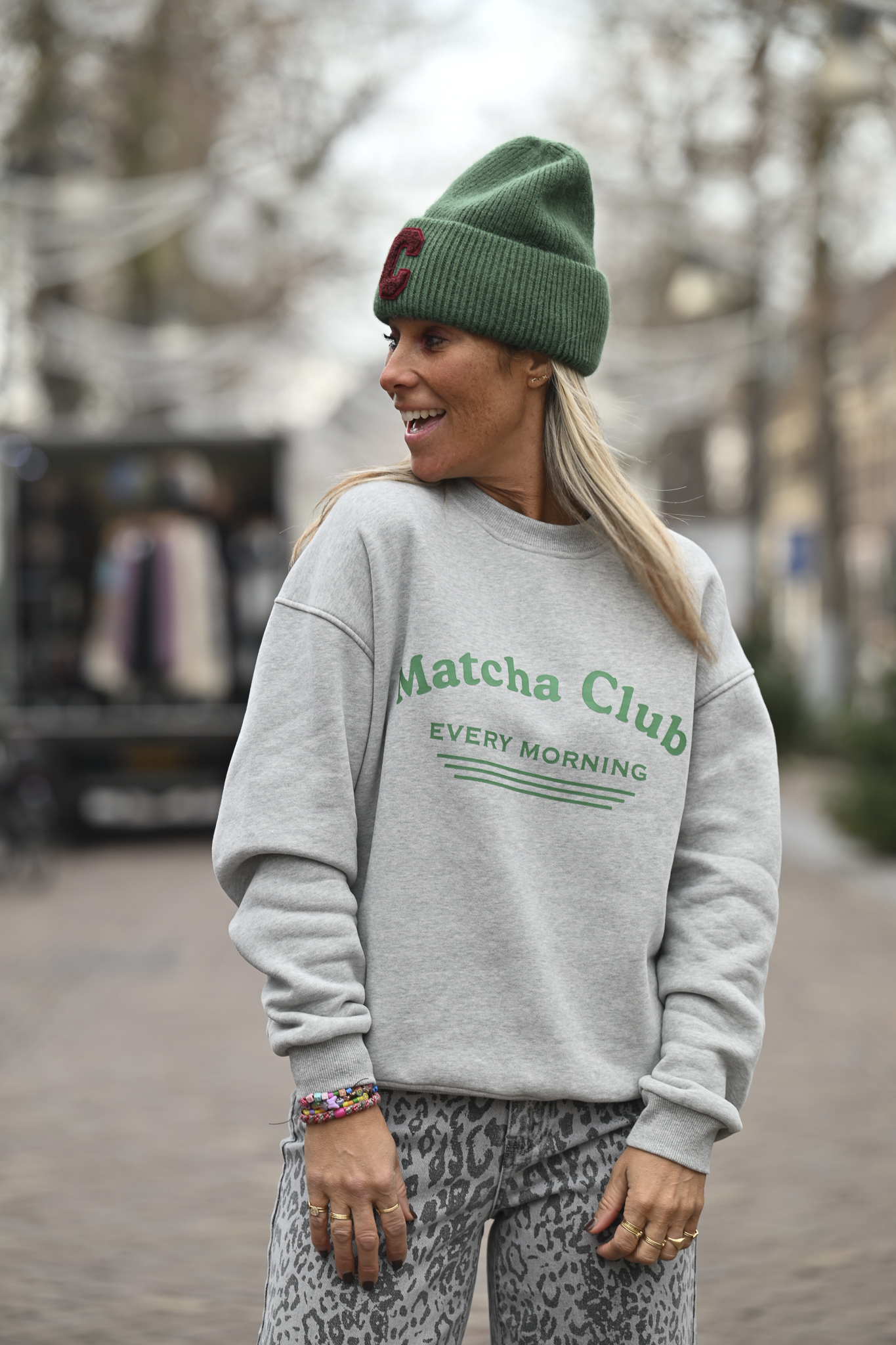 YES! De Matcha Club Sweater is gearriveerd. Lekker oversized, gevoerd en verkrijgbaar in S/M of M/L. Ik draag maat S/M op de foto en ben 1.76 m – comfy en ready to rock.