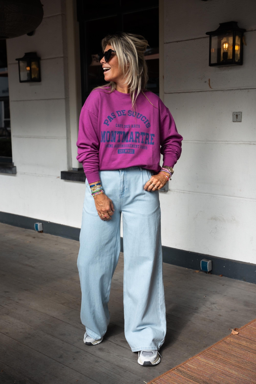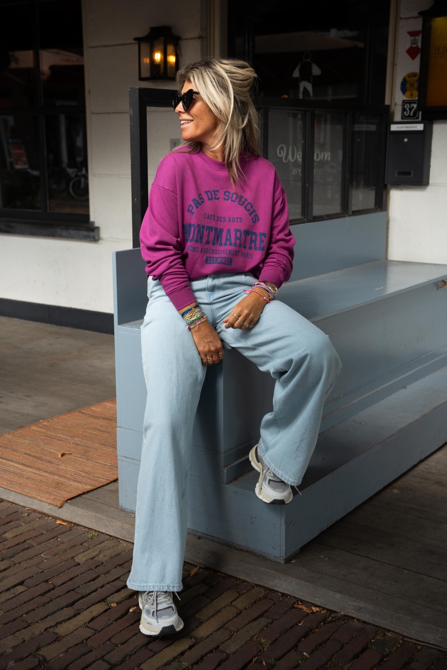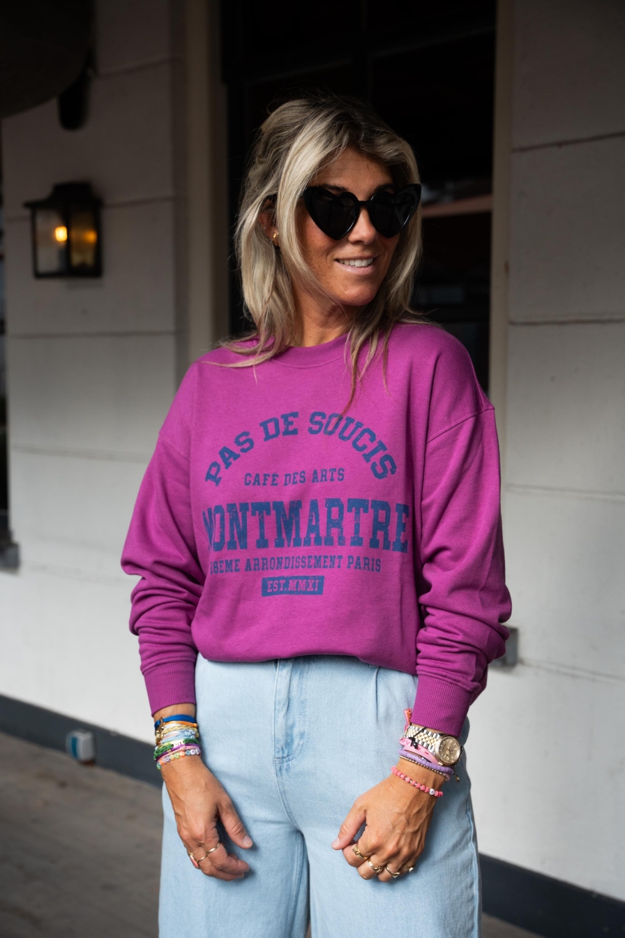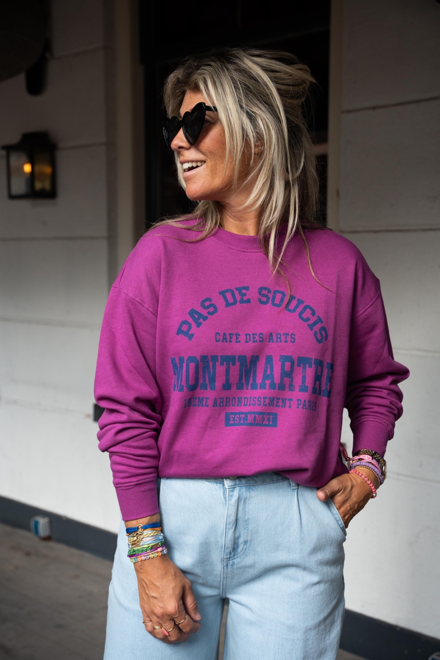 Sweater MontMartre paars is gemaakt van 75% katoen, 20% poly en 5% viscose. Het model op de foto is 1.76 m en draagt maat M. Comfort en stijl in een opvallende kleur!