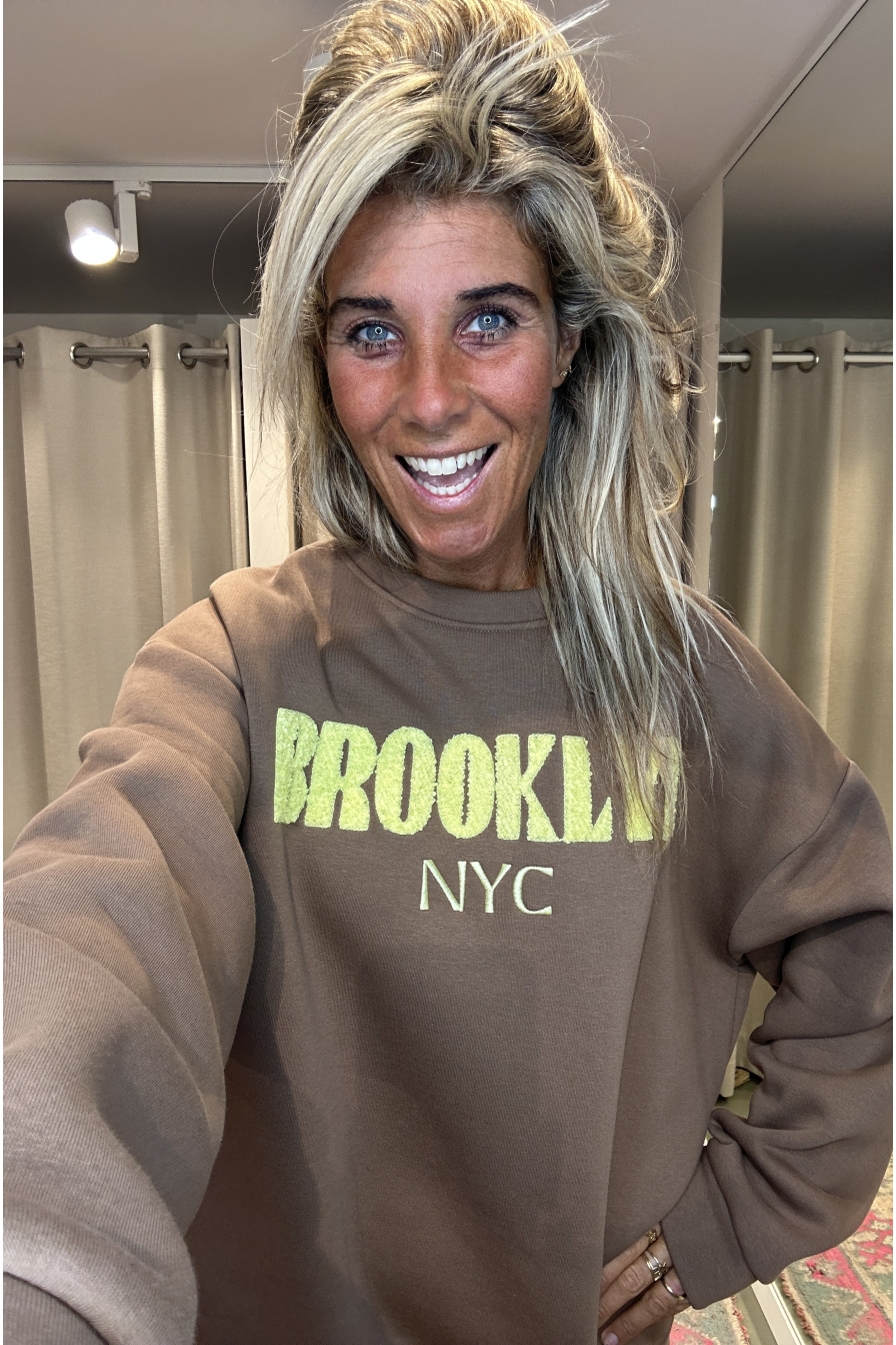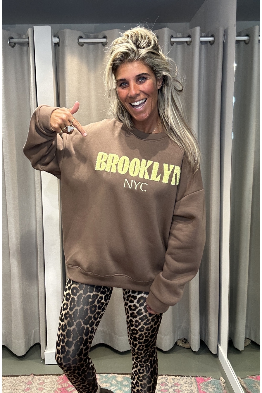 Bestseller Alert! Deze sweater is al jaren een topper in onze collectie. Het one-size model is gemaakt van 100% katoen, waardoor hij heerlijk comfortabel zit en geschikt is voor maten S t/m XL. Op de voorkant staat BROOKLYN NYC' gestikt.(wijk in New York City)