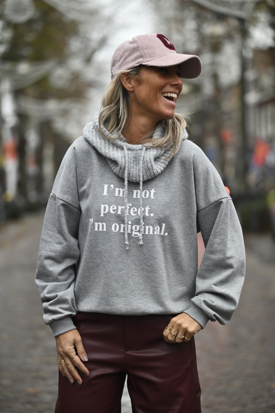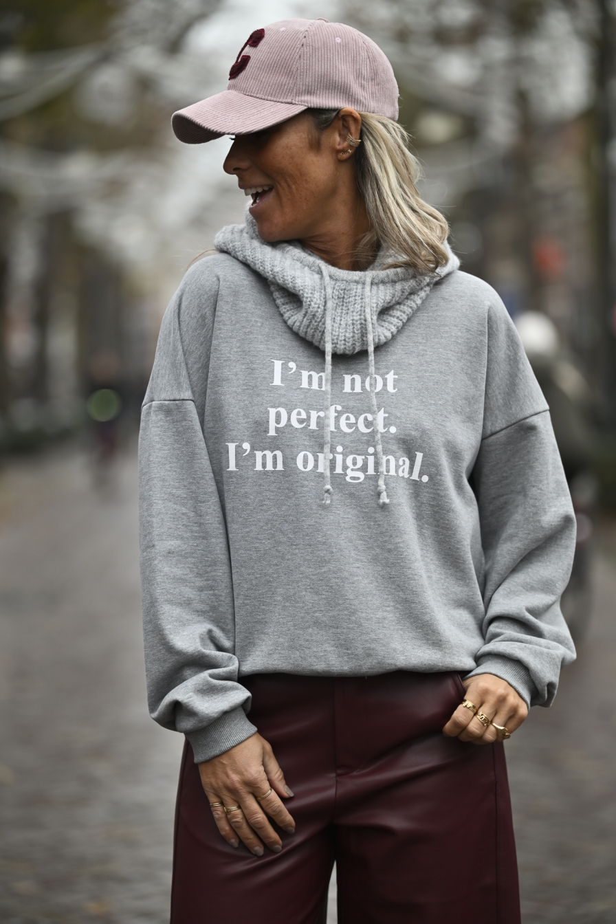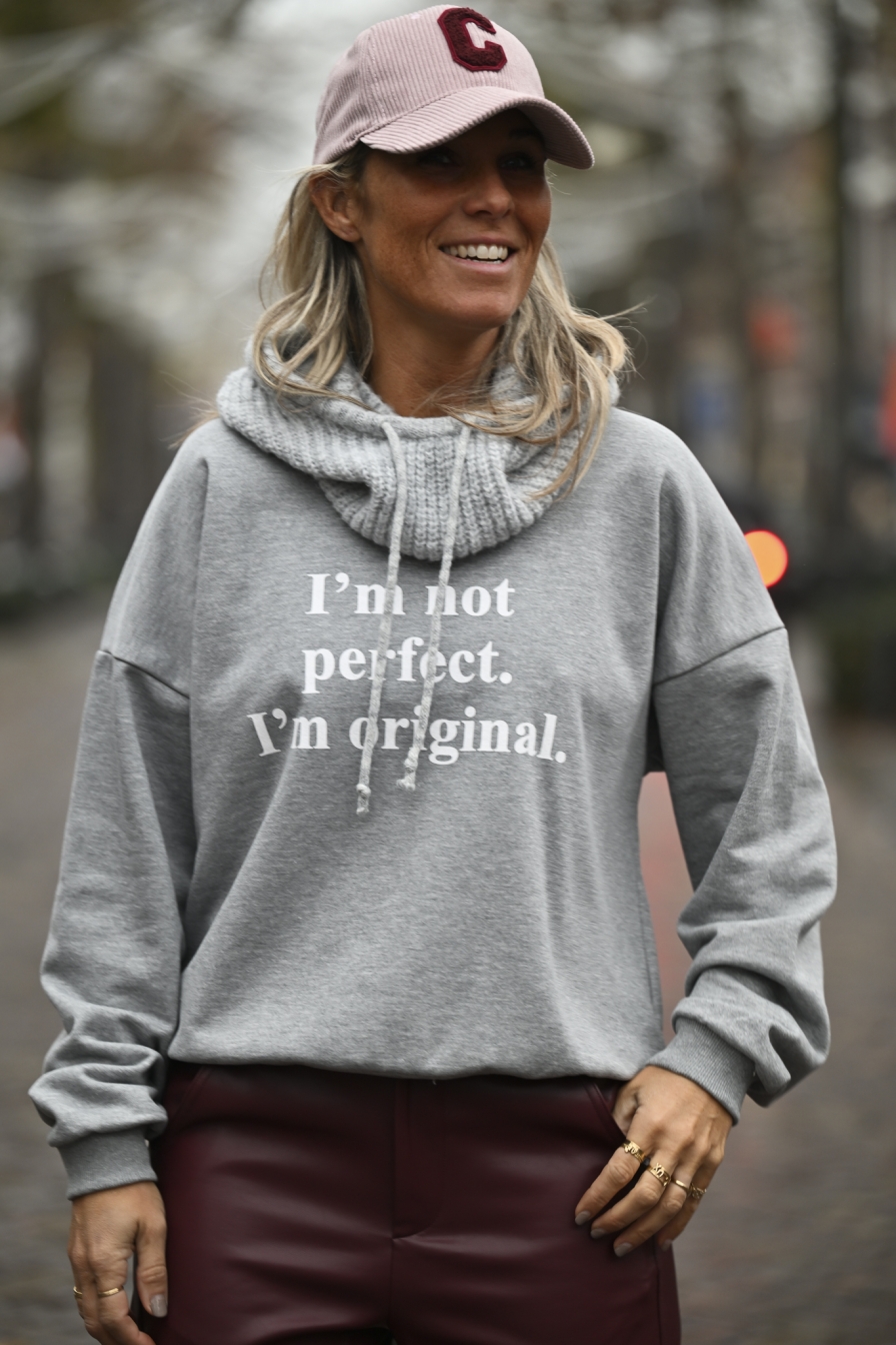 Grijze onesize sweater met de tekst “I’m not perfect I’M original” – statement vibes! Draagbaar t/m maat L/XL
