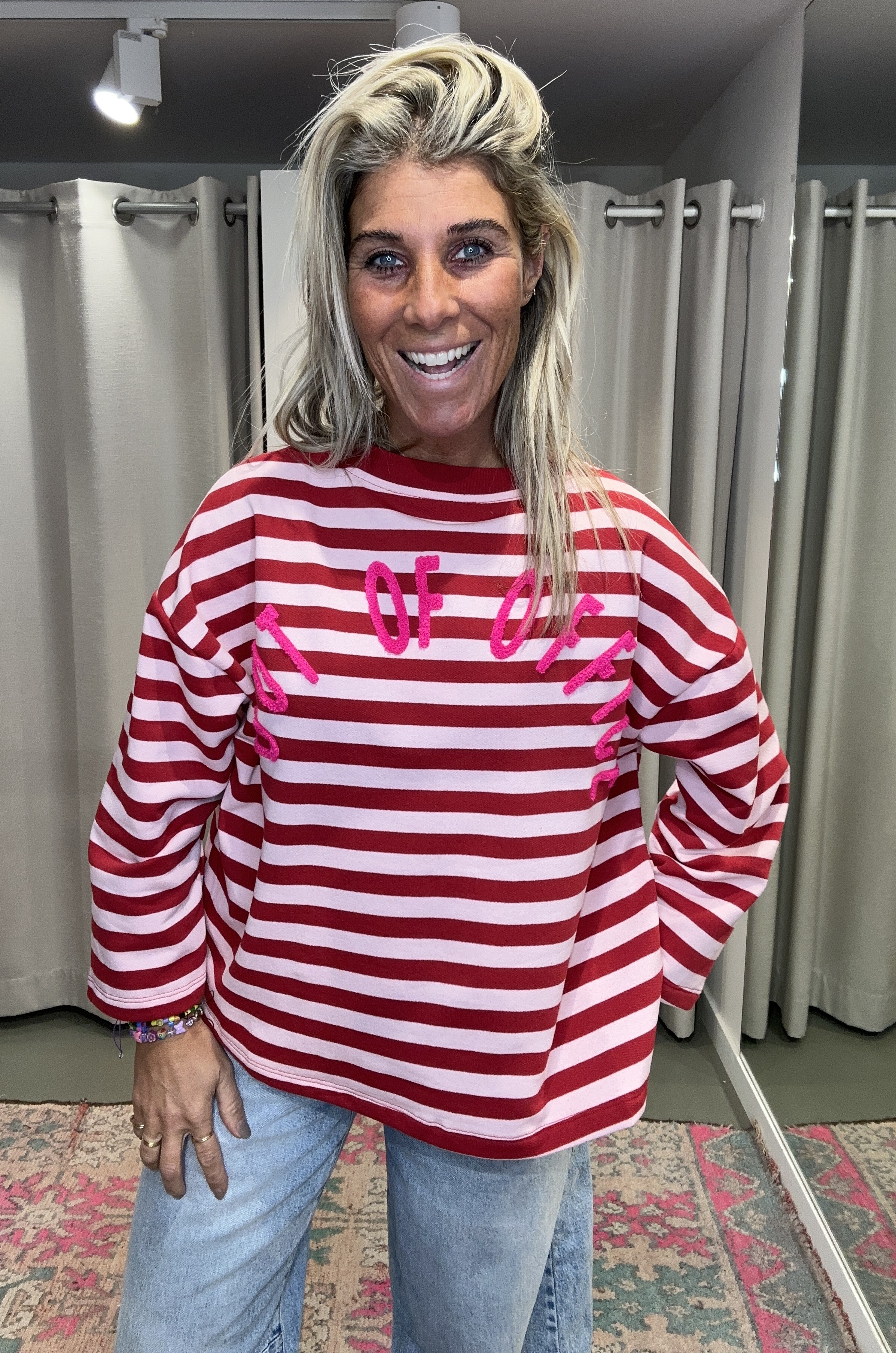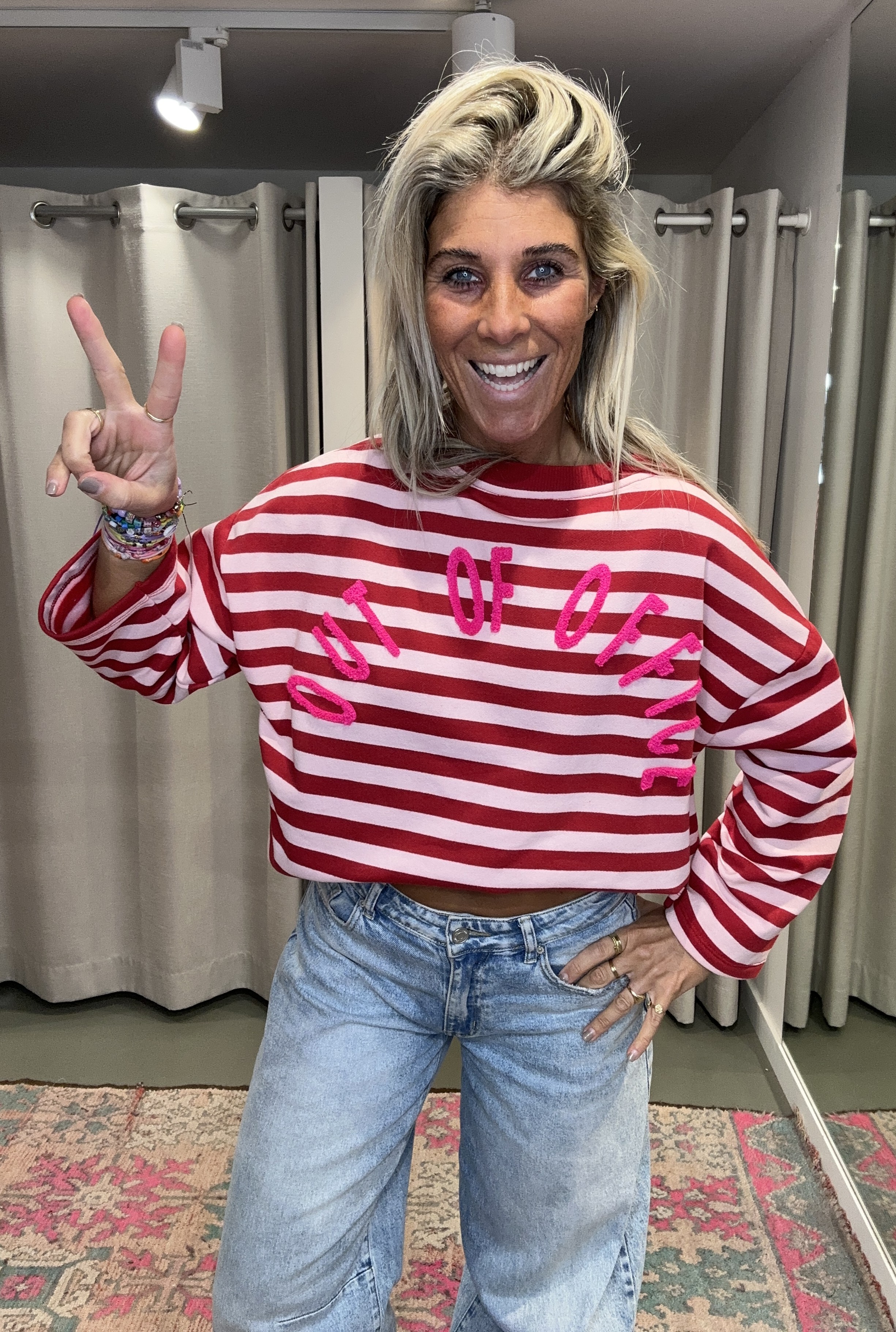 Gestreepte sweater met de tekst OUT OF OFFICE – zowel op de borst als op de rug te dragen. Onesize model, draagbaar t/m maat L/XL.