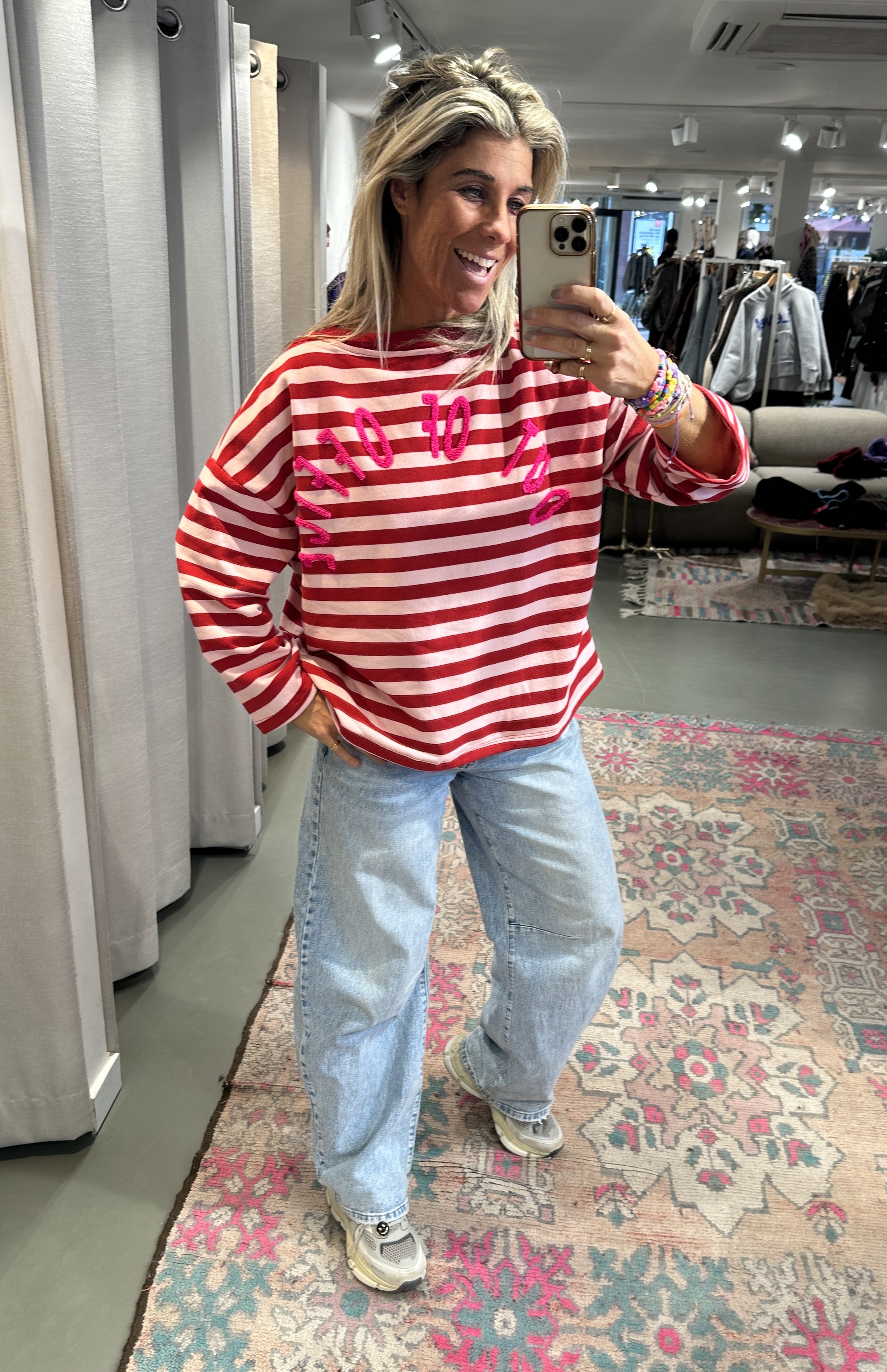 Gestreepte sweater met de tekst OUT OF OFFICE – zowel op de borst als op de rug te dragen. Onesize model, draagbaar t/m maat L/XL....