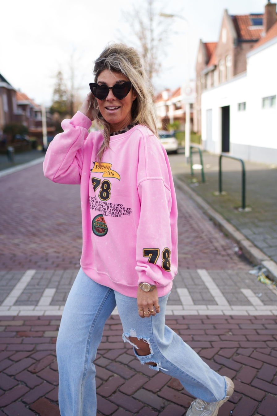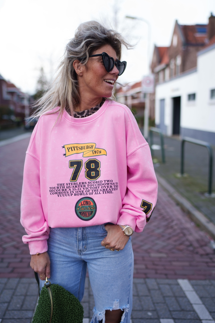 Roze oversized sweater, met het logo van Pittsburg 1978 op de voorkant en het cijfer 78 op de linker mouw!