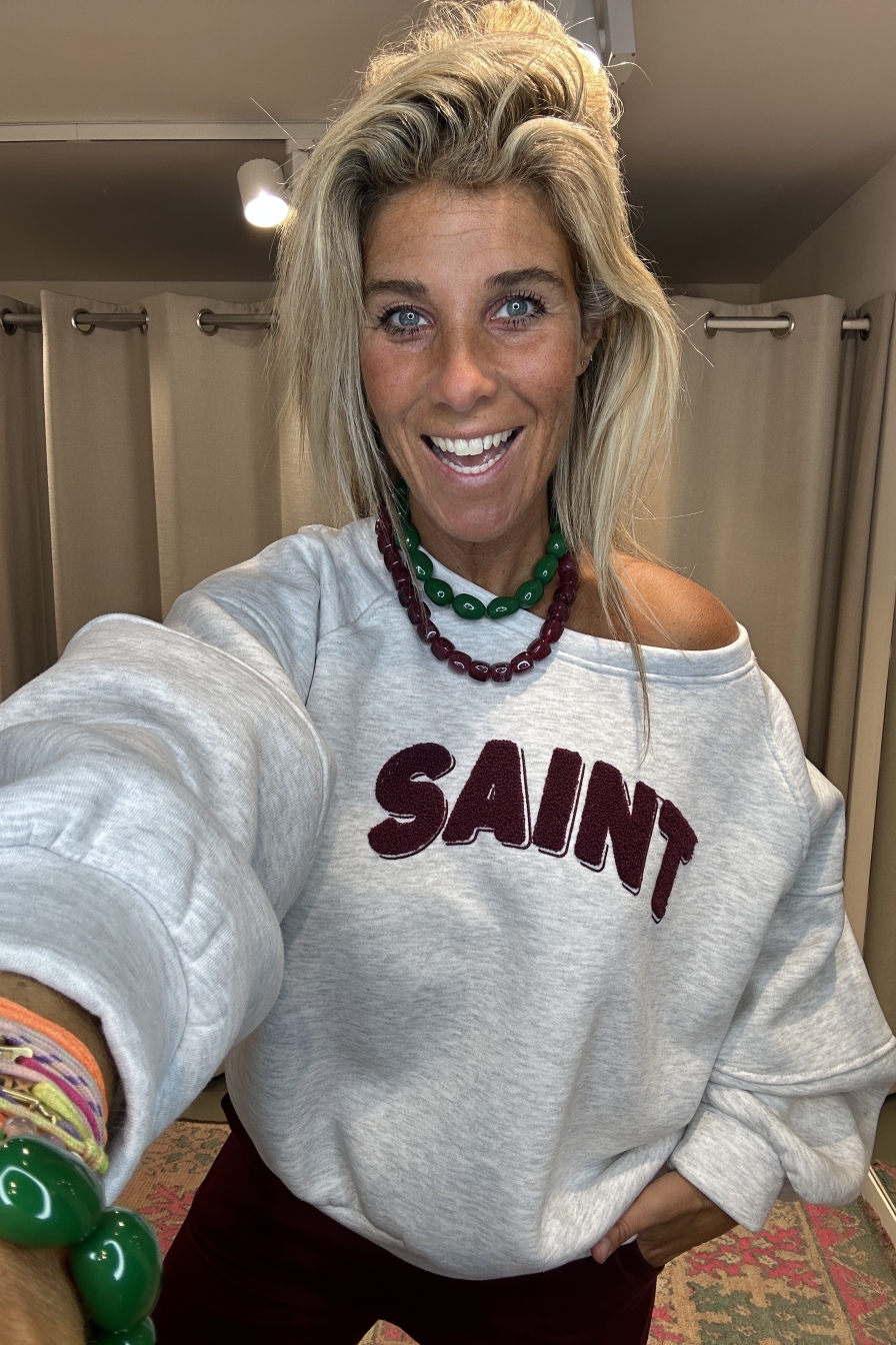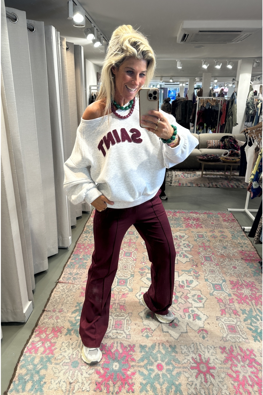 Deze sweater is al jaren een absolute topper in onze collectie. Het one-size model met pofmouwen is gemaakt van 100% katoen, waardoor hij heerlijk comfortabel draagt en geschikt is voor maten S t/m XL. Op de voorkant staat ‘Saint’ in badstof letters gestikt
