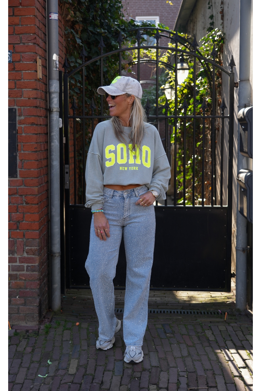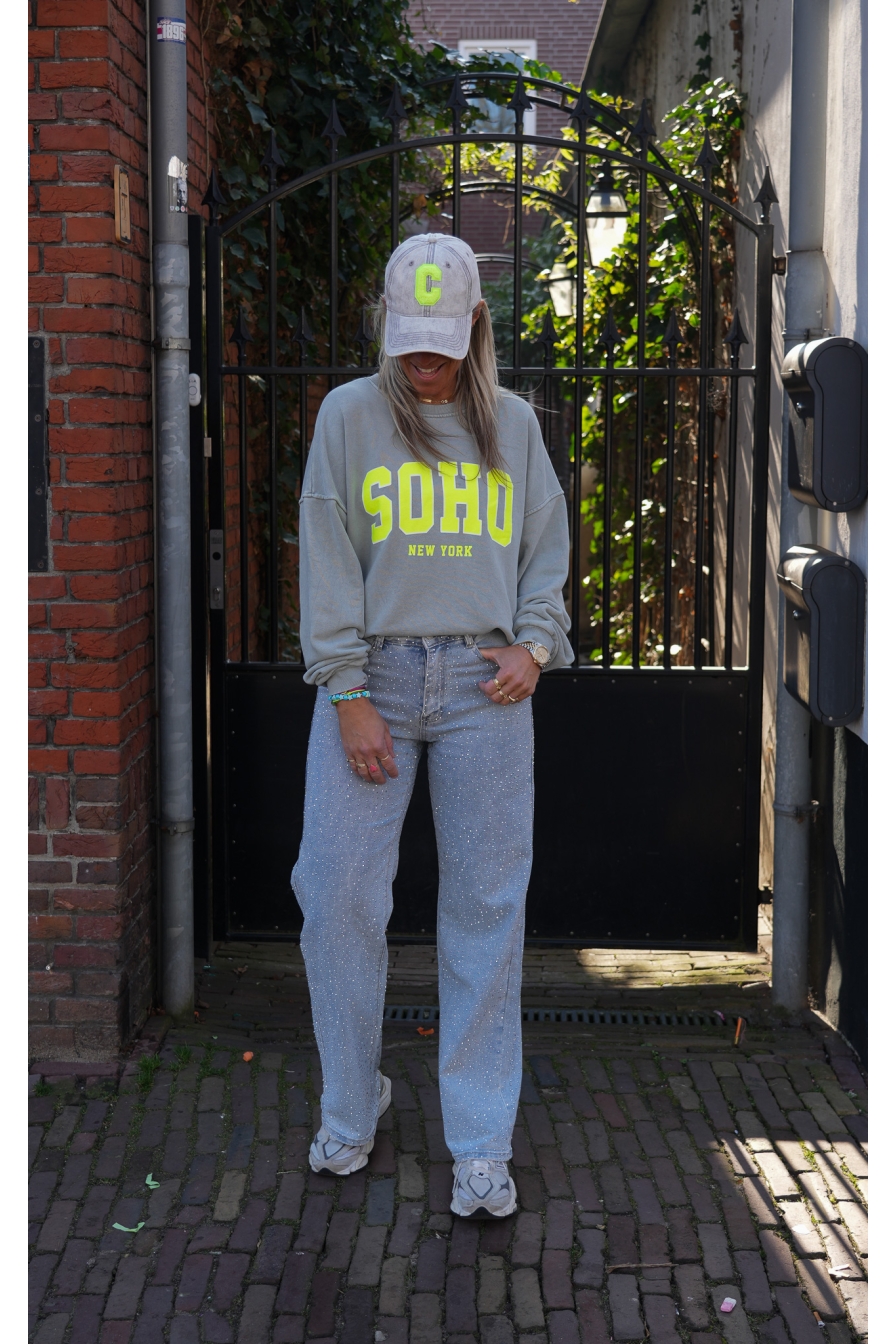 De Perfecte SOHO Sweater! Deze heerlijke sweater is gemaakt van 100% katoen en voelt superzacht aan. Het one-size model draag je moeiteloos tot maat 44, perfect voor een relaxte en stijlvolle look.