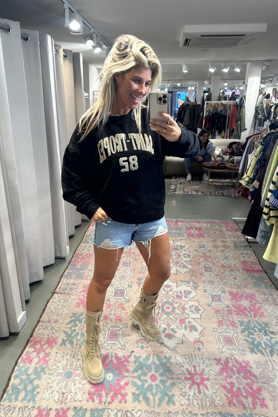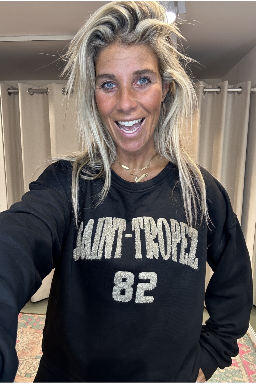 Bestseller Alert! Deze sweater is al jaren een topper in onze collectie. Het one-size model is gemaakt van 100% katoen, waardoor hij heerlijk comfortabel zit en geschikt is voor maten S t/m XL. Op de voorkant staat ‘Saint-Tropez 82’ in badstof letters gestikt.