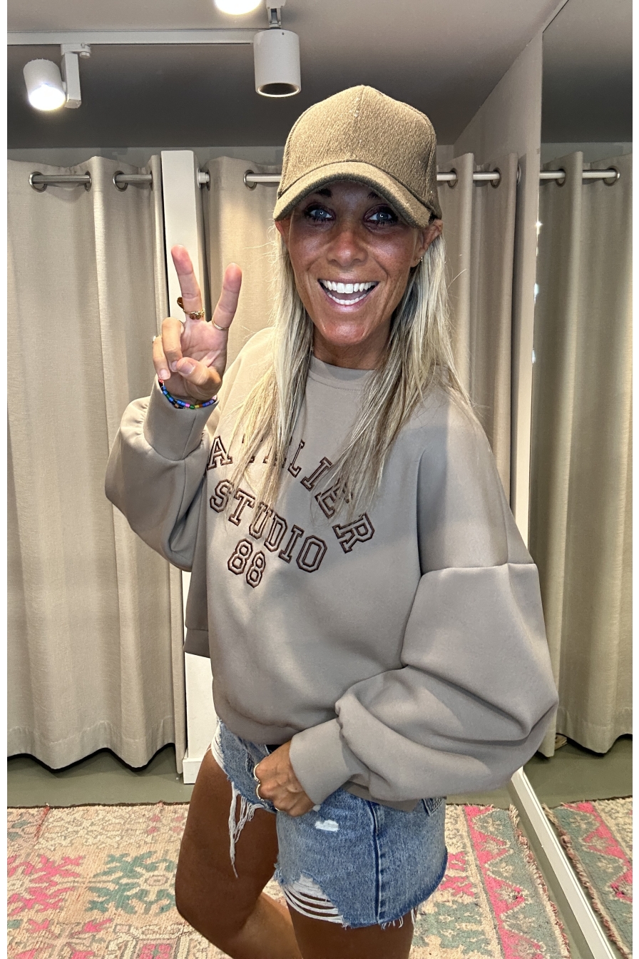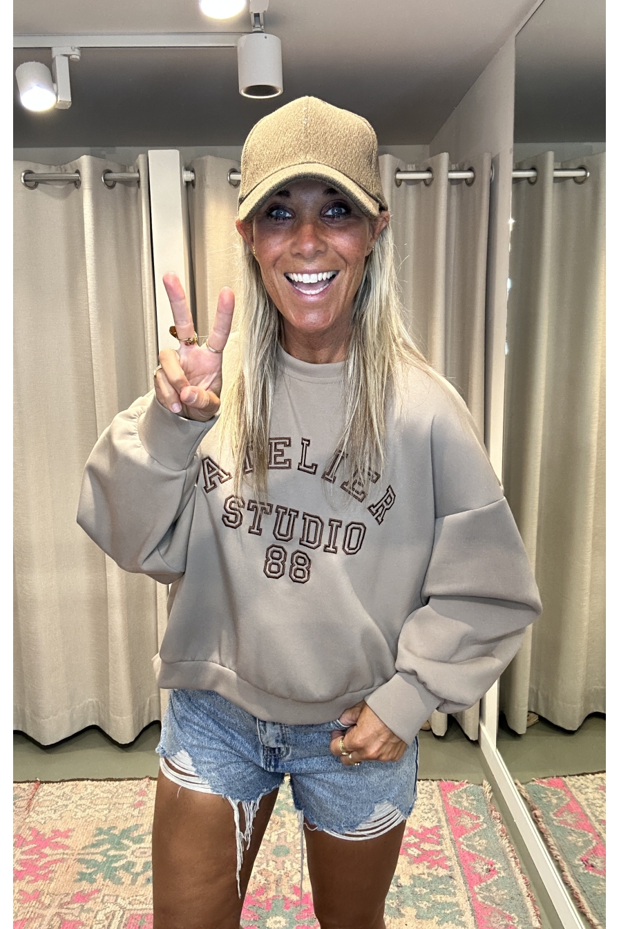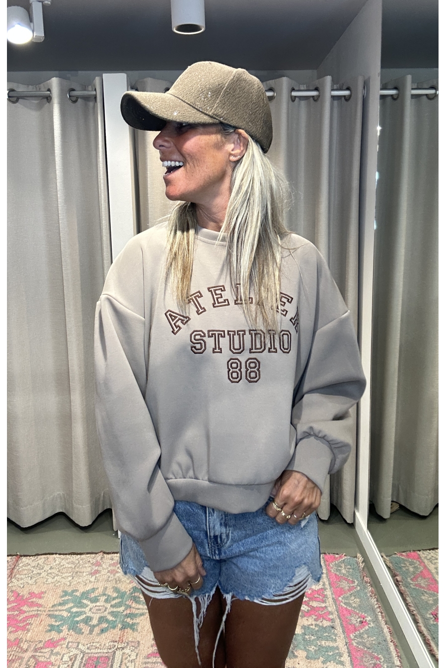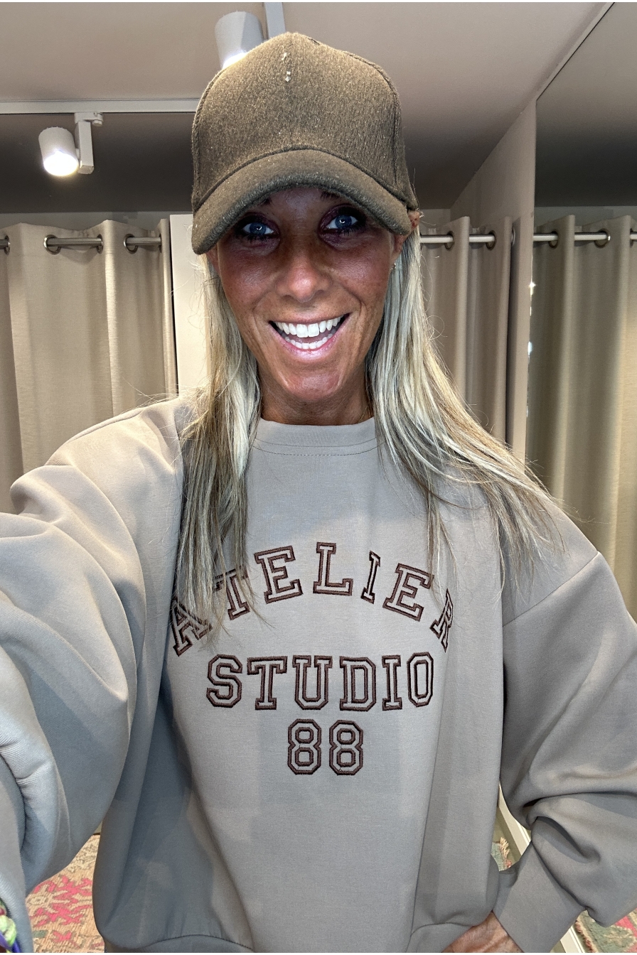 Deze sweater is al jaren een topper in onze collectie. Het one-size model is gemaakt van 100% katoen, waardoor hij heerlijk comfortabel zit en geschikt is voor maten S t/m XL. Op de voorkant staat ‘ATELIER STUDIO 88' gestikt. Combineer deze topper met Wide Leg Wya!