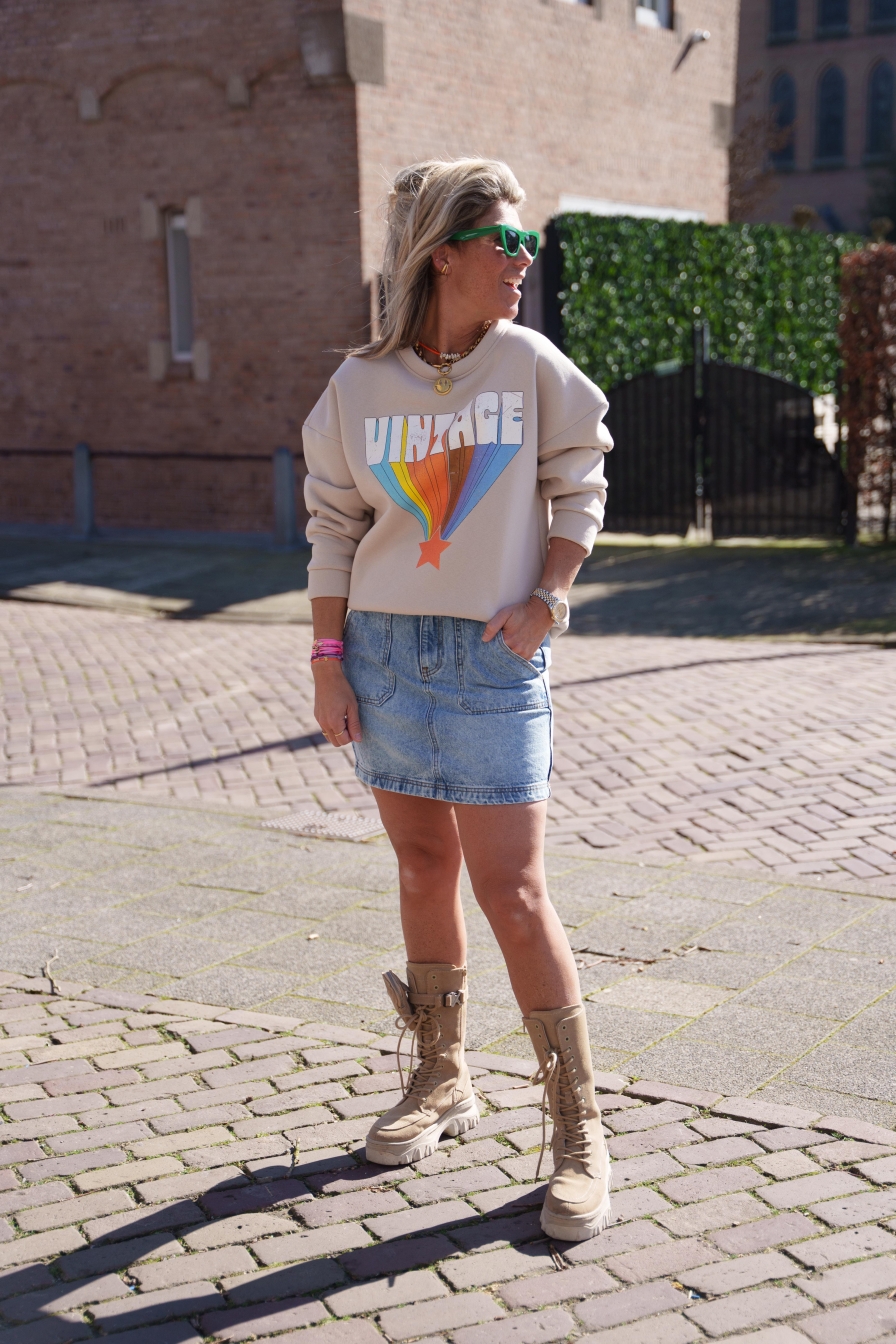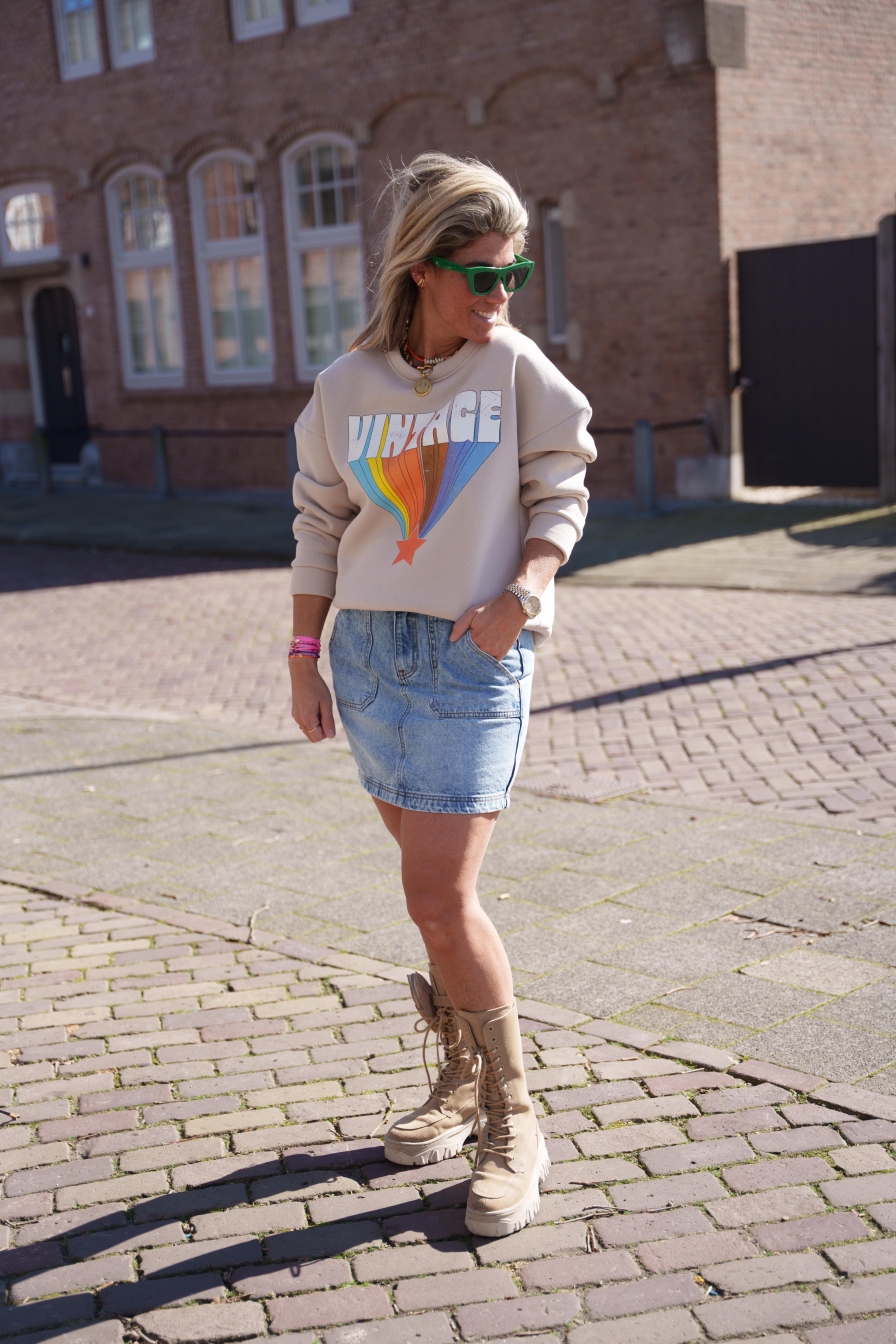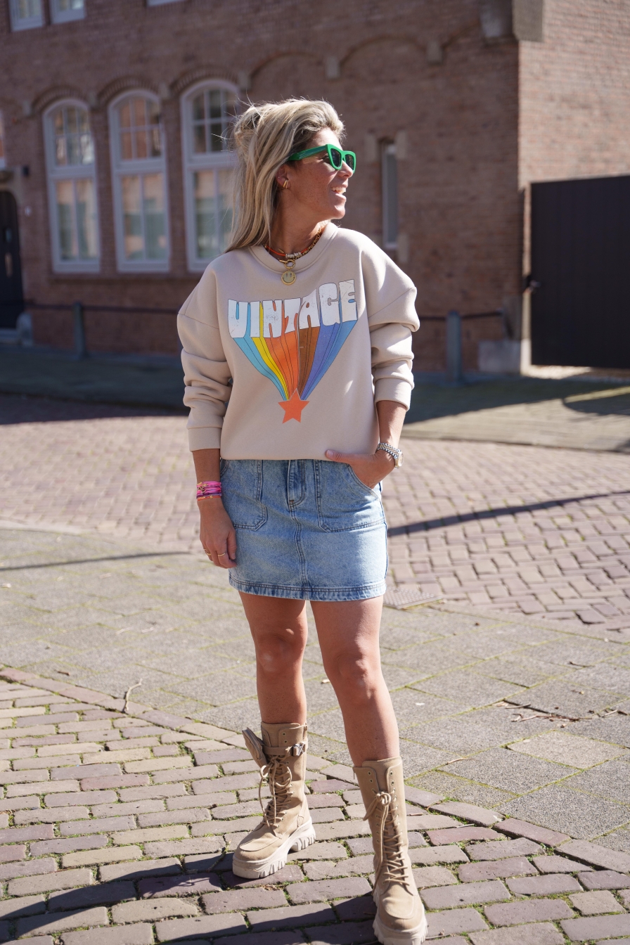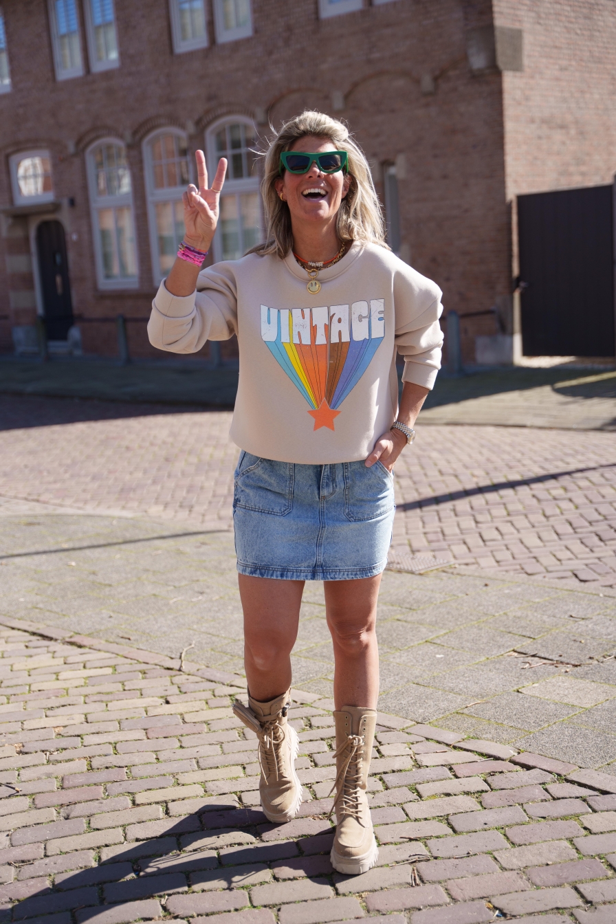 Beige sweater met de tekst "Vintage", vervaardigd van 65% katoen. Een comfortabele en nostalgische keuze voor een tijdloze stijl.