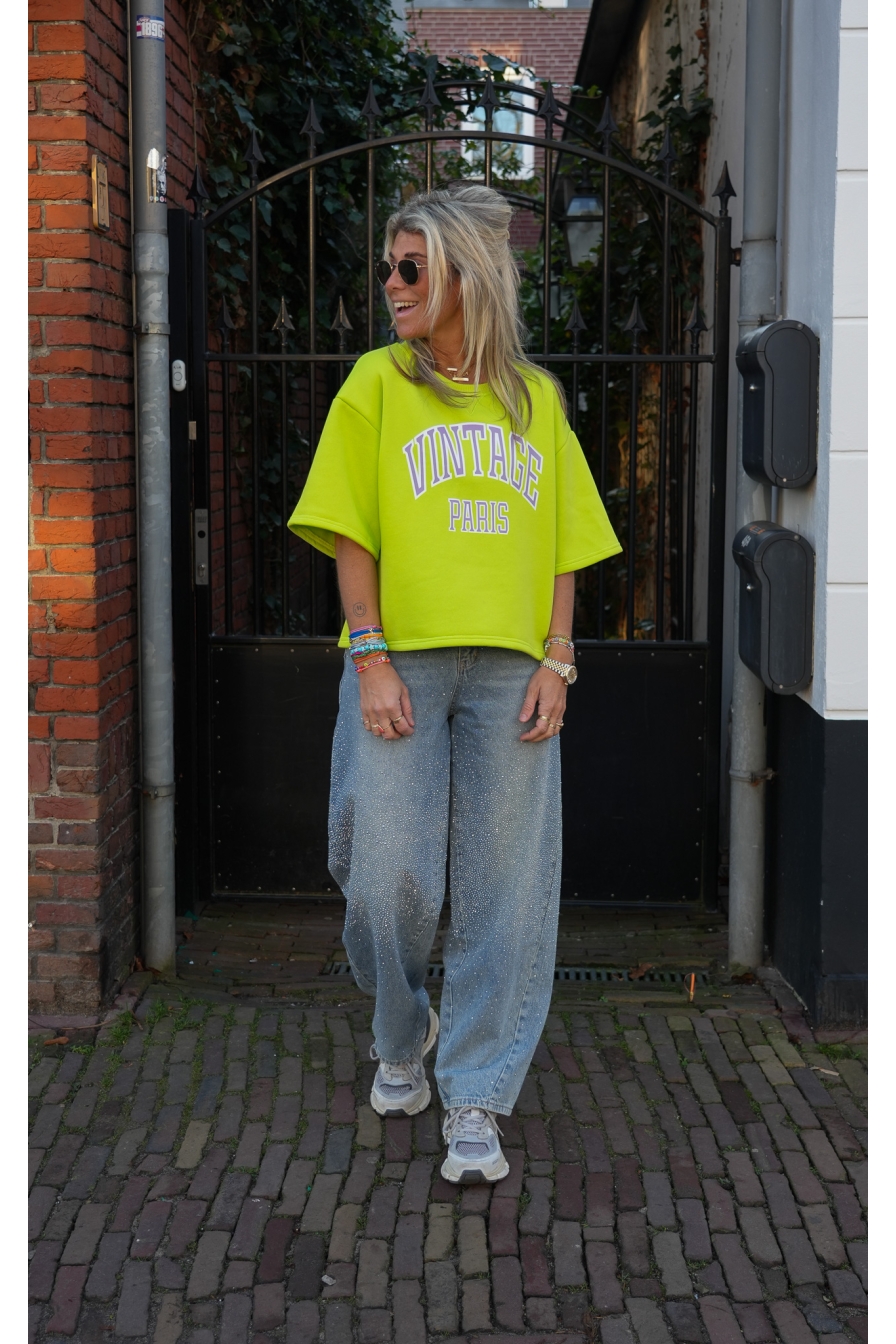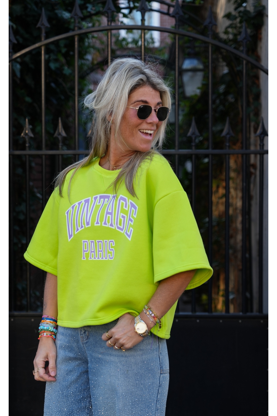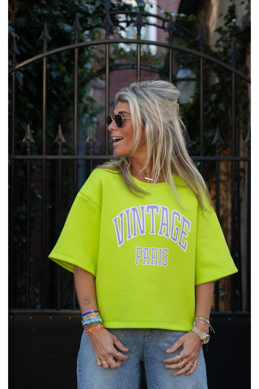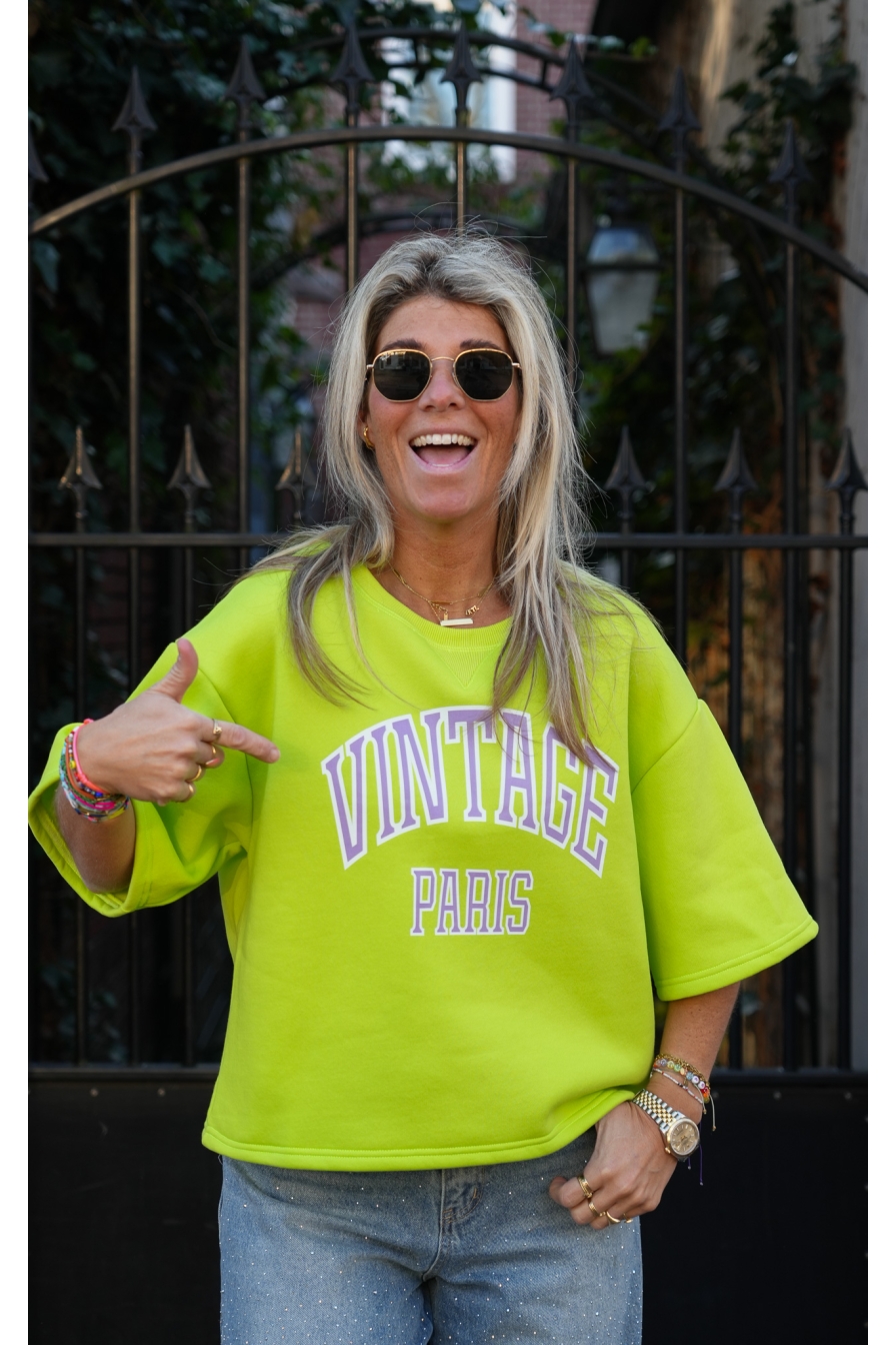 Sweater Paris Lime is een frisse must-have! Met trendy 3/4 mouwen en gemaakt van 52% katoen, combineert deze sweater comfort en stijl. De tekst VINTAGE PARIS maakt 'm helemaal af. Dit onesize model draag je tot en met maat L/XL
