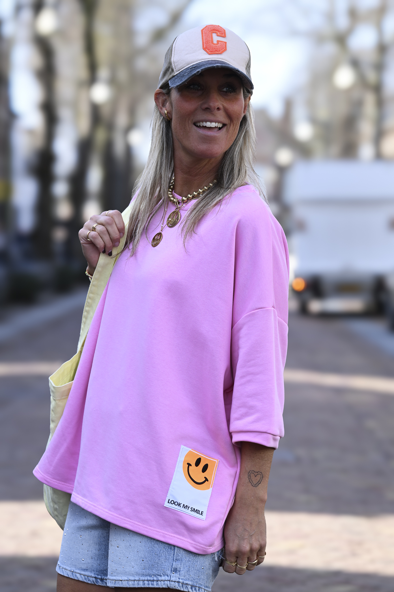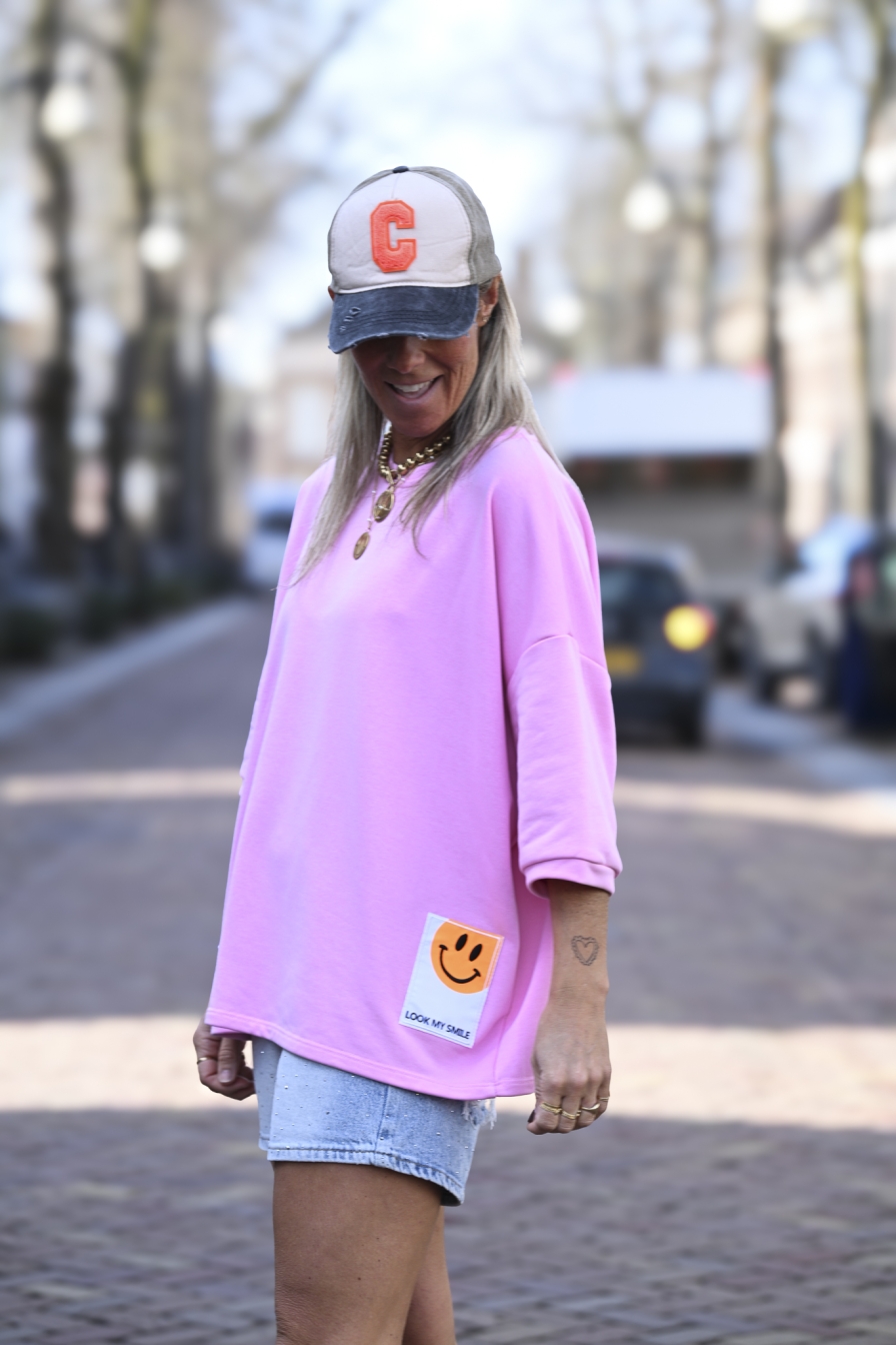 Oversized sweatshirt van 80% katoen met 3/4 mouwen, uitgevoerd in frisse, happy kleuren. Op de linkeronderzijde zit een Smiley als speels detail. Dit onesize oversized model is draagbaar tot en met maat XL/42.