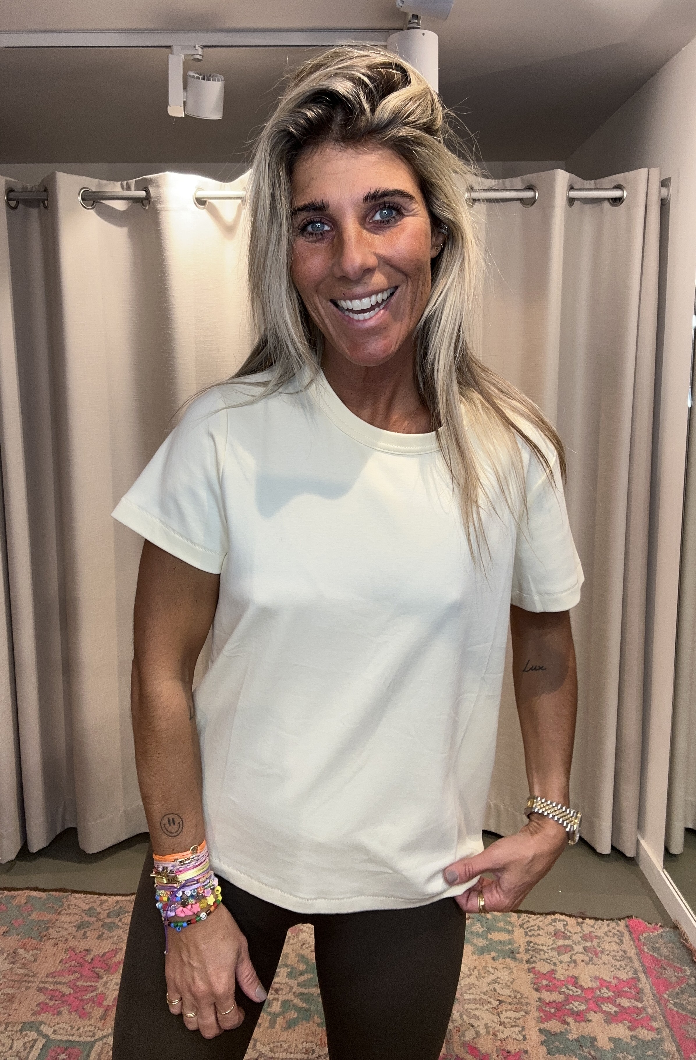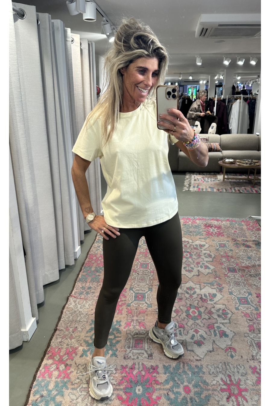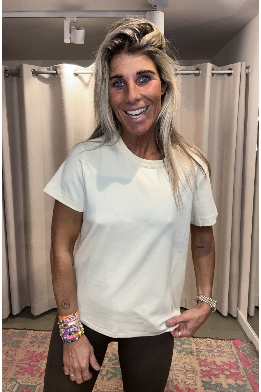 WOW! EIN-DE-LIJK dat perfecte basic T-shirt! STE-VIG ZÓ ZACHT dat je ’m nooit meer uit wilt doen. REKBAAR & SUPERCOMFY. 100% KATOEN – Topkwaliteit met een luxe afwerking die je ziet én voelt. Model is 1.74m en draagt maat S.