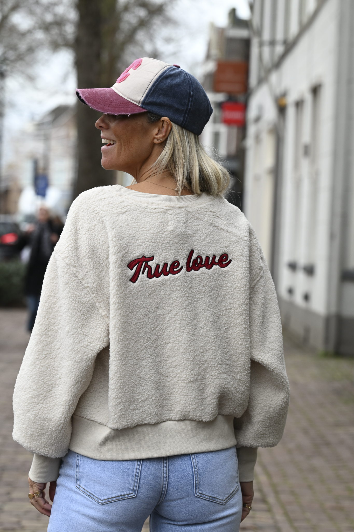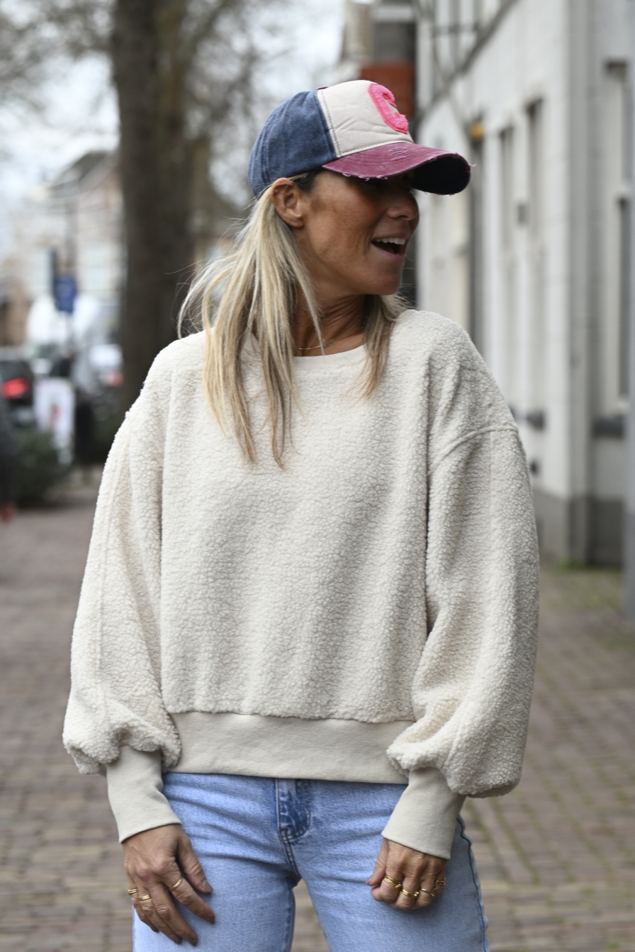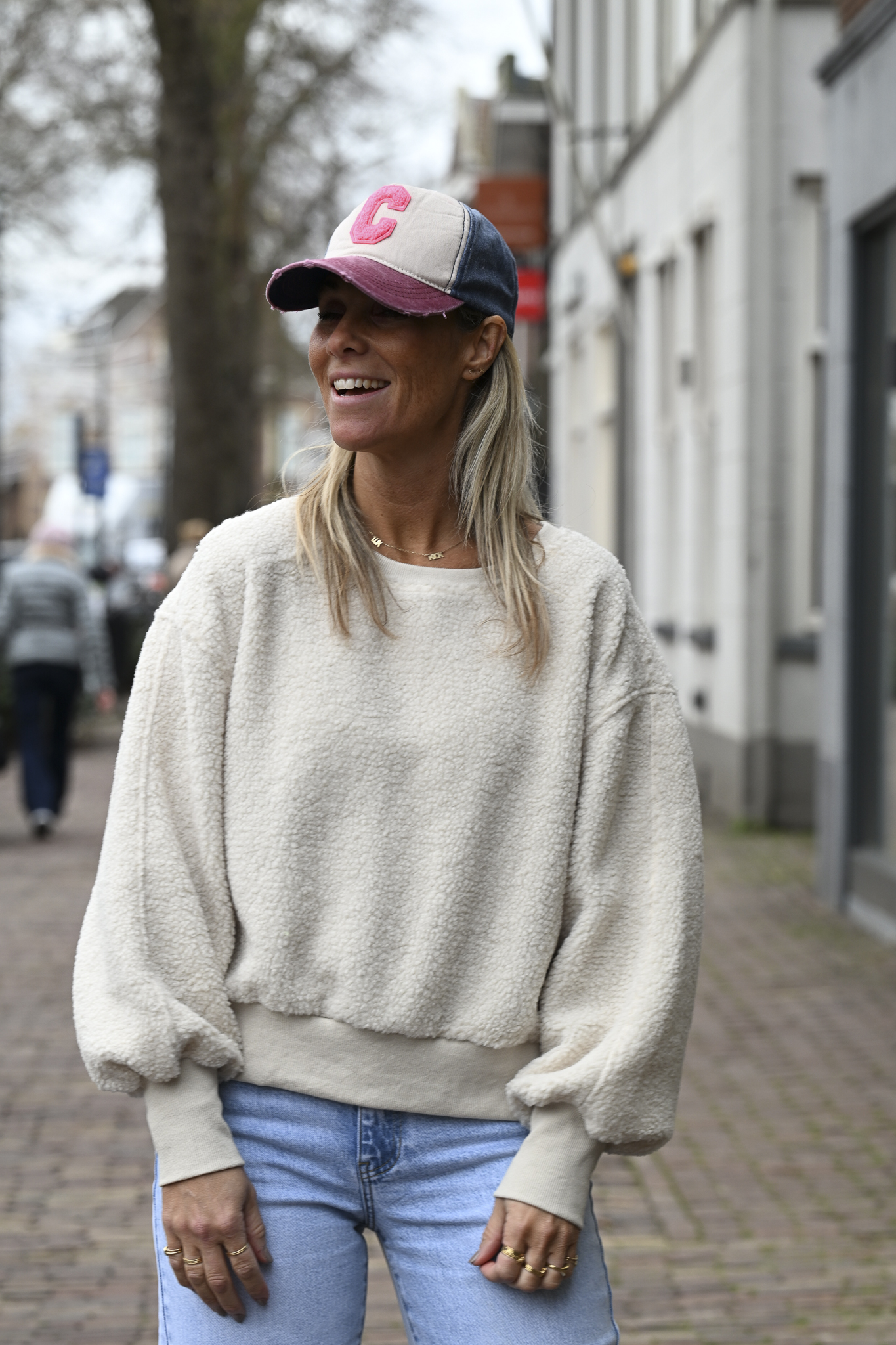 Een paar opvallende details aan deze heerlijke Teddy Trui: een brede band bij de polsen en aan de boord, een zachte teddy buitenkant en aan de binnenkant comfortabele joggingstof – dus geen jeuk. De hartjesbroche wordt los meegeleverd, zodat je ’m kunt dragen of juist weglaat. Op de foto draag ik maat S/M en ik ben 1.76 m.
