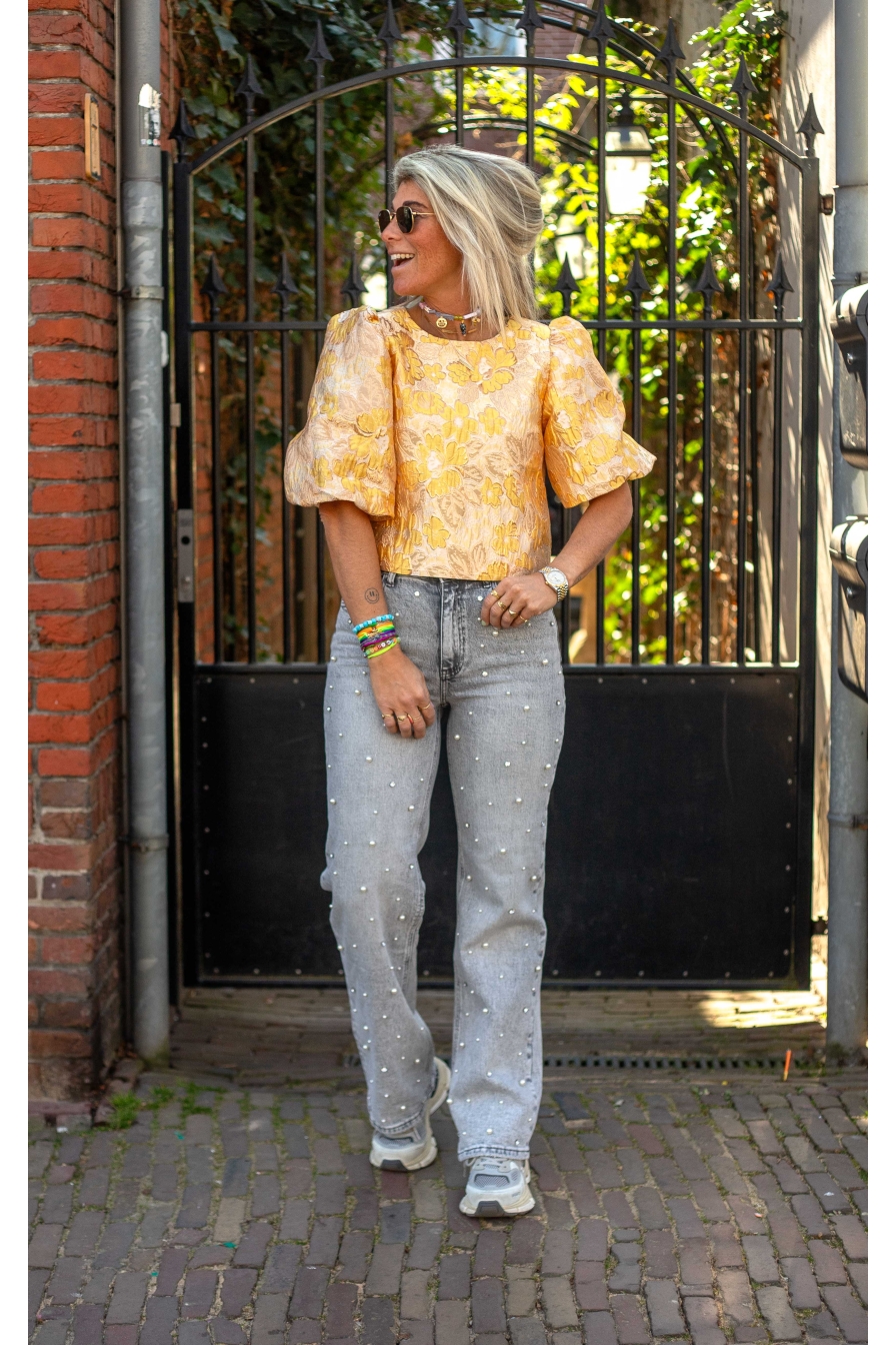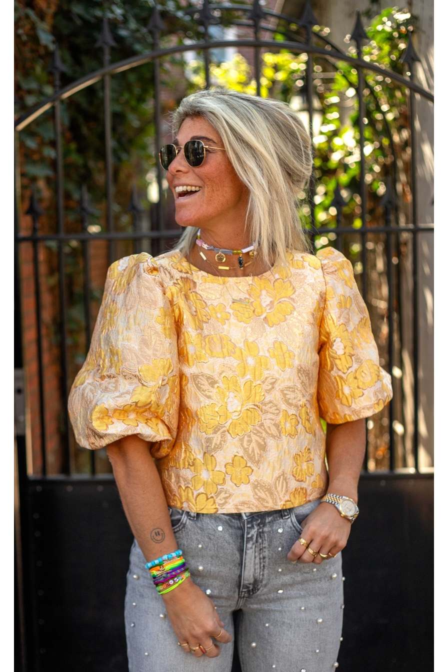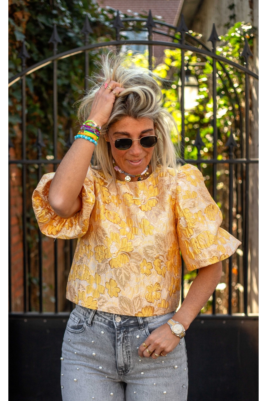 Deze prachtige Top Asia Ley heeft chique pofmouwtjes en is afgewerkt met een subtiele gouden lurexdraad voor een stijlvolle touch....