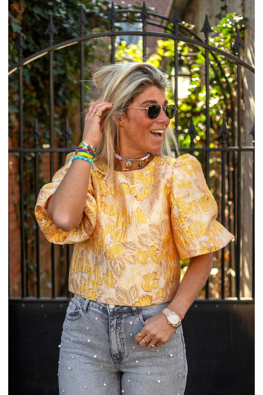 Deze prachtige Top Asia Ley heeft chique pofmouwtjes en is afgewerkt met een subtiele gouden lurexdraad voor een stijlvolle touch. Op de foto draag ik maat S/M en ik ben 1.76m lang.