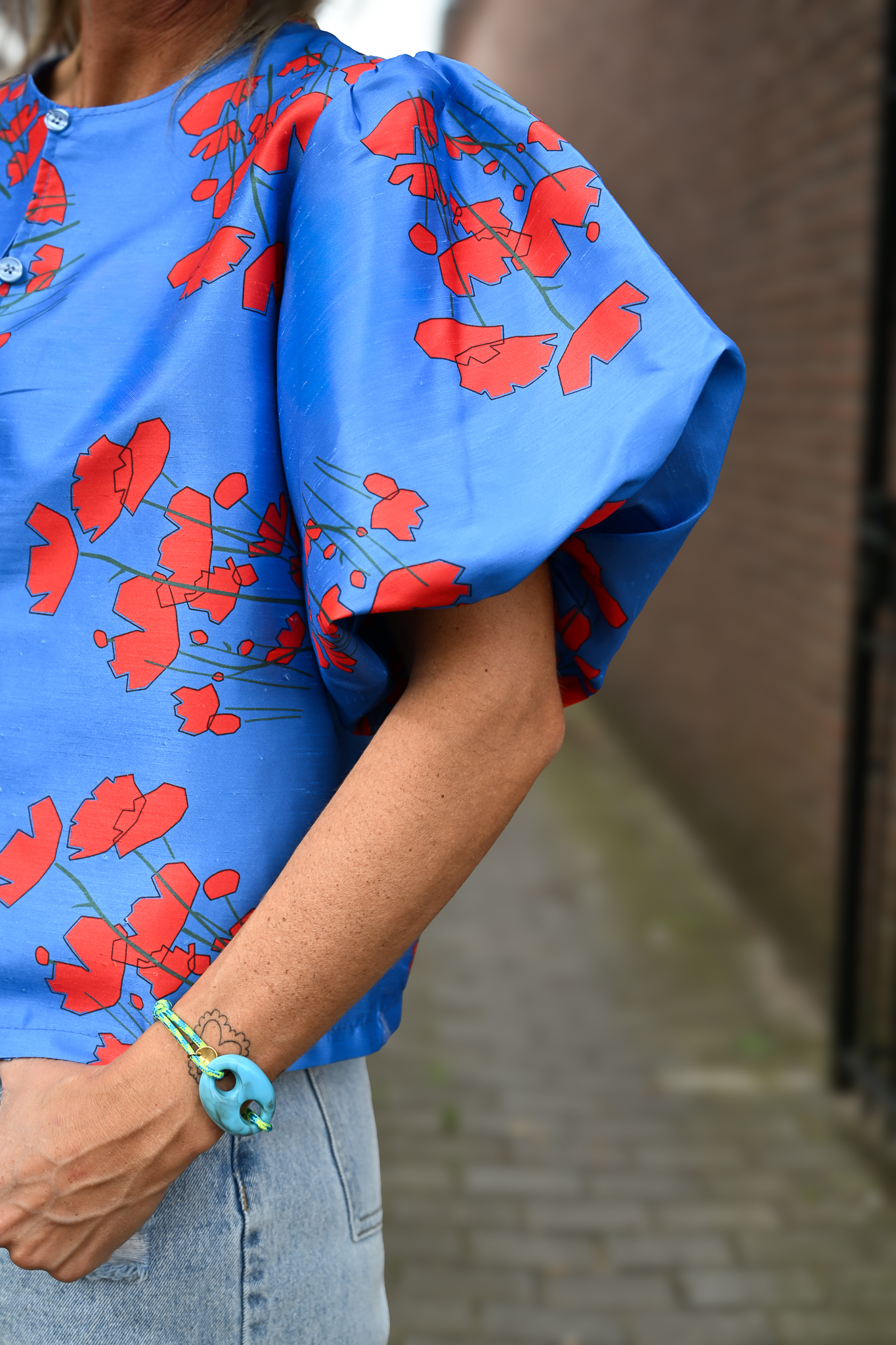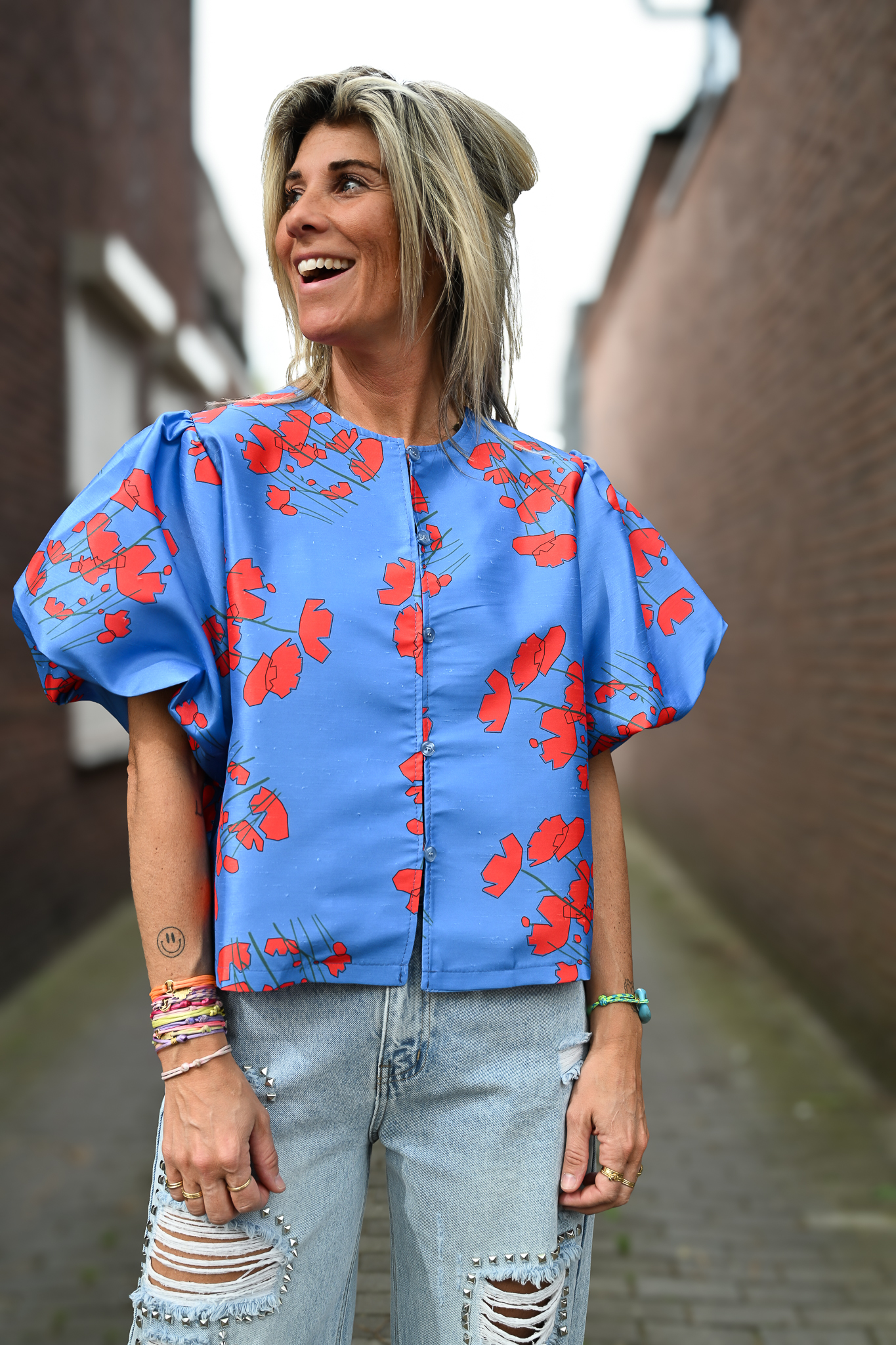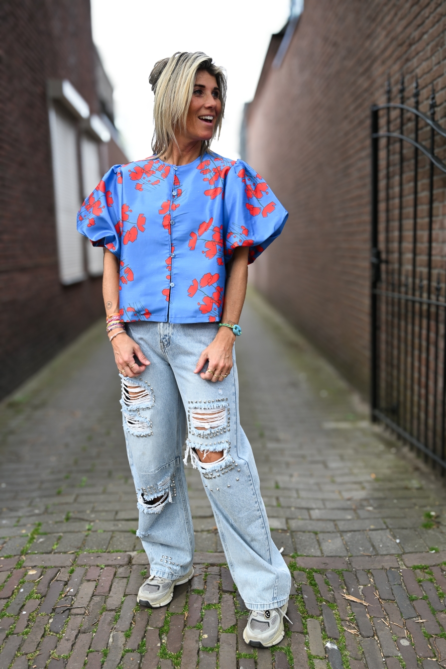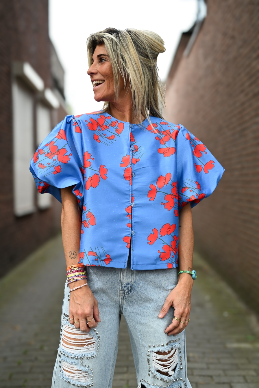 Deze prachtige top Asia heeft chique pofmouwtjes en 5 knoopjes aan de voorkant, afgewerkt met een subtiele lurexdraad voor een stijlvolle touch.