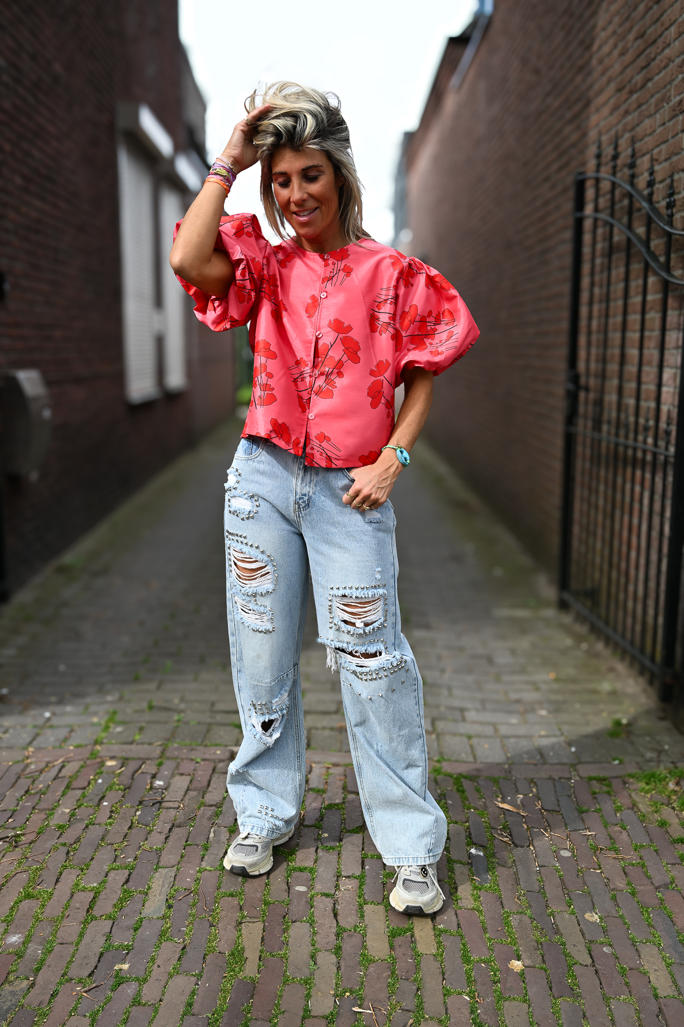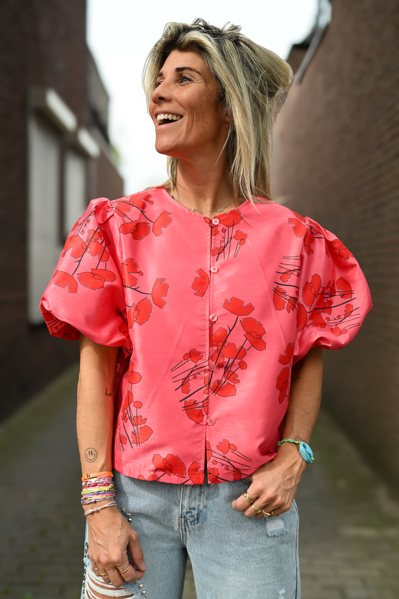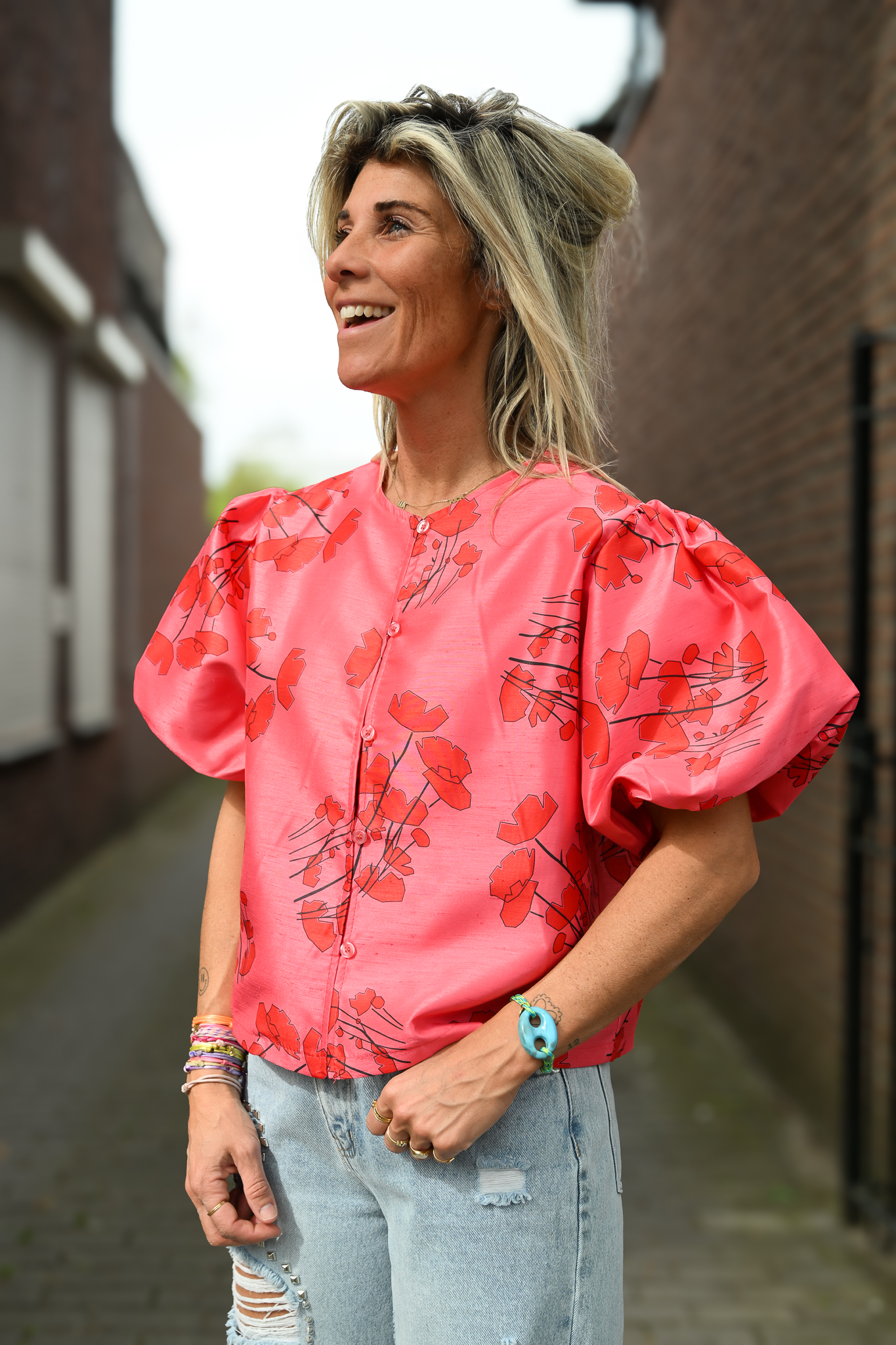 Deze prachtige top Asia heeft chique pofmouwtjes en 5 knoopjes aan de voorkant, afgewerkt met een subtiele lurexdraad voor een stijlvolle touch.