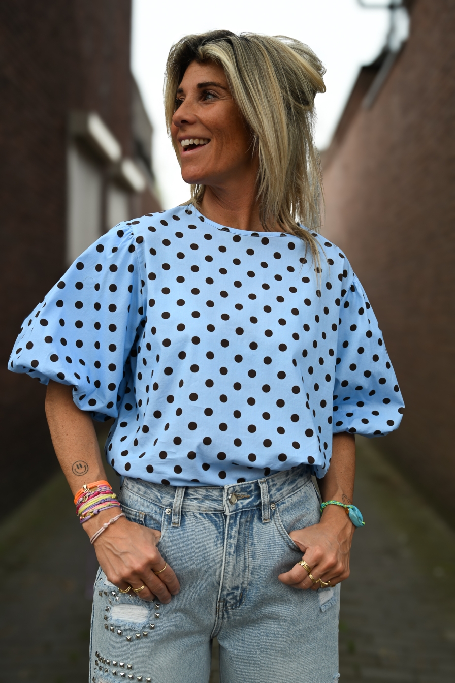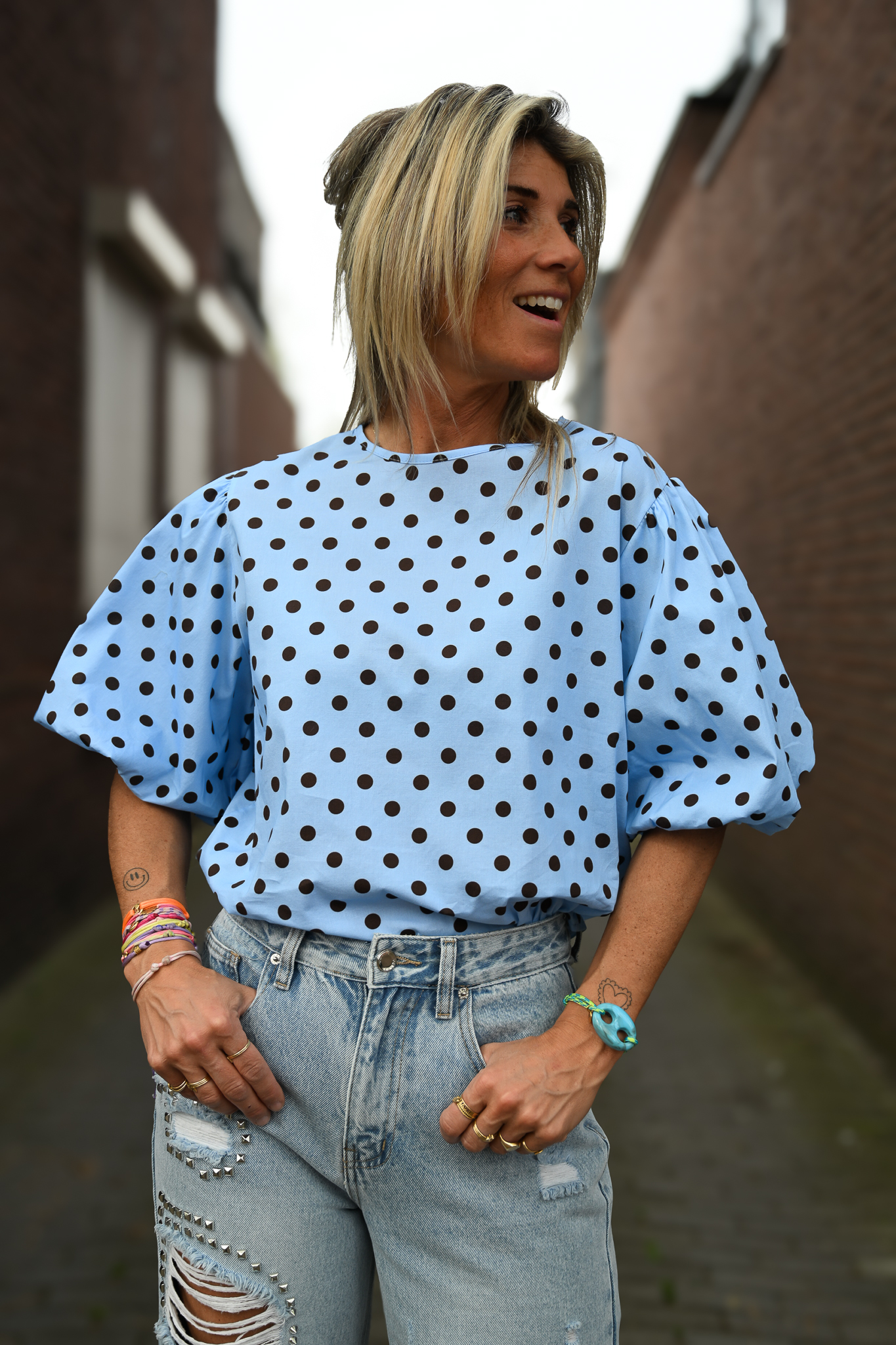 100% katoen luchtige top met knoopje in de nek en leuke pofmouwen. Onesize model geschikt t/m maat M/L.