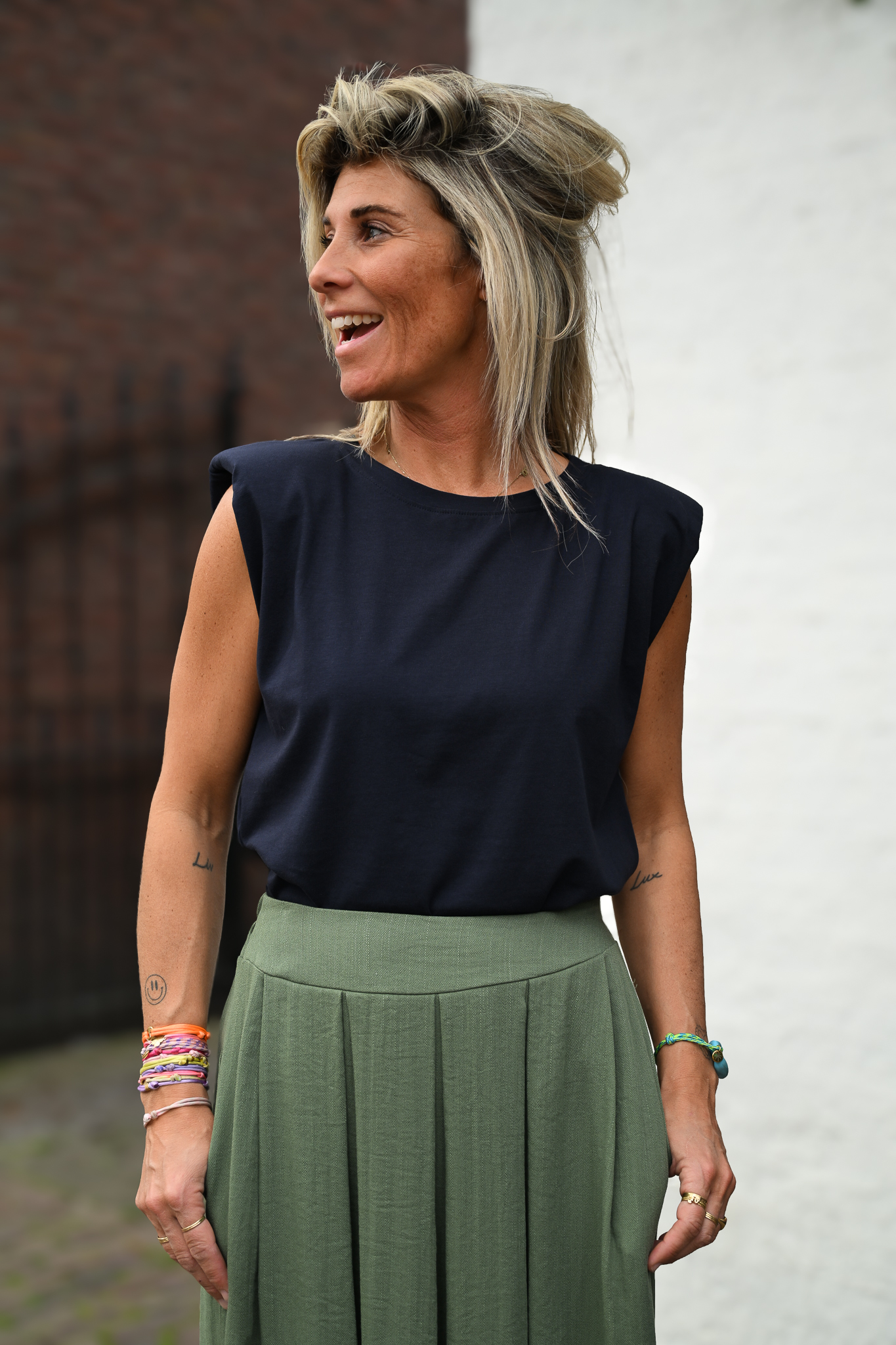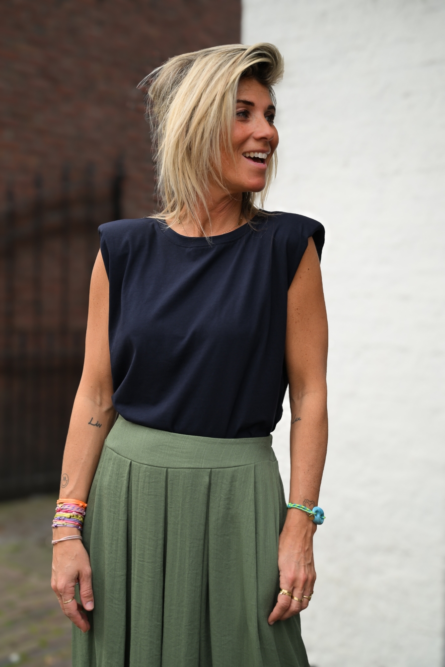 Top Elsa valt op door de schoudervulling en het kapmouwtje. Dit onesize model is draagbaar tot en met maat L/XL en gemaakt van 80% viscose,15% katoen en 5% elastane.