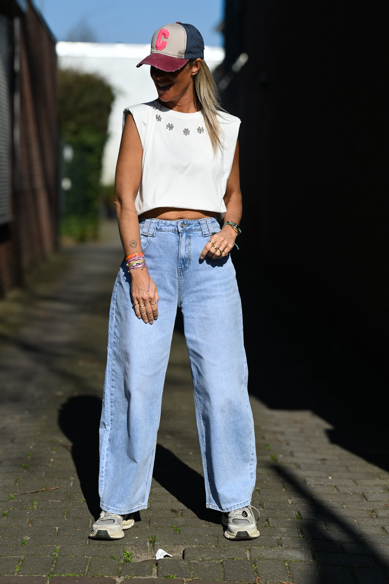 Top Frederique valt op door de schoudervulling, het kapmouwtje en de applicaties rond de hals. Ik draag op de foto maat S/M en deze topper is gemaakt van 100% katoen.
