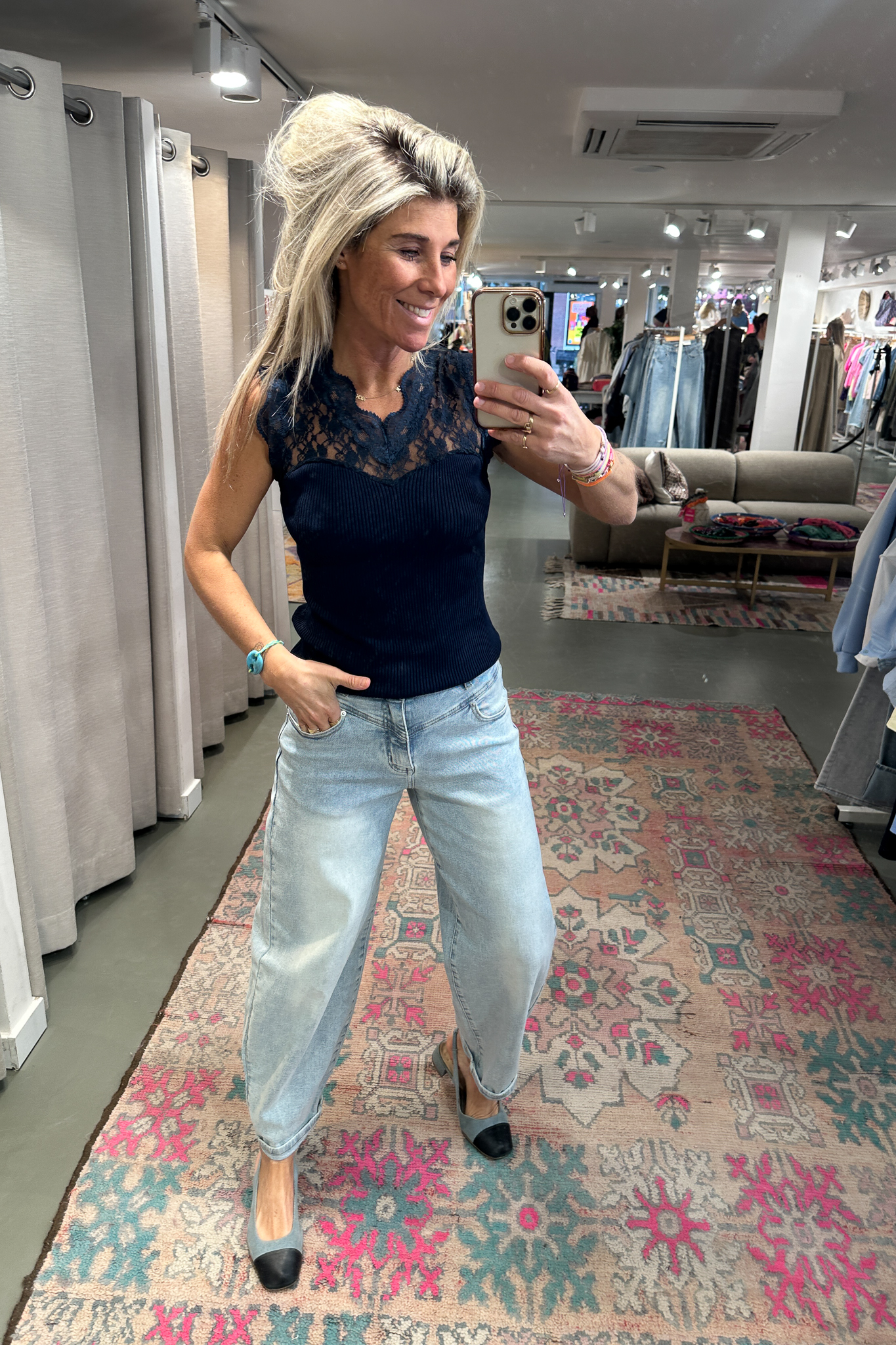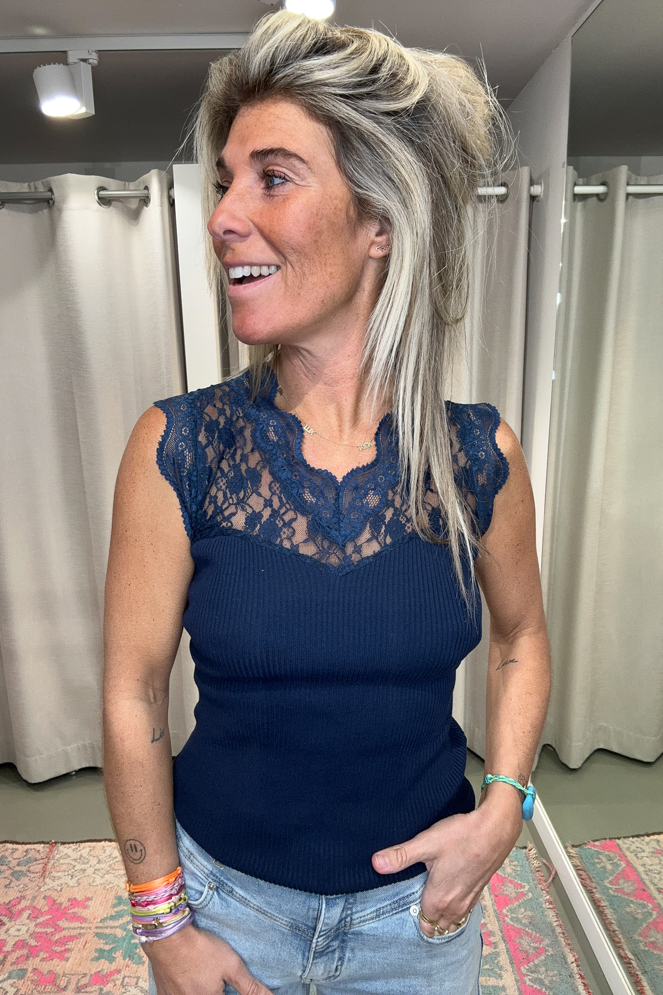 Top Lace Joy heeft een kanten bovenkant en een stretchy onderkant voor een perfecte pasvorm. De top is mooi afgewerkt en op de foto draag ik maat S/M, ik ben 1,76 m lang. Handig: je bh-bandje valt aan de achterkant onder de kantstrook, dus die is niet zichtbaar.