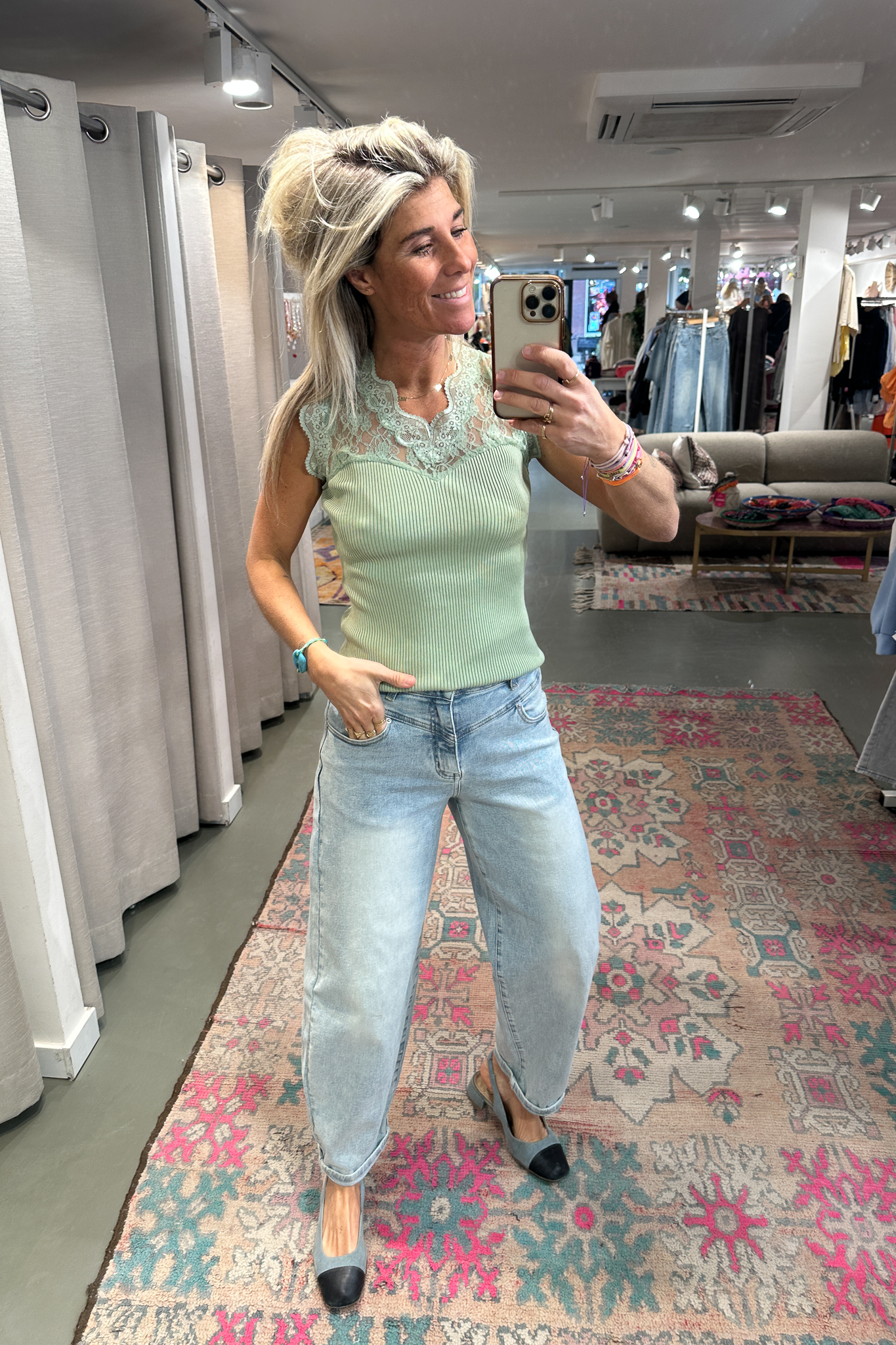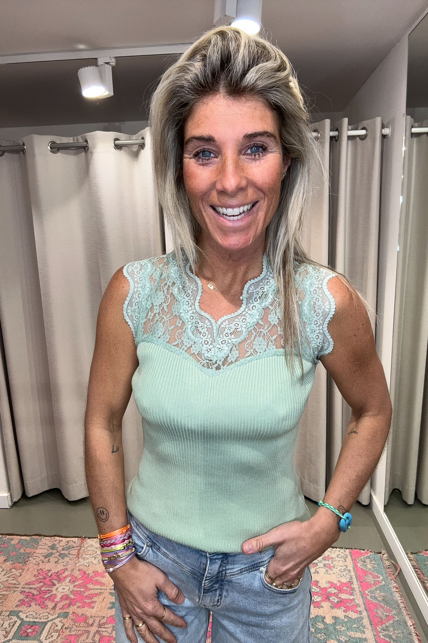 Top Lace Joy heeft een kanten bovenkant en een stretchy onderkant voor een perfecte pasvorm. De top is mooi afgewerkt en op de foto draag ik maat S/M, ik ben 1,76 m lang. Handig: je bh-bandje valt aan de achterkant onder de kantstrook, dus die is niet zichtbaar.