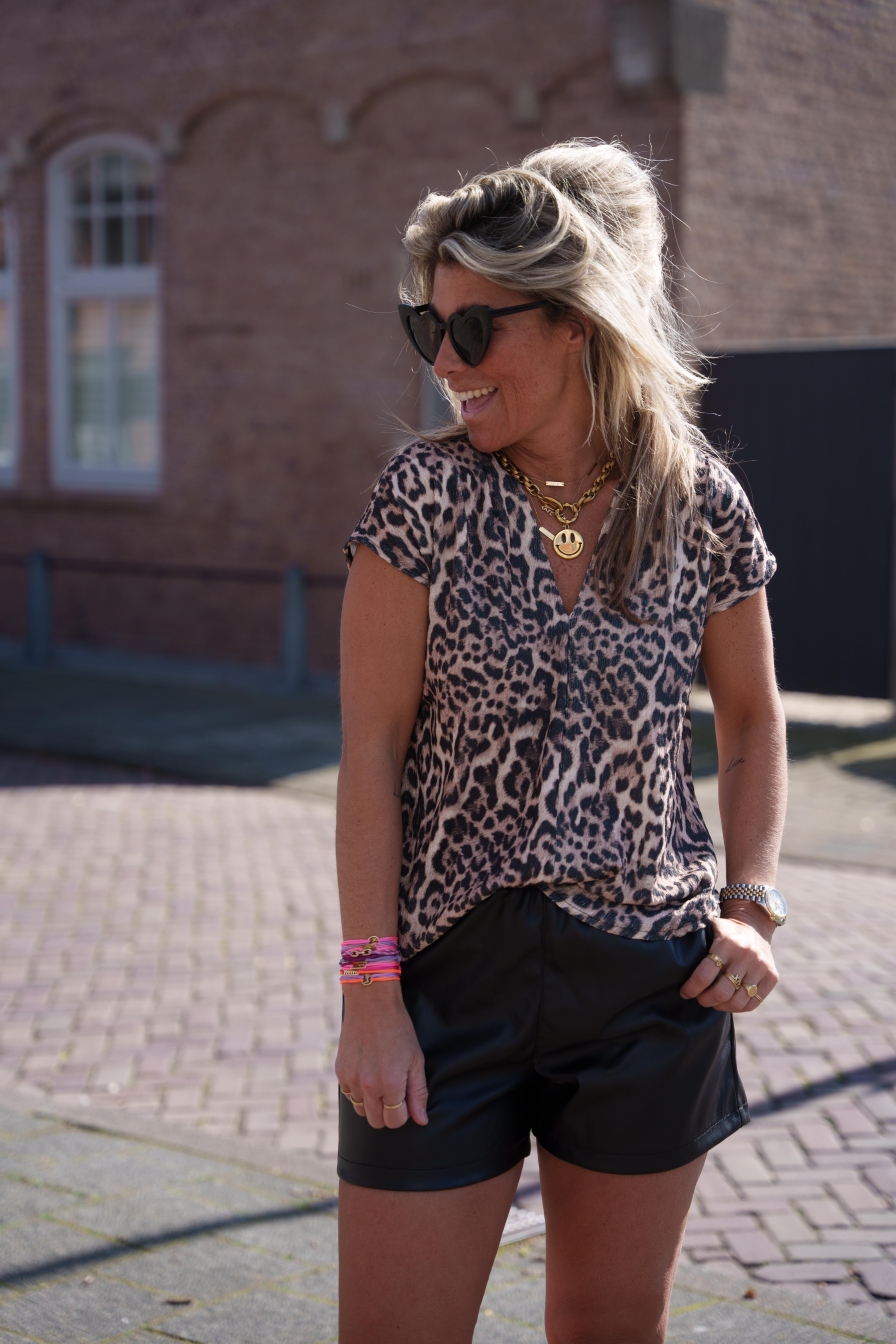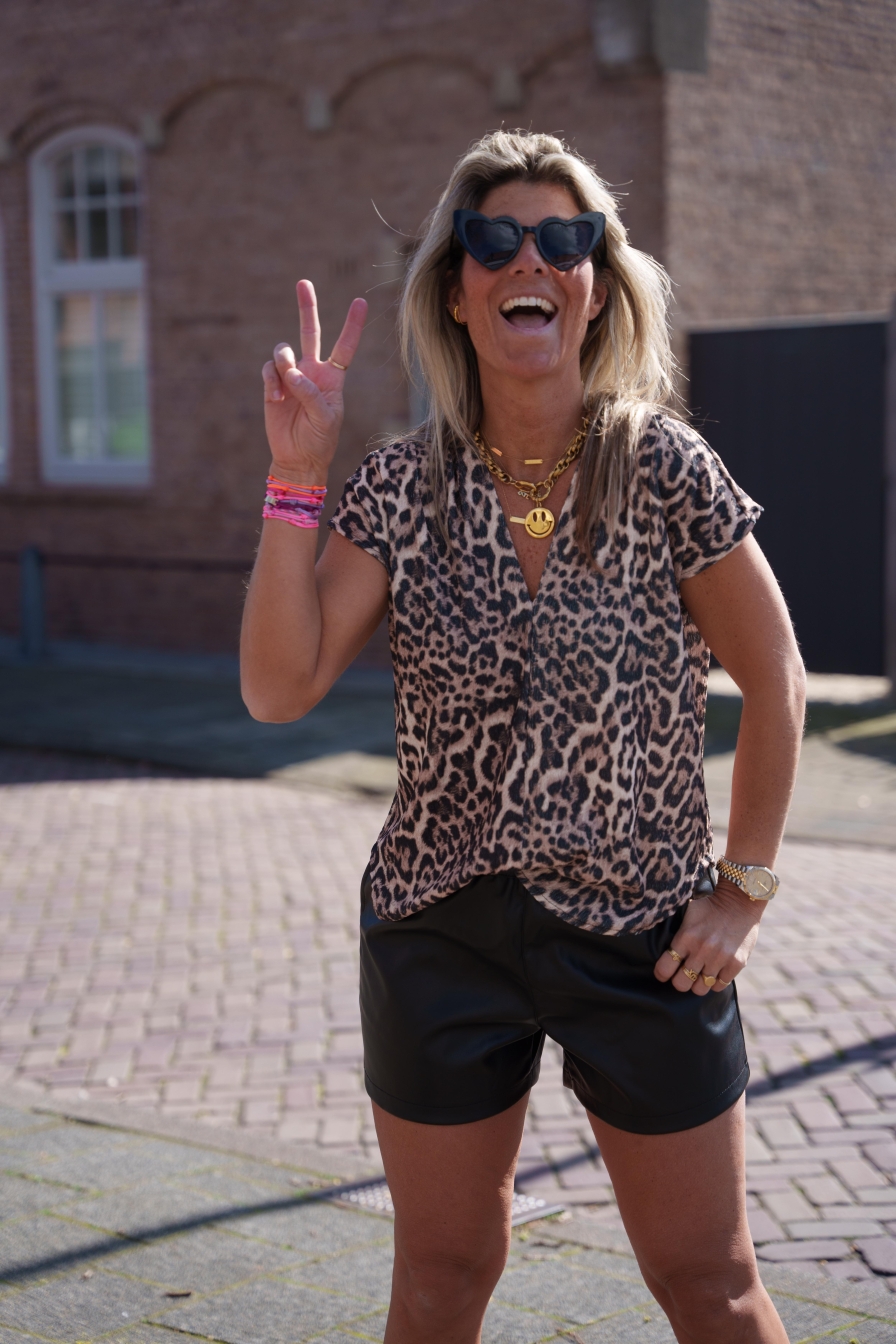 Luchtige shirt met v-hals in panterprint! De kapmouwen geven een speels accent aan dit trendy item. Ons onesize model past perfect...