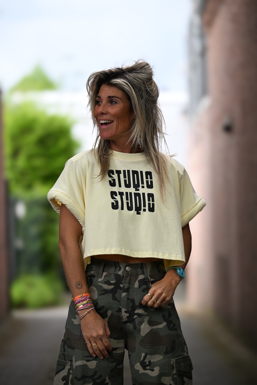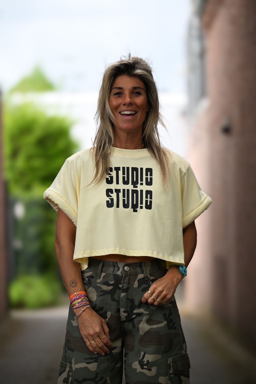 Gave cropped tee met “studio studio” op de voorkant, 100% katoen en met opgerolde kapmouwtjes. Let’s go!