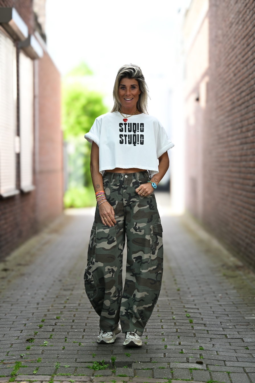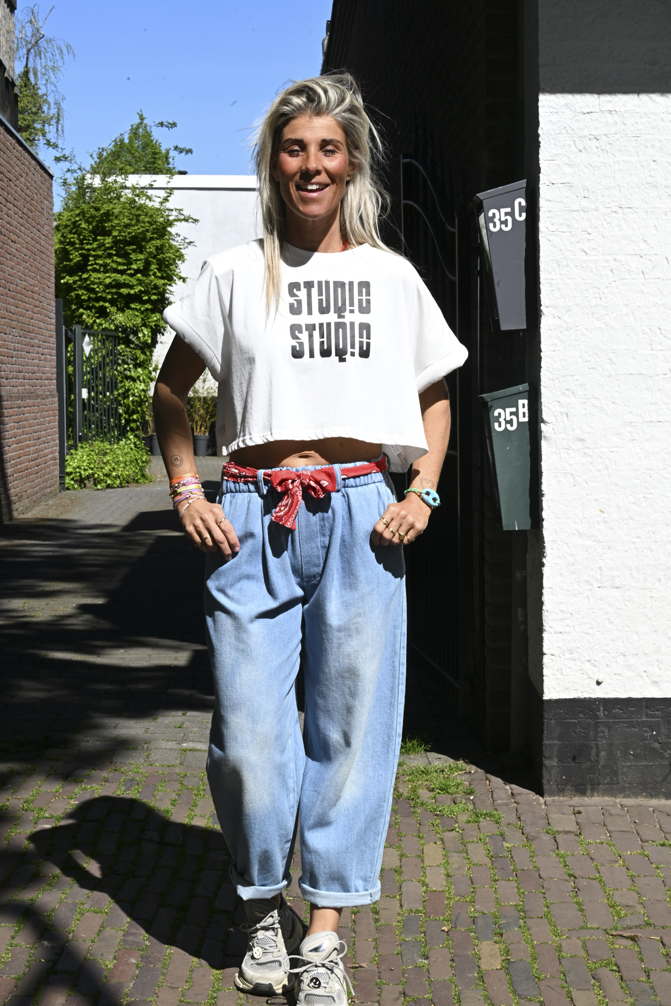 Gave cropped tee met “studio studio” op de voorkant, 100% katoen en met opgerolde kapmouwtjes. Let’s go!