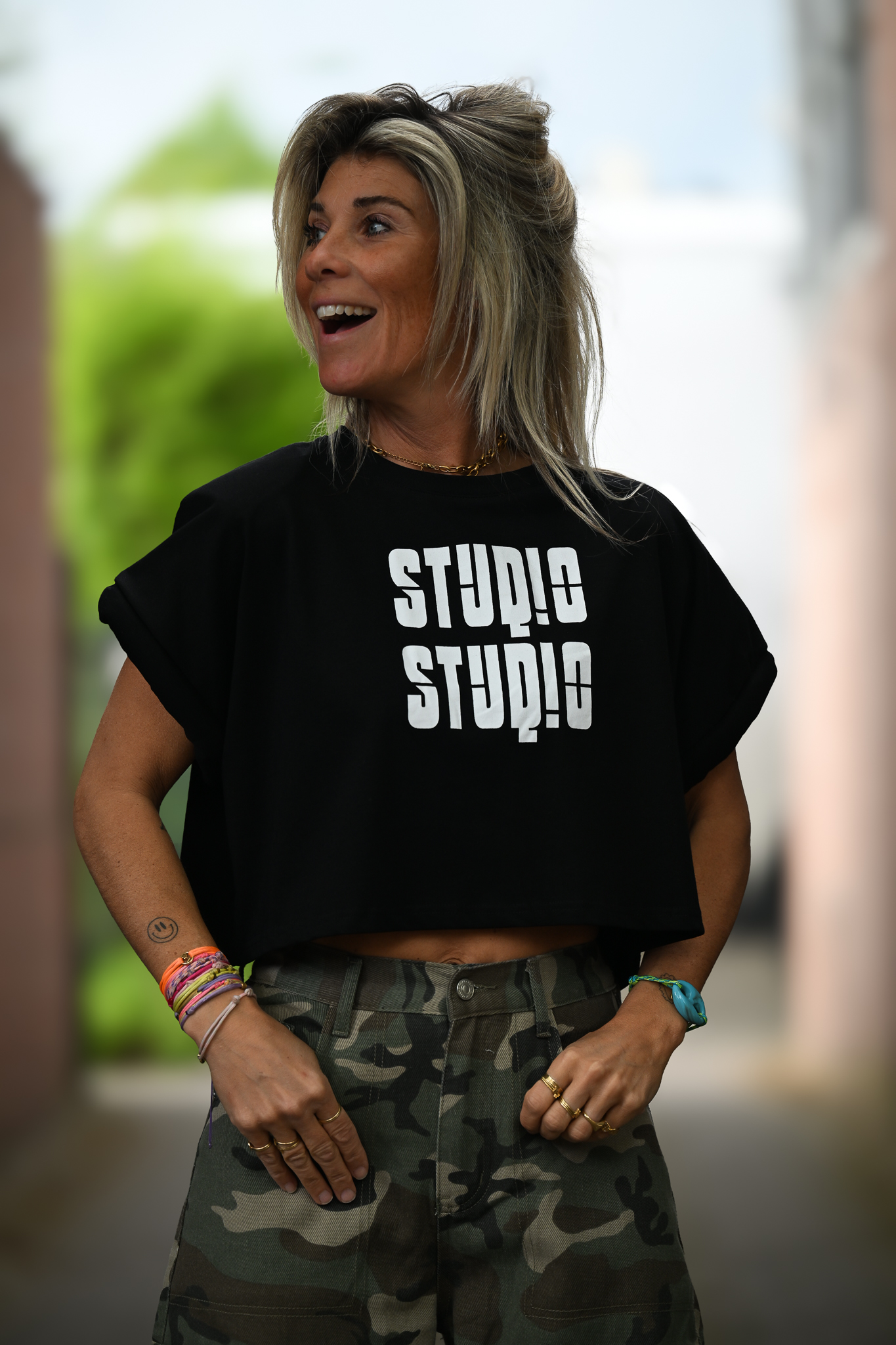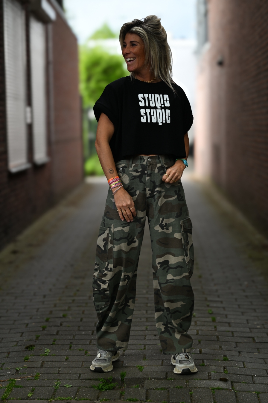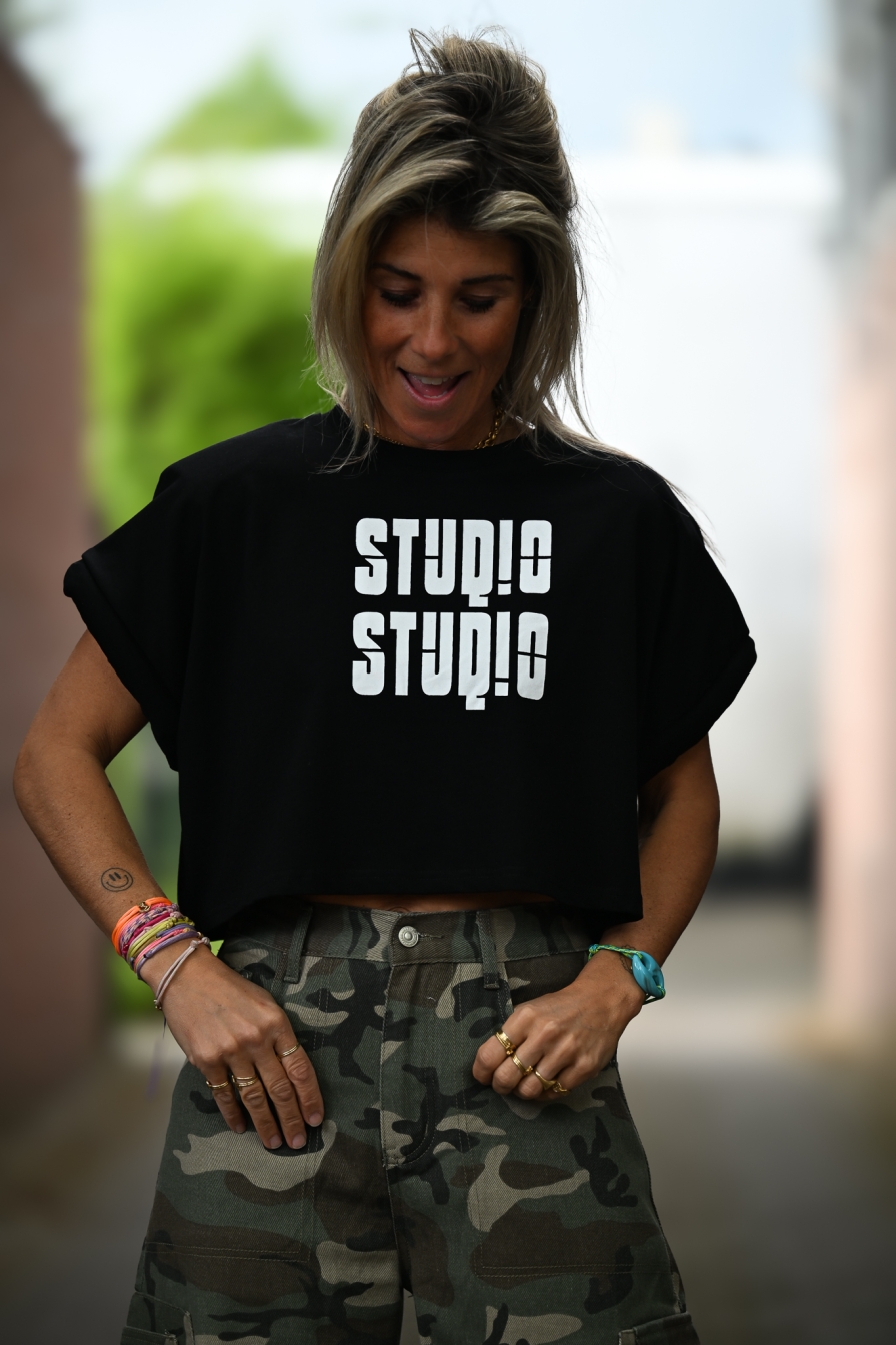 Gave cropped tee met “studio studio” op de voorkant, 100% katoen en met opgerolde kapmouwtjes. Let’s go!
