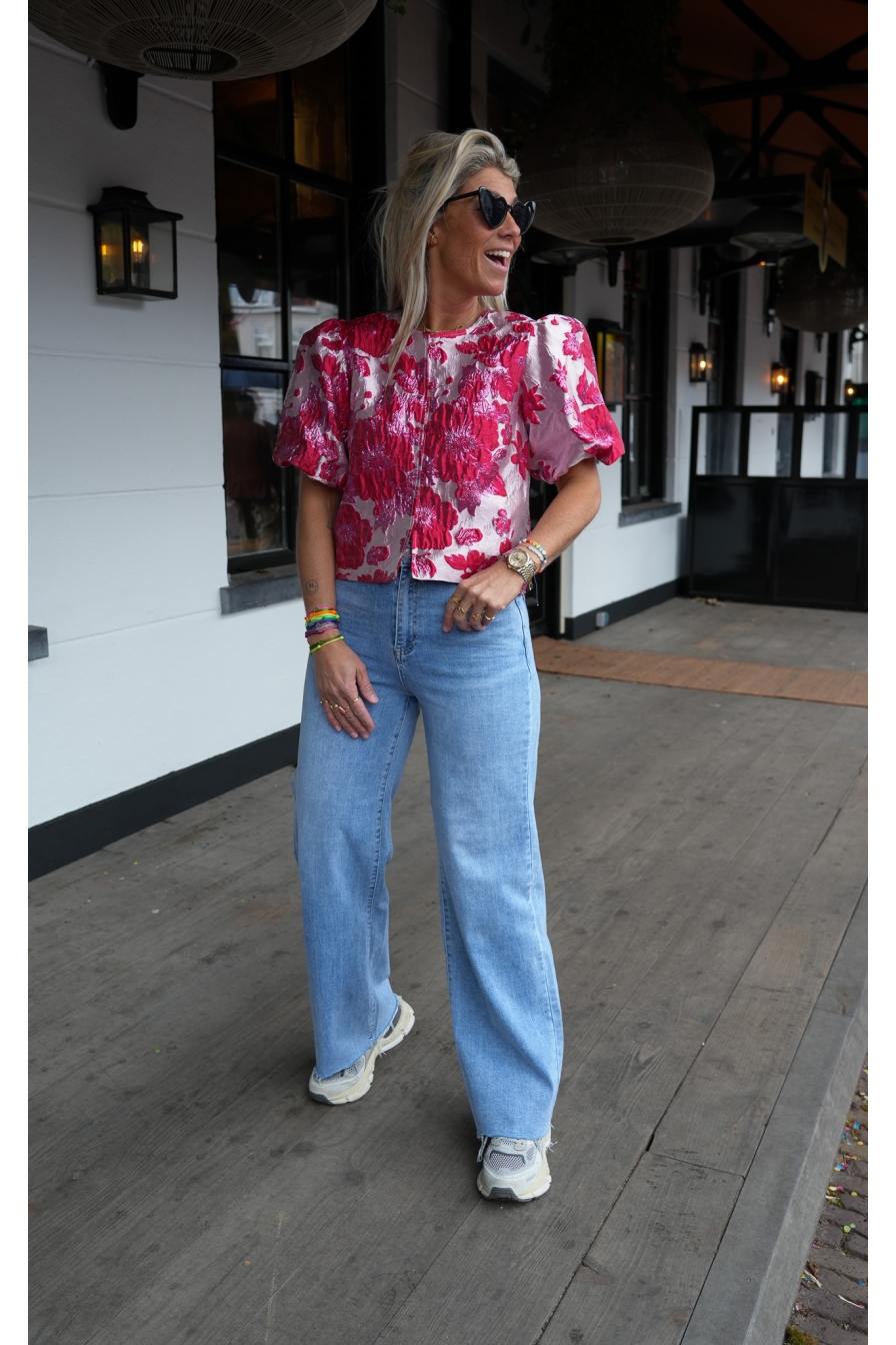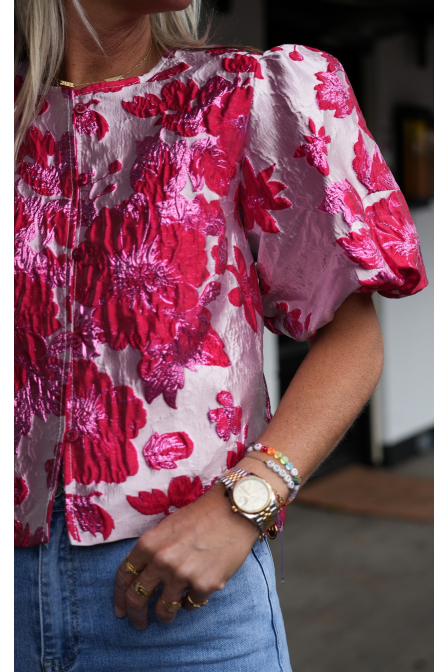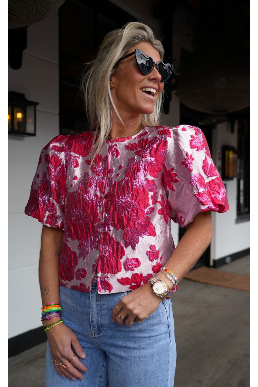 Deze prachtige top Sunee heeft chique pofmouwtjes en 5 knoopjes aan de voorkant en afgewerkt met een subtiele gouden lurexdraad voor...