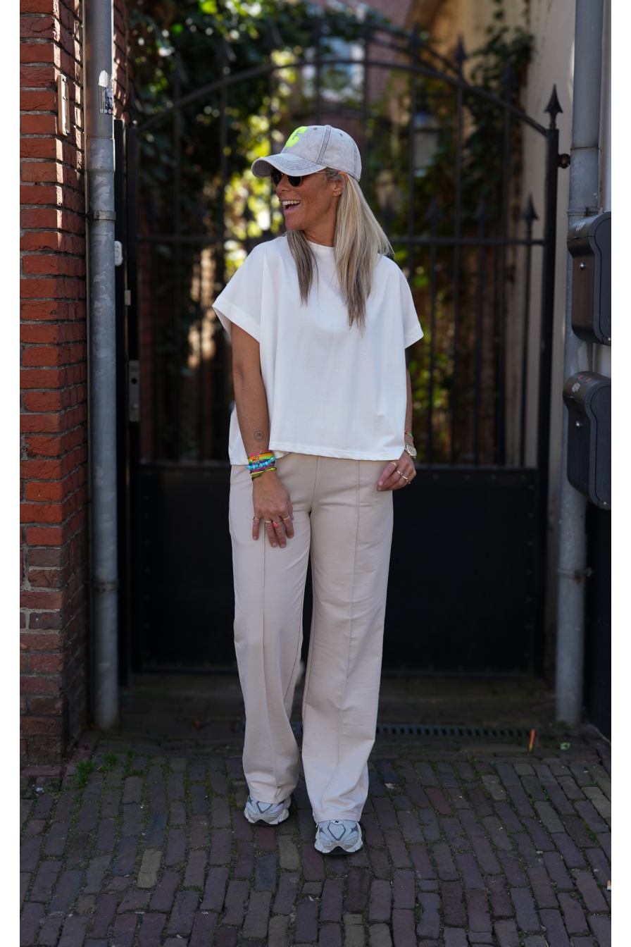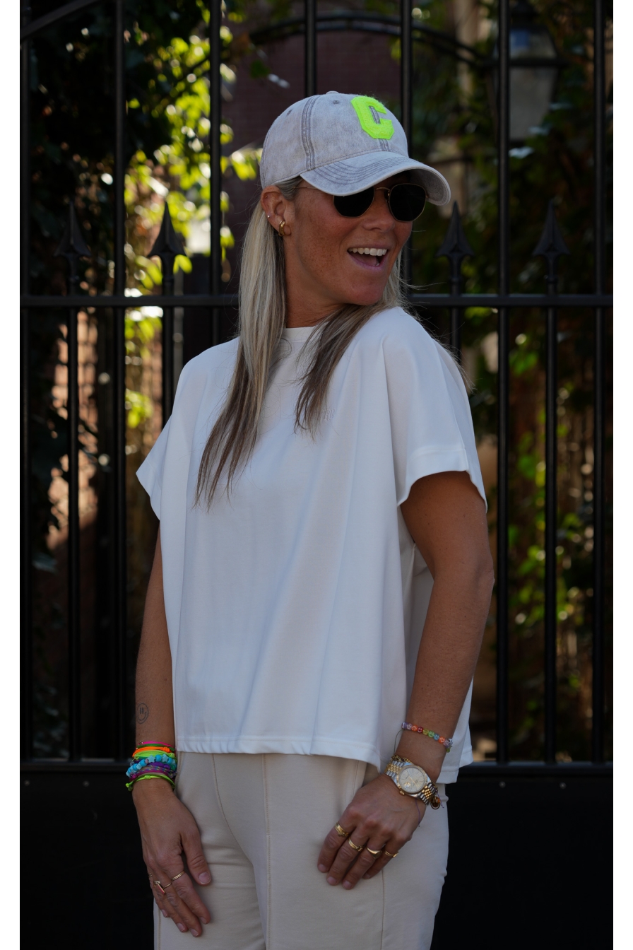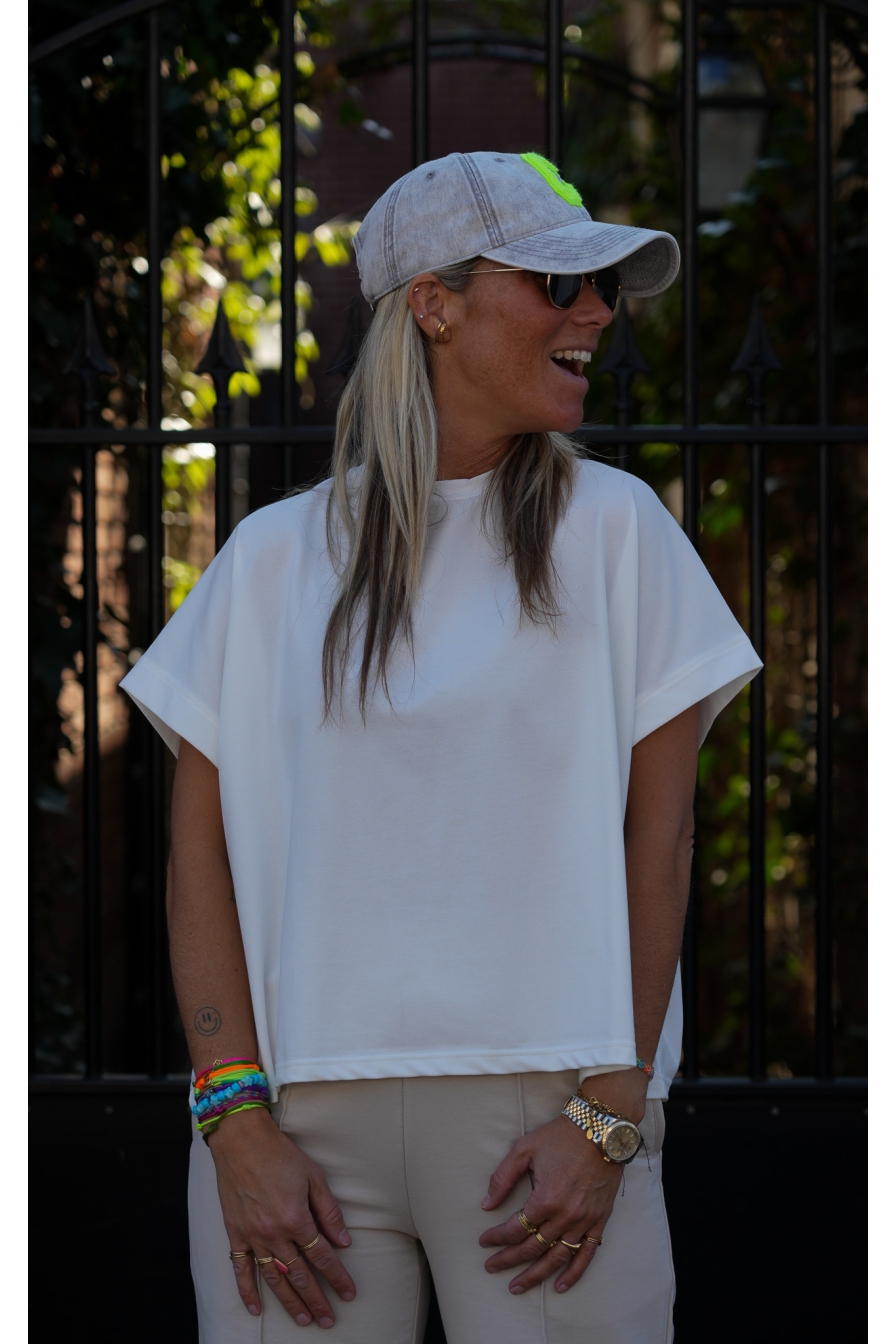 Deze wijde top met kapmouwtjes en een ronde hals is gemaakt van 75% katoen, waardoor hij heerlijk luchtig draagt. Het model valt goed op maat. Op de foto draag ik maat M (ik ben 1.76m lang).