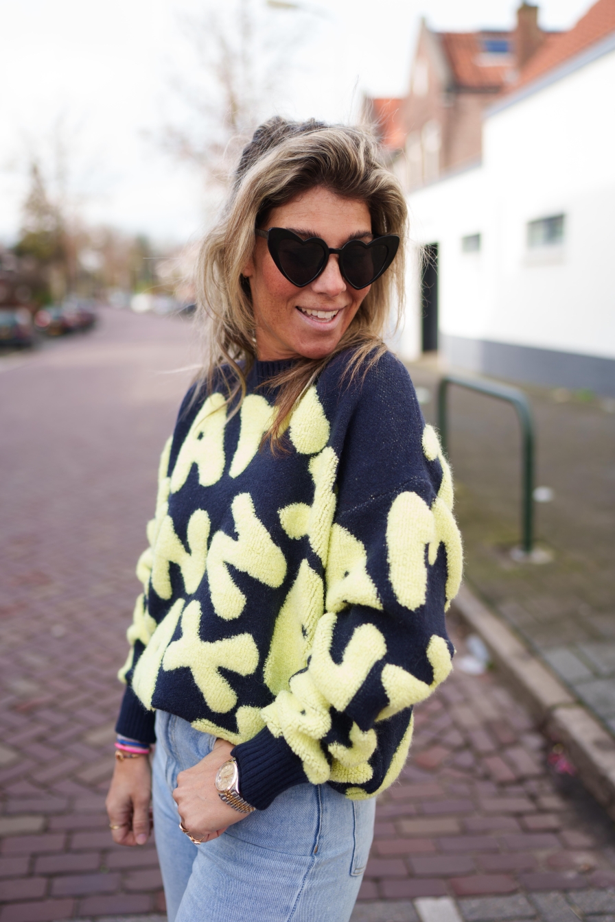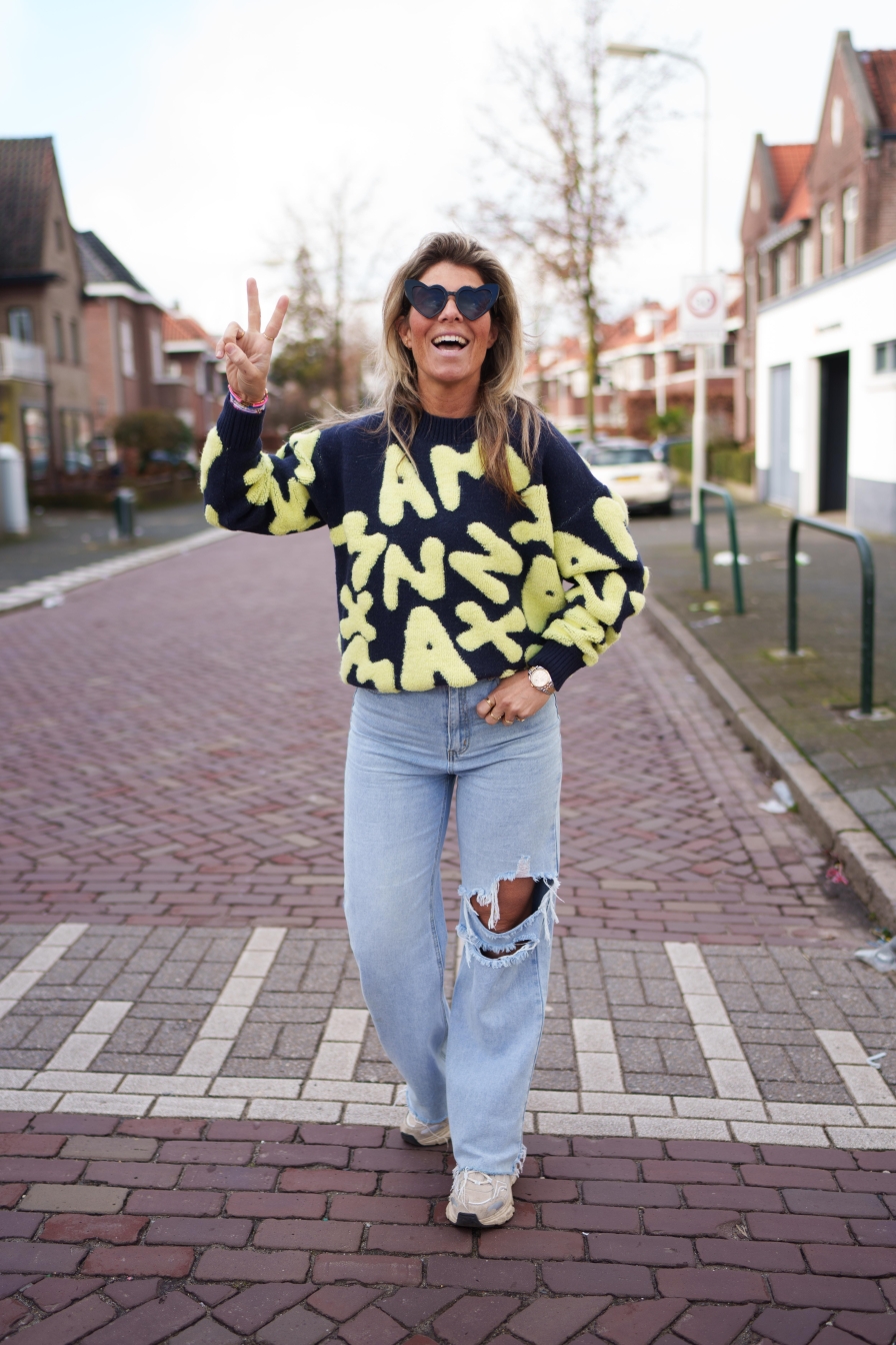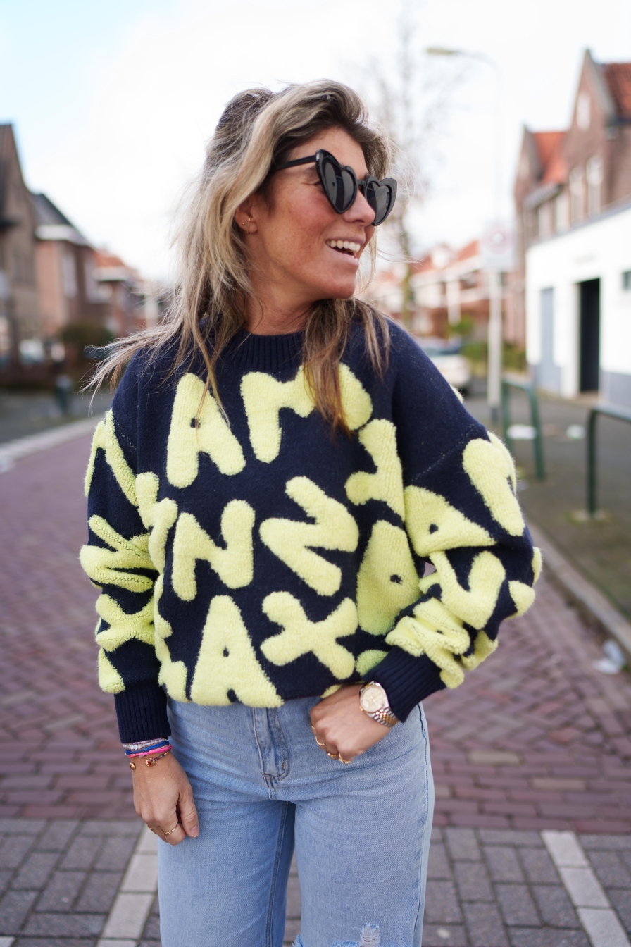 Donker blauwe trui met gele letters van badstof, vervaardigd uit 55% katoen! De letters A, M, N en X voegen een speelse en trendy touch...