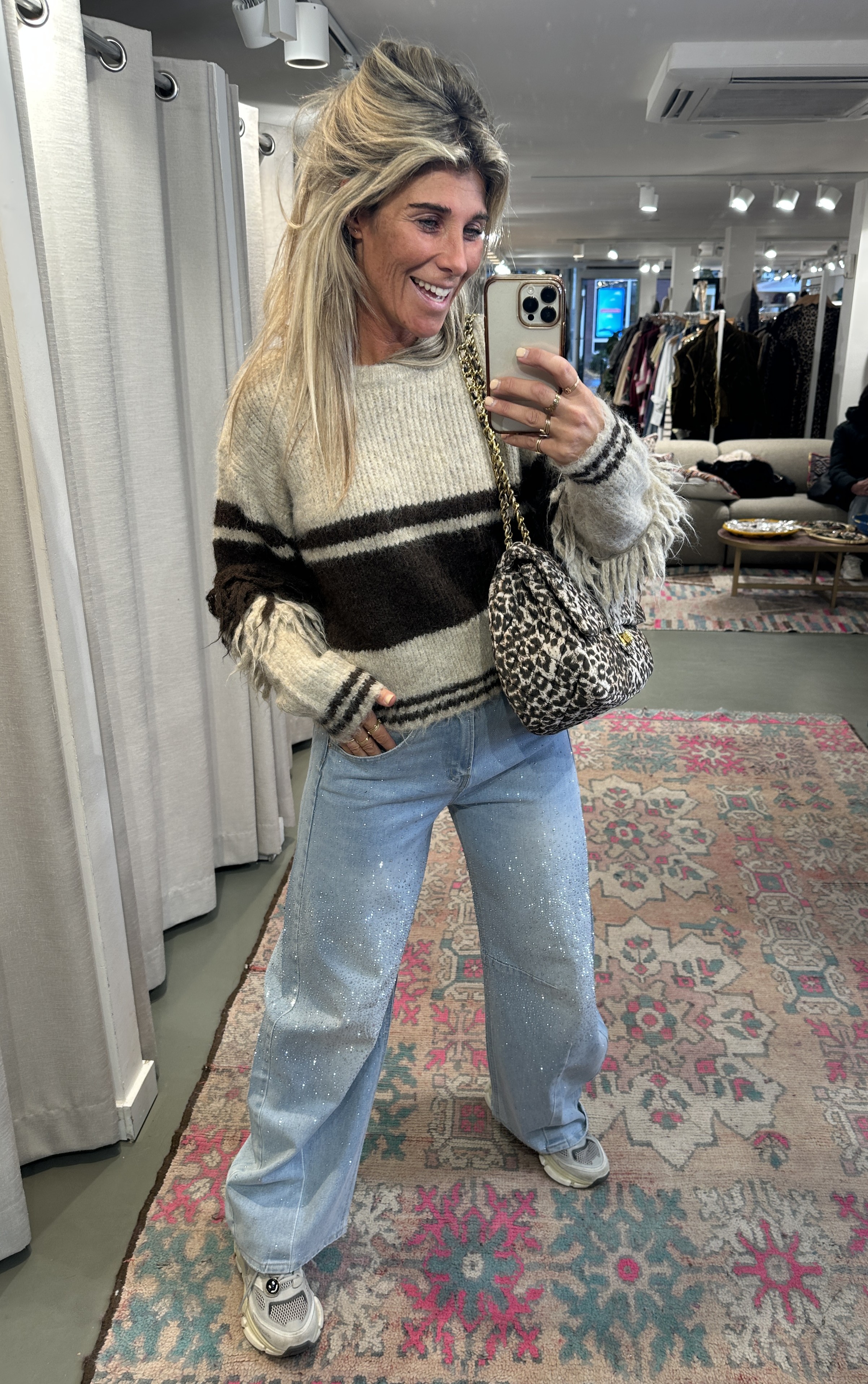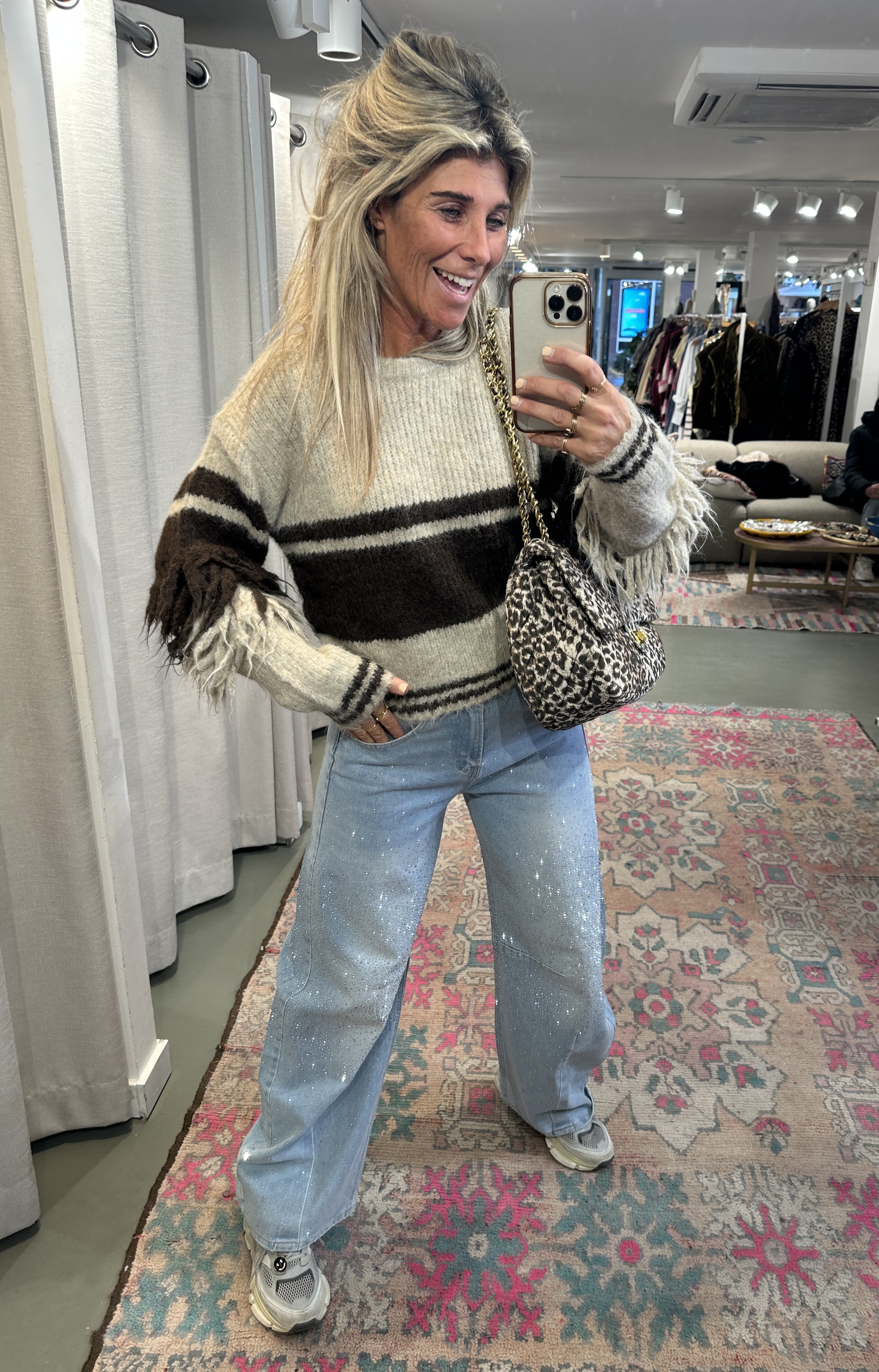 Stop met zoeken, deze trui met flosjes aan de mouwen wil je hebben. Zacht, warm en comfy tegelijk. Bevat 8% wol, maar jeukt echt niet....
