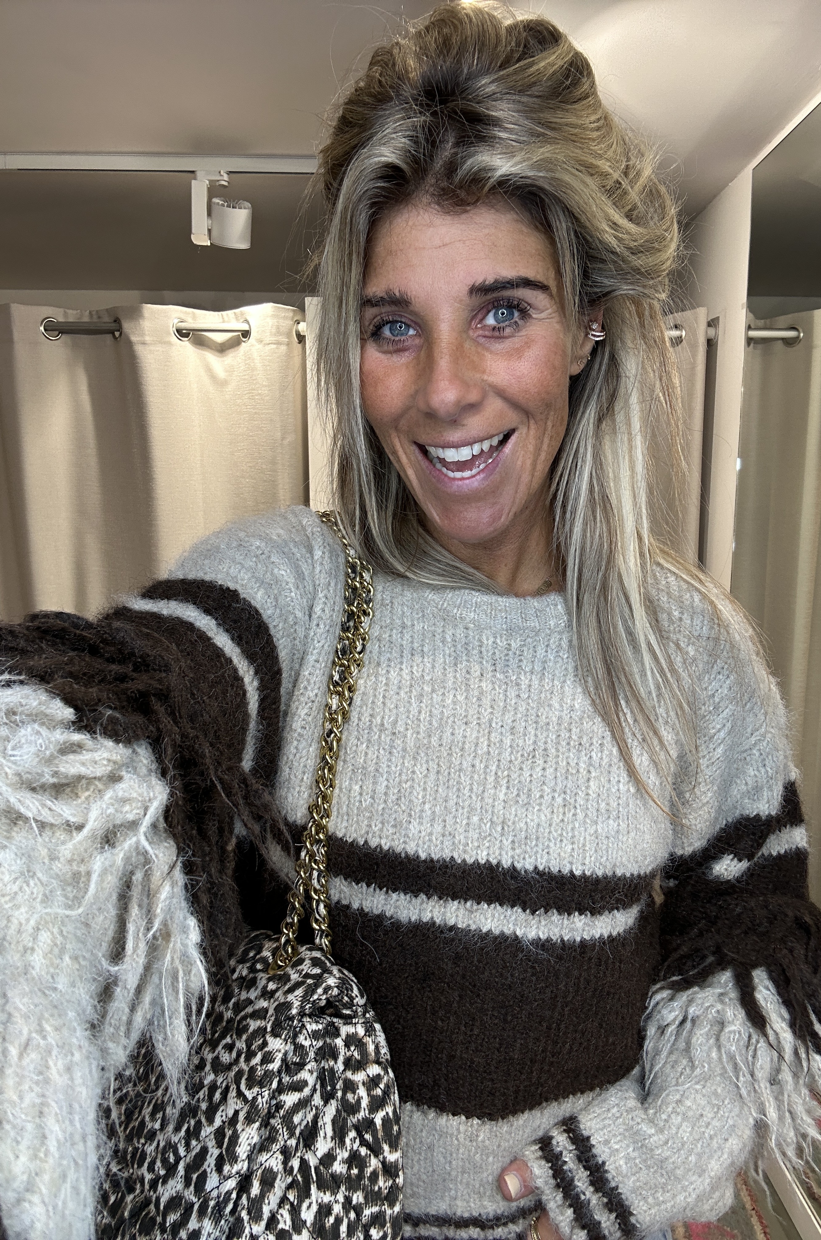 Stop met zoeken, deze trui met flosjes aan de mouwen wil je hebben. Zacht, warm en comfy tegelijk. Bevat 8% wol, maar jeukt echt niet. Op de foto draag ik maat S/M.
