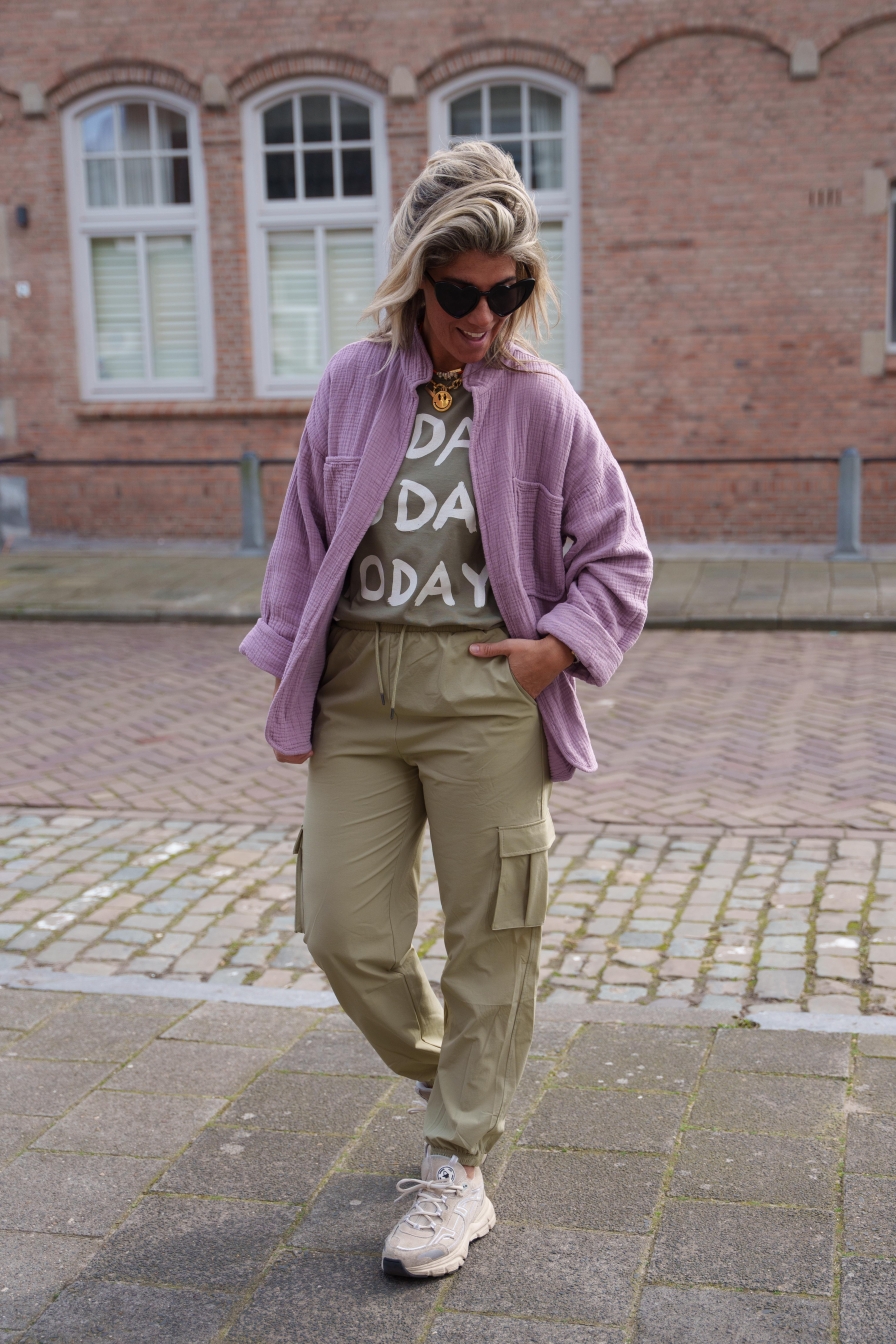 Military groen onesize shirt van 100% Katoen, met aan de voorkant de tekst 4x "today" en op de achterkant 4x "sorry" ! Een unieke en expressieve toevoeging aan je outfit.