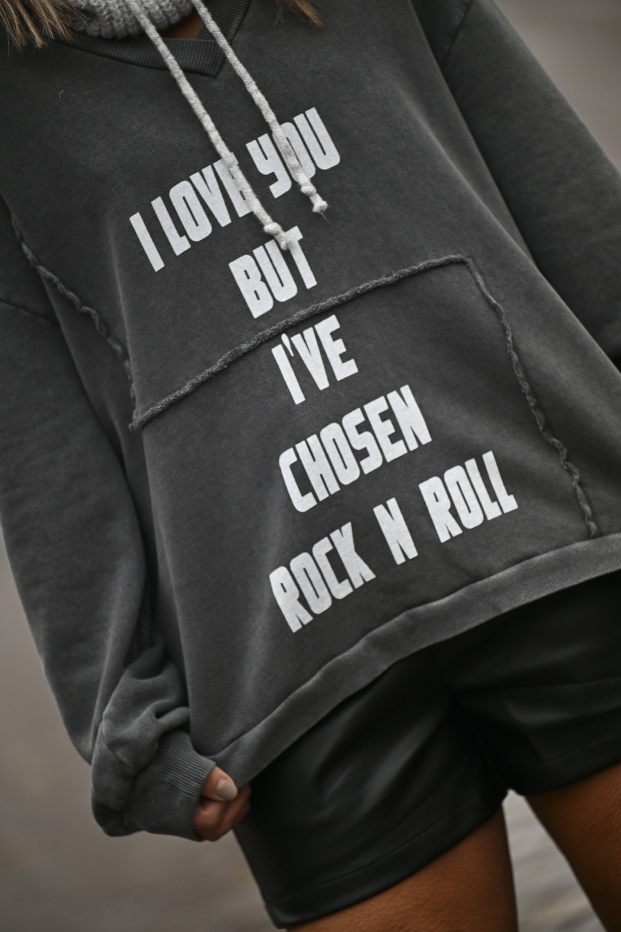 Oversized Onesize sweater met V-hals en streetstyle naden. Met de tekst “I love you but I’ve chosen Rock N Roll” – statement vibes. Draagbaar t/m maat XL