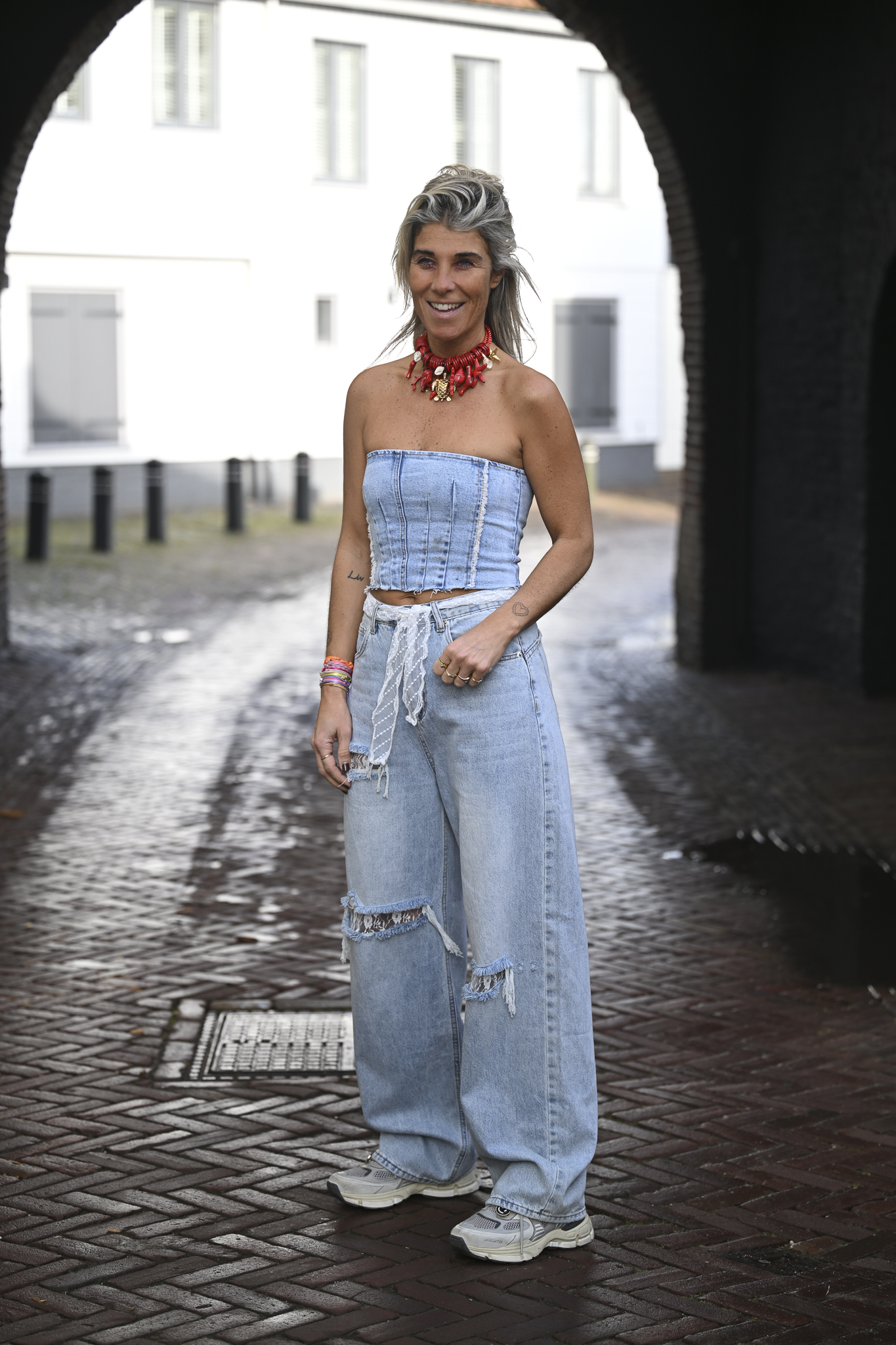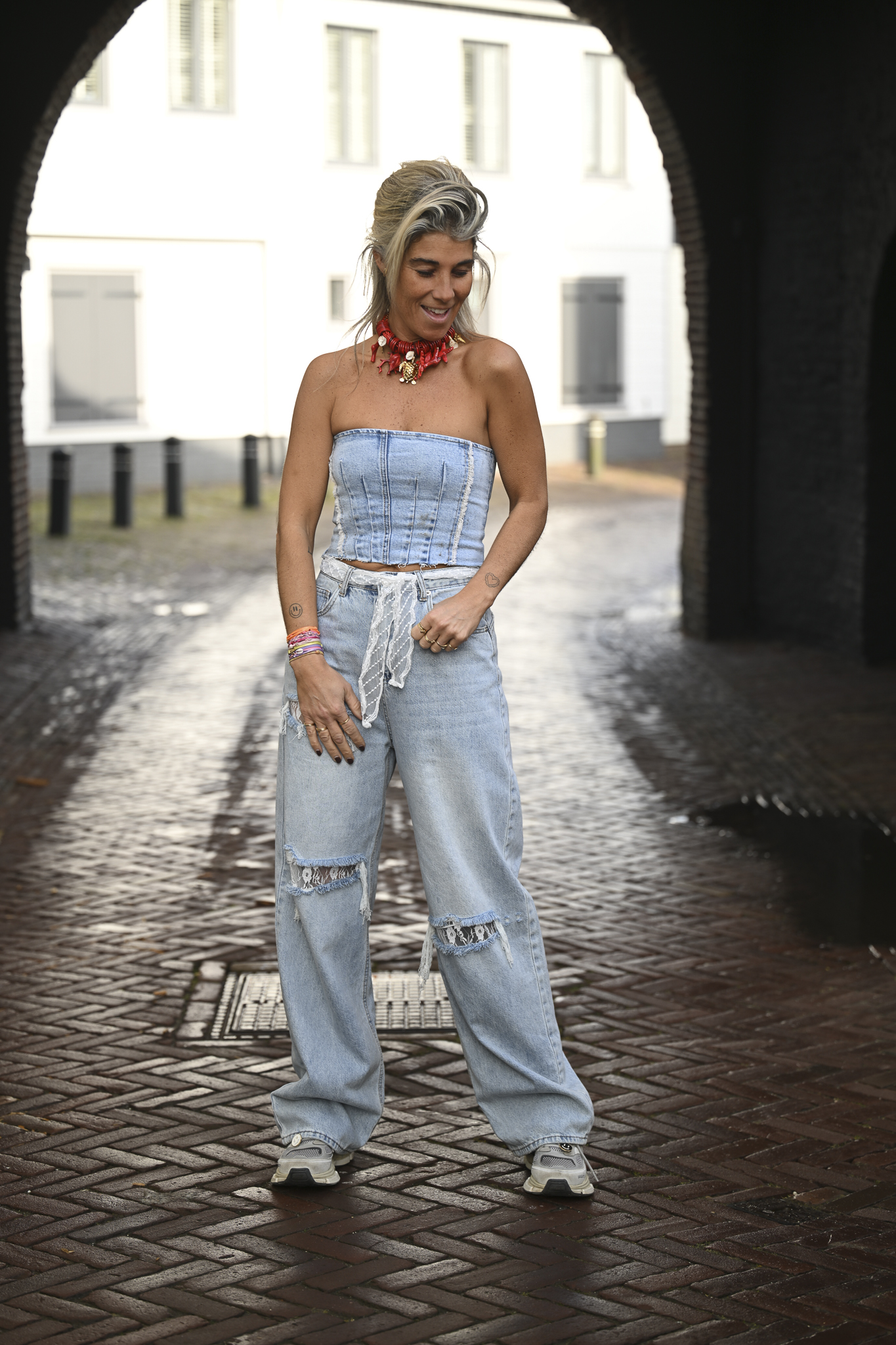 Wat een jeans is dit! De kenmerken: destroyed met drie scheuren, afgewerkt met een lace-strook, en inclusief een bijpassend centuurtje van dezelfde lace-stof. Wide-leg model. Op de foto draag ik maat M en ben ik 1,76 m lang.